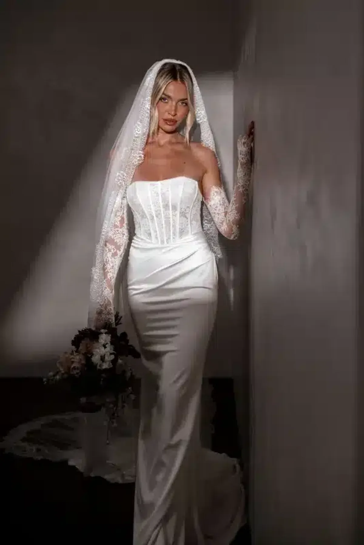 Wir sind völlig besessen von dieser luxuriösen neuen Kombination aus Satin und Spitze – sie passt wie ein Traum und schmeichelt auf die richtige Art und Weise, während sie dem charakteristischen MWL-Look und -Gefühl, das wir lieben, treu bleibt! Die moderne Miederform und die Spitzendetails sorgen für ein romantisches Element, das nahtlos mit dem perfekten Rock gepaart ist, der dir schmeichelt und sich mit dir bewegt und eine anmutige, figurbetonte Form bietet, in der du dich einfach umwerfend fühlen wirst. Befestige die abnehmbare Schleppe an der Seite für die Braut, die einen zusätzlichen Hauch von Detail wünscht.