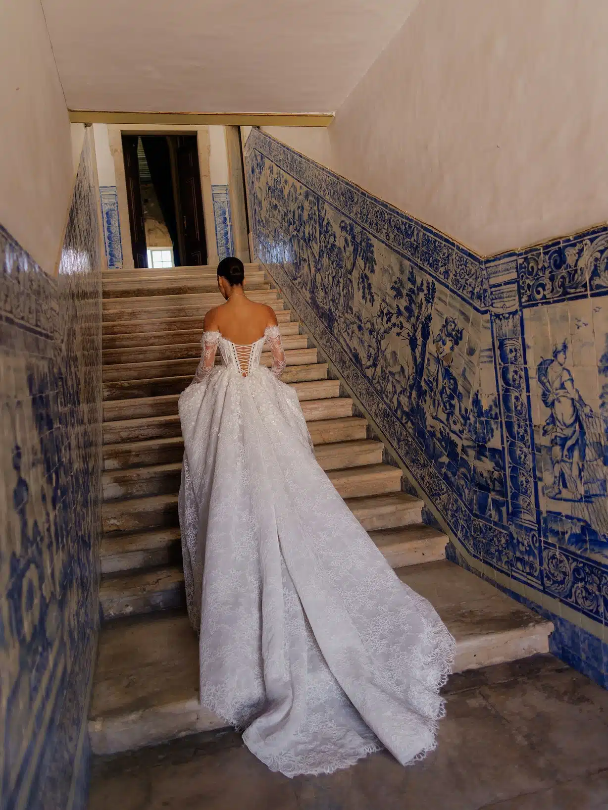 Detailliertes Kleid mit sanftem, tiefem Ausschnitt. Der voluminöse Guipure-Rock wird durch ein eng anliegendes, fest strukturiertes Korsettoberteil mit Perlenverzierung, Schnürung am Rücken und eleganten Spitzenlangenärmeln ausgeglichen.