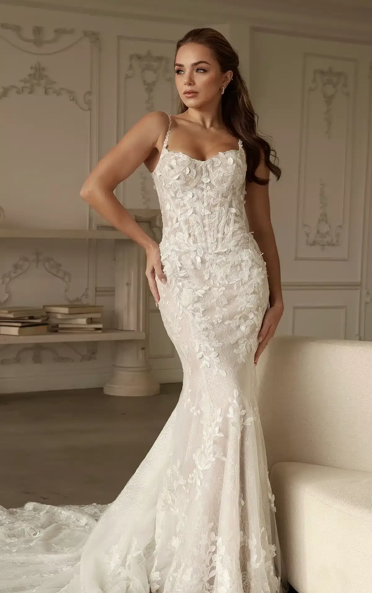 Das Modell 1891 mit seiner wunderschönen Blumenspitze und den zarten 3D-Blüten ist ein wahrer Traum. Von perlenbesetzten Spaghetti-Trägern führt ein herzförmiger Ausschnitt zu einem transparenten Korsett-Oberteil mit funkelndem Glitzertüll unterhalb der romantischen 3D-Blumenmuster. Dieses sexy, figurbetonte Hochzeitskleid schmiegt sich an die Figur und betont die natürliche Sanduhr-Silhouette mit einer Basken-Taille, bevor es sanft über die Hüften in einen eleganten Trompeten-Rock und eine ausladende Schleppe mit floralen Spitzen-Applikationen übergeht. Dieses edle, romantische und rundum schimmernde Couture-Hochzeitskleid ist wie geschaffen für die glamouröse Braut.