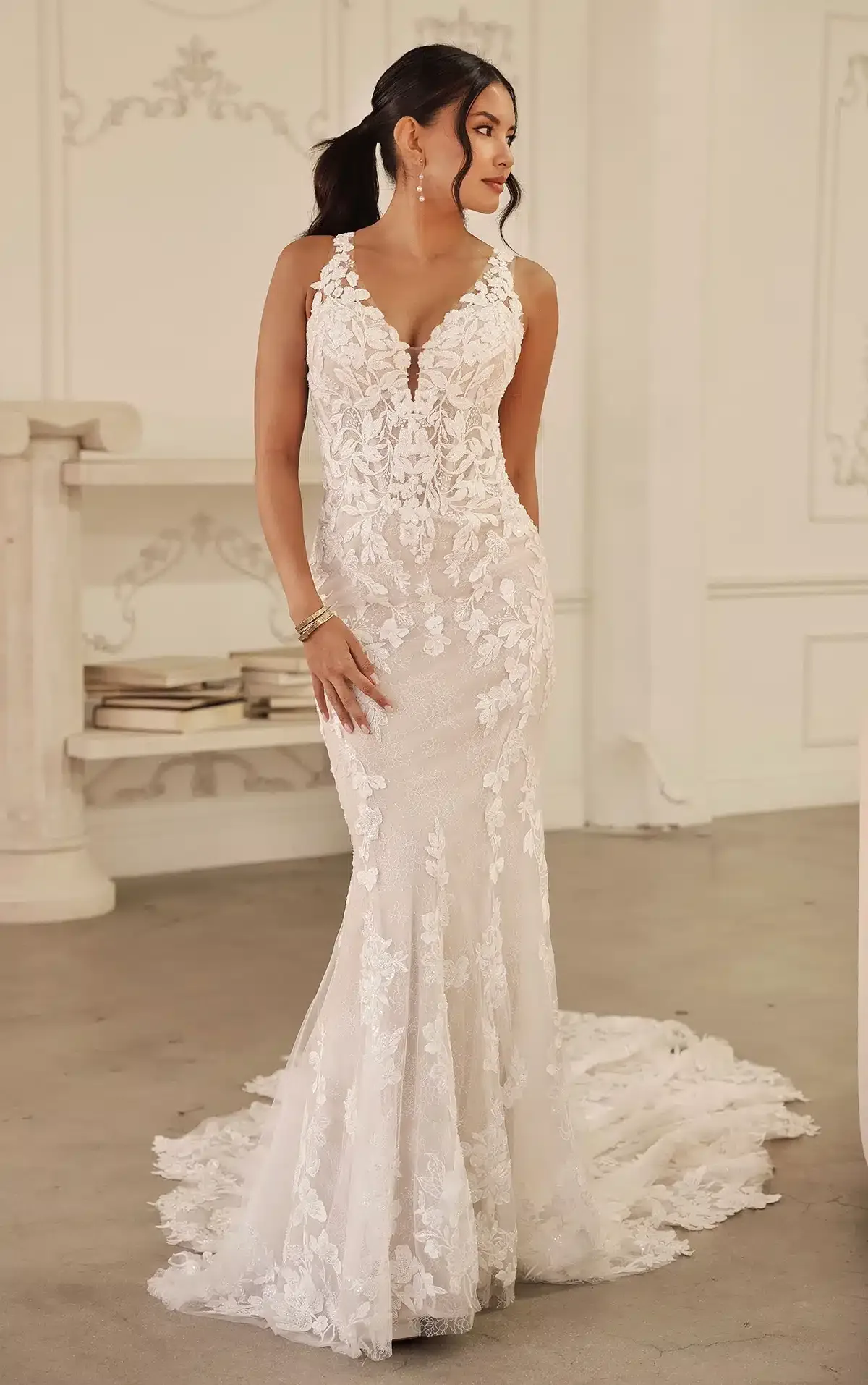 Das Modell 1908 ist ein glamouröses, Fit-and-Flare-Hochzeitskleid, das zarte Spitze mit modernen 3D-Blumenverzierungen für einen romantischen und zeitlosen Brautlook kombiniert. Das transparente Oberteil geht in einen tiefen V-Ausschnitt über, der von 3D-Blumen-Schulterträgern mit gewagten seitlichen Ausschnitten und einem ultra-tiefen, offenen Rückenausschnitt akzentuiert wird, die für einen Hauch von Verführung sorgen. Die dezente Basken-Taille umschmeichelt die Figur und führt zum figurbetonten, ausgestellten Rock, der mit verzierten Spitzenapplikationen besetzt ist, die in eine spektakuläre Schleppe aus Spitze übergehen, welche beim Gang zum Altar mit jedem magischen Schritt glänzt.