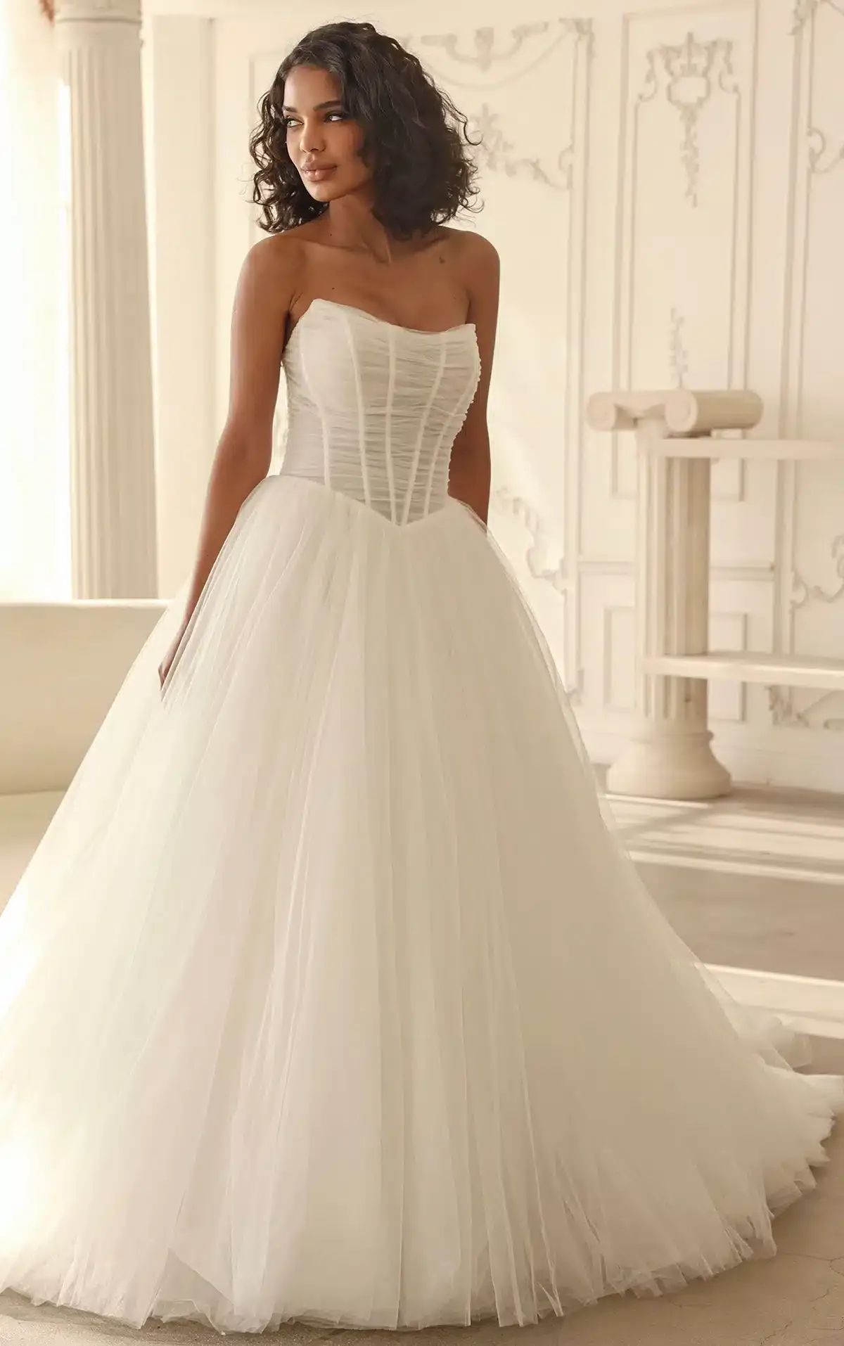 Schwerelos und luftig sorgt dieses Prinzessinnen-Hochzeitskleid aus hauchzartem Tüll und ohne Spitze für einen edlen und romantischen Brautlook. Das Modell 1940 zeichnet sich durch einen trägerlosen Rundhalsausschnitt aus, der ein sanft drapiertes Korsett-Oberteil präsentiert, das sowohl gefüttert als auch ungefüttert erhältlich ist, so dass die Braut die Wahl hat, wie transparent sie es haben möchte. Das rückseitig geschnürte Korsett aus Tüll sorgt für einen stilvollen Effekt und bildet ein modernes Schleifendetail auf dem Rücken. Von der Baskentaille aus formt der bezaubernde Ballkleidrock eine voluminöse Prinzessinnen-Silhouette, die sich bei jedem Schritt wundervoll bewegt.