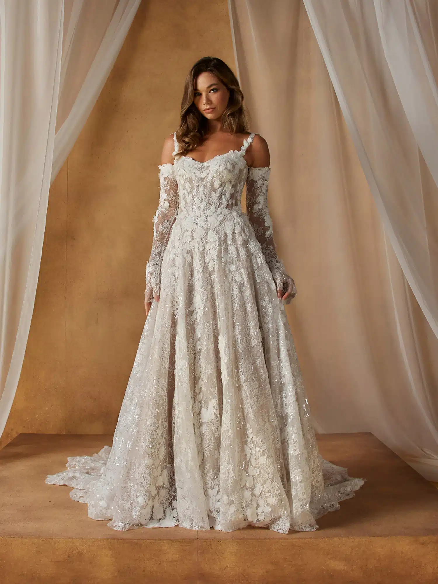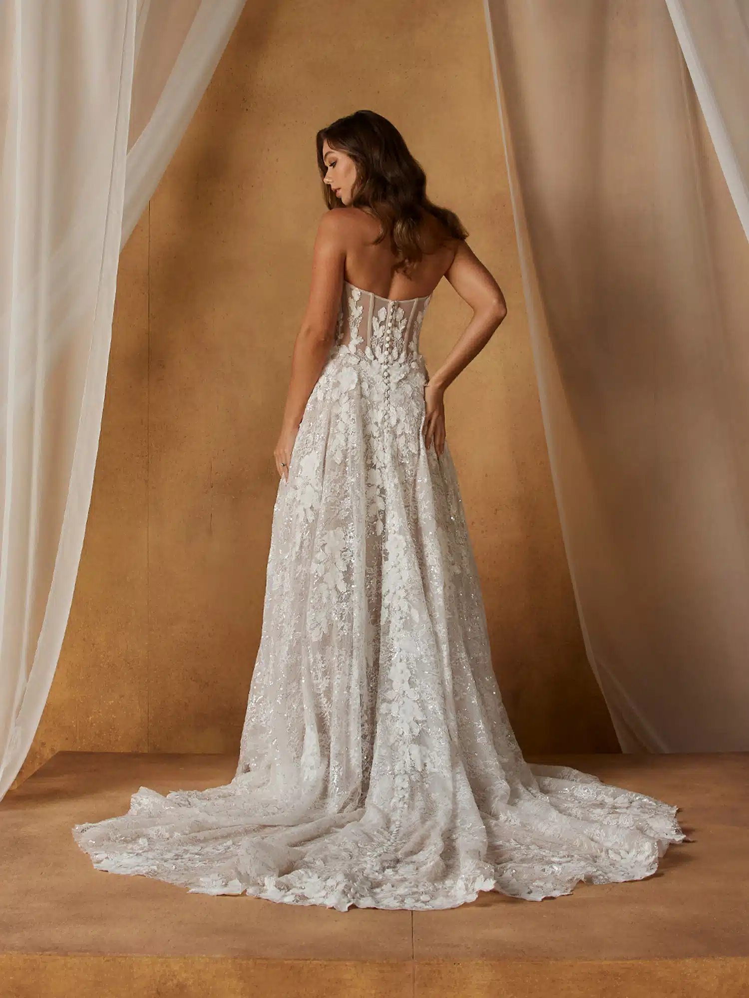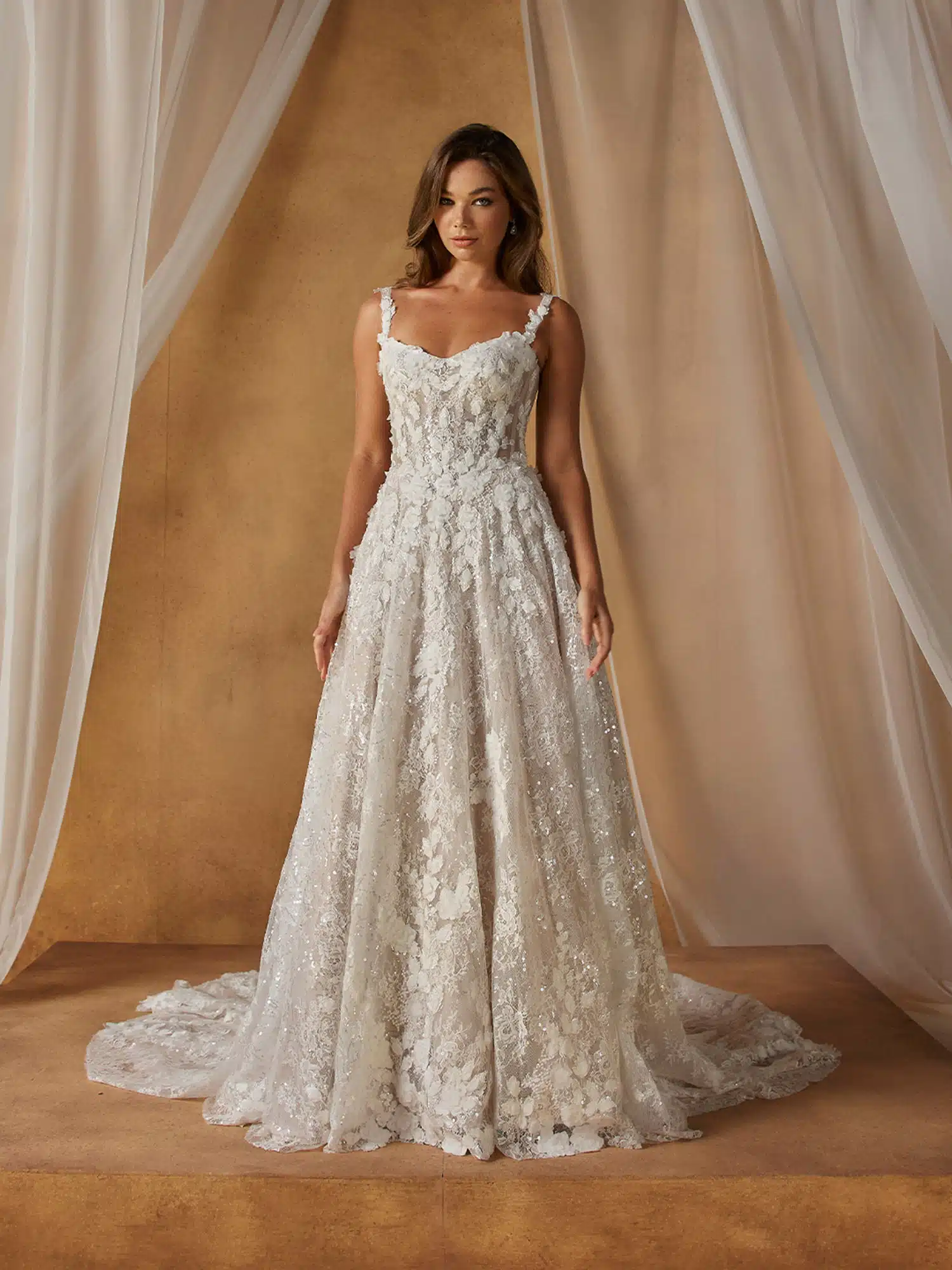Das Brautkleid Nali zeichnet sich durch wunderschöne Spitze und High-Fashion-Essenz aus. Es präsentiert sich in einer romantischen A-Linien-Silhouette und verbindet Schönheit mit Moderne. Das Oberteil hat einen dezenten V-Ausschnitt mit Blumenmotiven, die sich über die optionalen dünnen Träger erstrecken oder auch trägerlos getragen werden können. Transparente Seiteneinsätze betonen die Taille und unterstreichen die Sanduhrform der Basken-Taille und des weiten Rocks. Der Rock besteht aus mehreren Lagen Pailletten und Chantilly-Spitze, die die durchgehenden 3D-Motive ausgleichen und sich um den Saum herum sammeln. Ein Schimmer zieht sich über das gesamte Brautkleid, verleiht ihm Tiefe und fängt bei jeder Bewegung das Licht ein.