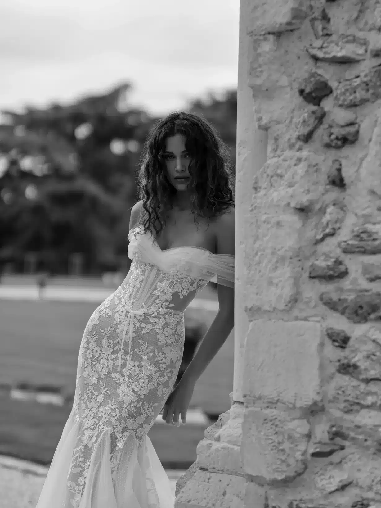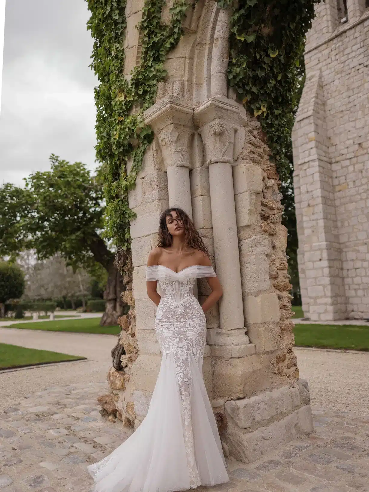 Verspieltes, schulterfreies Meerjungfrauenkleid mit luftigem Dekolleté und einem taillierten Mieder, das in einen anmutigen Rock übergeht. Das Design kombiniert eine Guipure-Basis mit matten floralen Akzenten und leichtem Mesh für mehr Volumen.