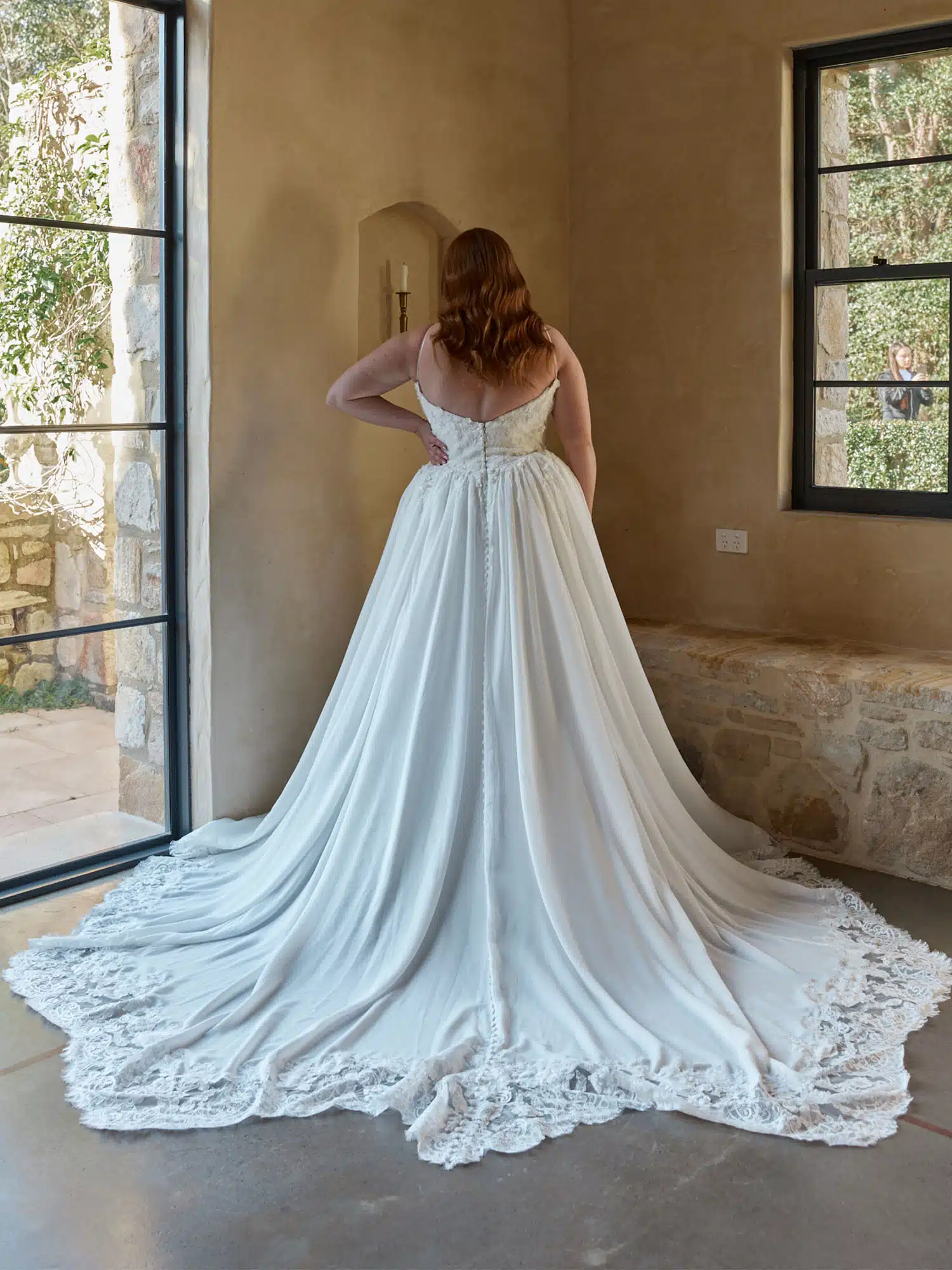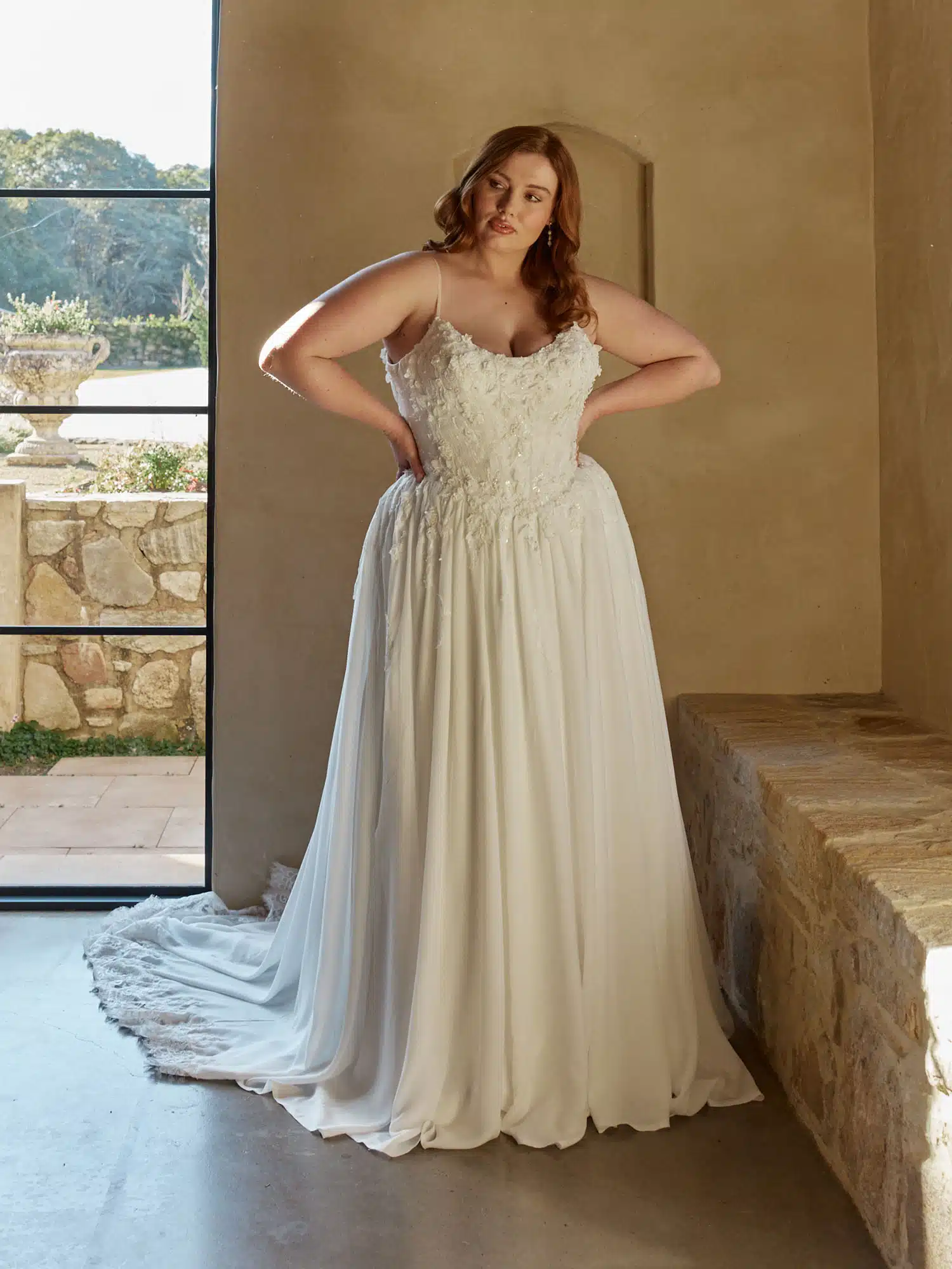 Das Brautkleid „Natiya“ verkörpert sanfte, feminine Eleganz und wurde für Bräute entworfen, die sich nach zarten, himmlischen Details sehnen. Ein moderner Rundhalsausschnitt umrahmt das Oberteil, das durch mit Perlen bestickte Spaghettiträger akzentuiert wird, welche für dezenten Glanz und Raffinesse sorgen. Das Oberteil aus glitzerndem Illusions-Tüll ist mit vertikalen Falten versehen, die die Silhouette strecken und gleichzeitig die Gesamtform durch eine sanfte Struktur weicher wirken lassen. Über das Oberteil verteilt ist sorgfältig platzierte, mit Pailletten bestickte Spitze, die den romantischen Charme unterstreicht und leuchtende Akzente setzt. Das Oberteil endet an einer zeitgemäßen, leicht tiefer sitzenden Taille und geht nahtlos in einen leichten Chiffonrock über, der an der Taille gerafft ist und für Volumen sorgt. Die leichte A-Linien-Silhouette umspielt sanft den Körper und schafft eine anmutige, schmeichelhafte Form, die luftig und romantisch wirkt. Von der Taille herabfallende Spitze geht in den Rock über und mündet in einen fließenden Chiffonrock und eine Schleppe aus Illusionsspitze, die für zusätzliche Bewegung sorgen. Das Brautkleid Natiya vereint weiche Texturen, eine sanfte Struktur und romantische Details und schafft so einen bezaubernden Look für Bräute, die zeitlose Eleganz mit modernem Touch suchen.
