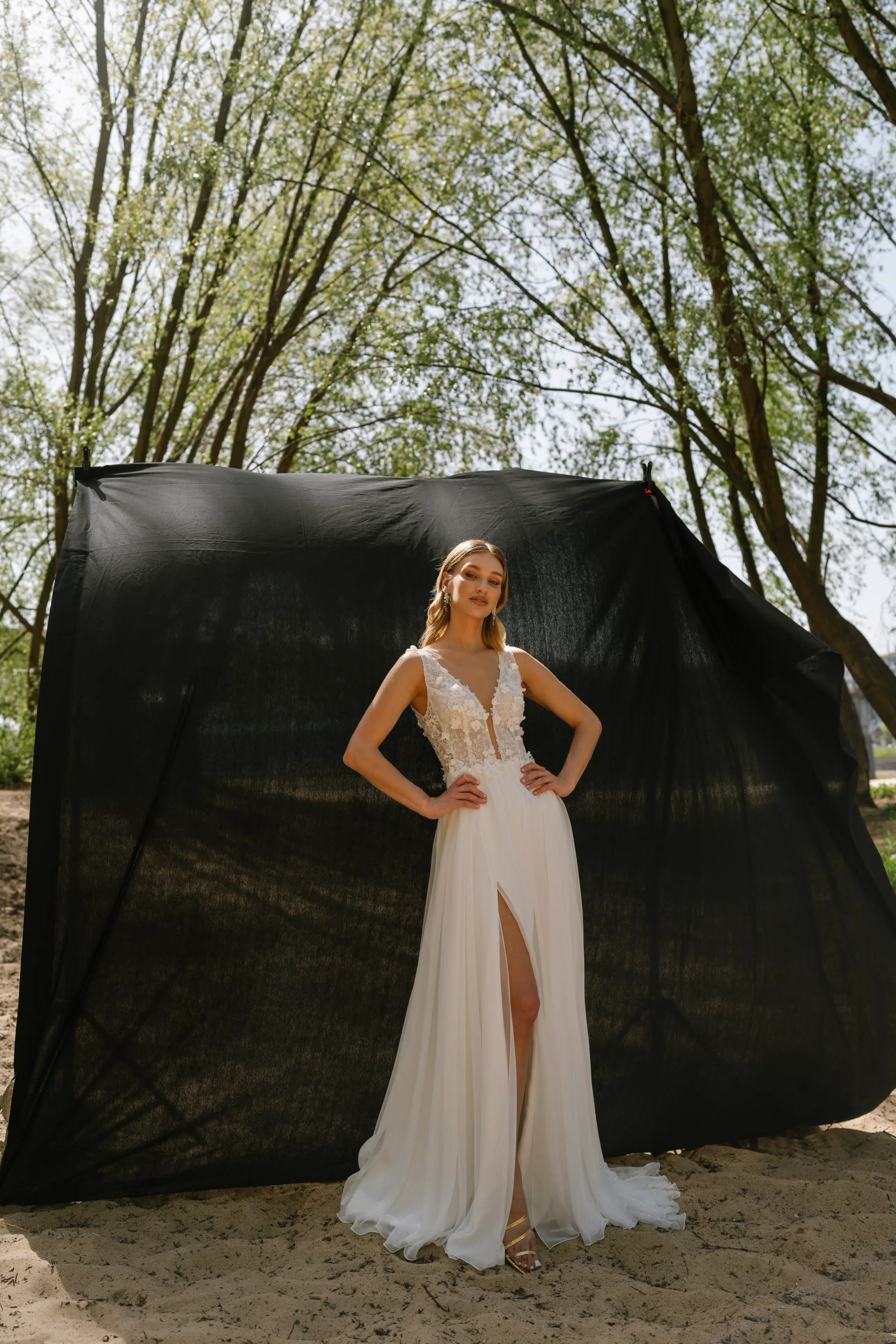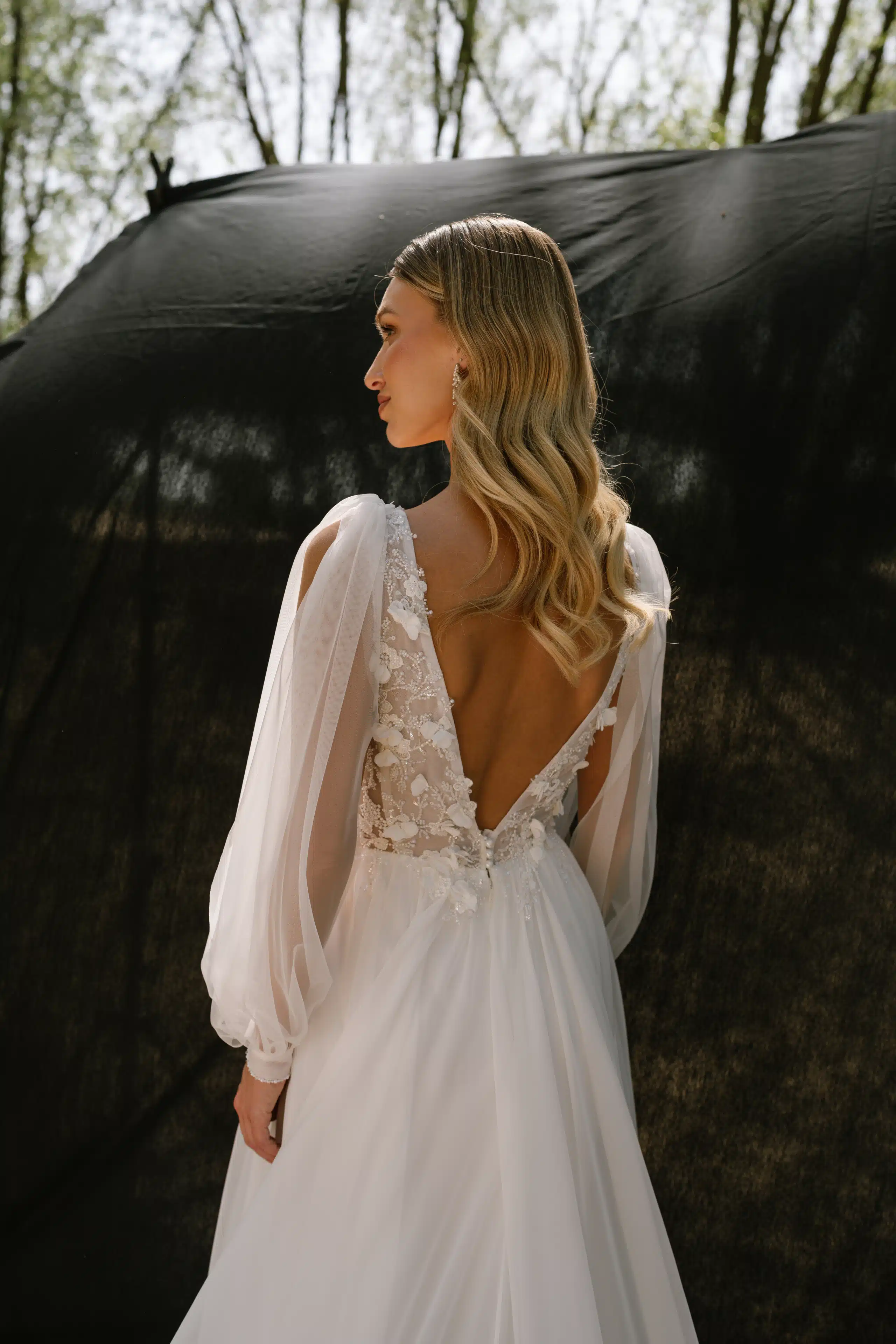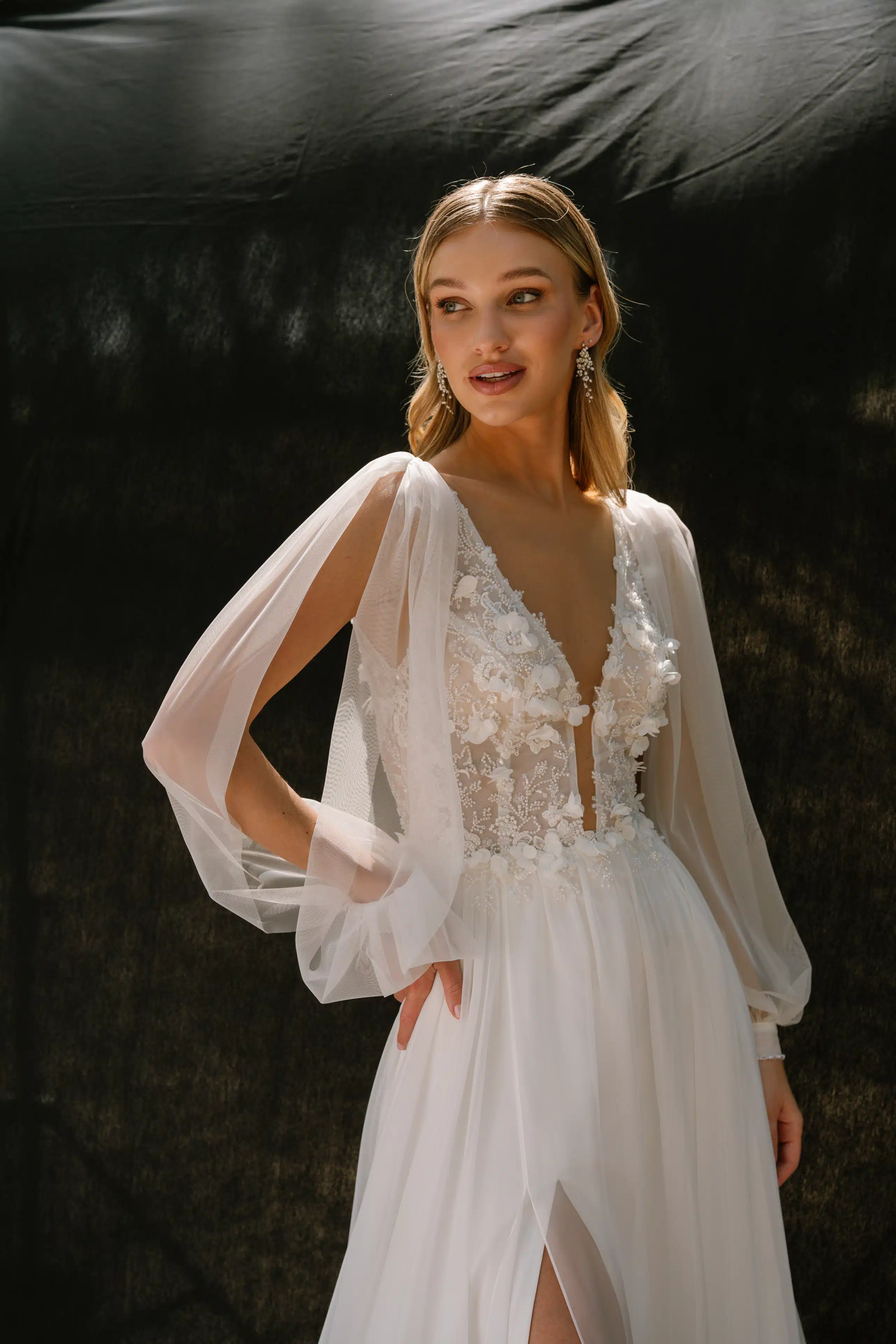 Strahle an deinem großen Tag in diesem traumhaften Brautkleid in fließender A-Linie. Das Oberteil verziert mit funkelnden Pailetten und zarten 3D-Blumen, sorgt für romantischen Glamour, während der tiefe V-Ausschnitt vorne und im Rücken verführerische Akzente setzt. Der leichte Chiffon-Rock mit elegantem Schlitz lässt jede Bewegung mühelos wirken. Besonders flexibel: Die abnehmbaren langen Tüllärmel mit mittigem Schlitz verwandeln dein Look im Handumdrehen – von zart-romantisch zu modern-elegant.