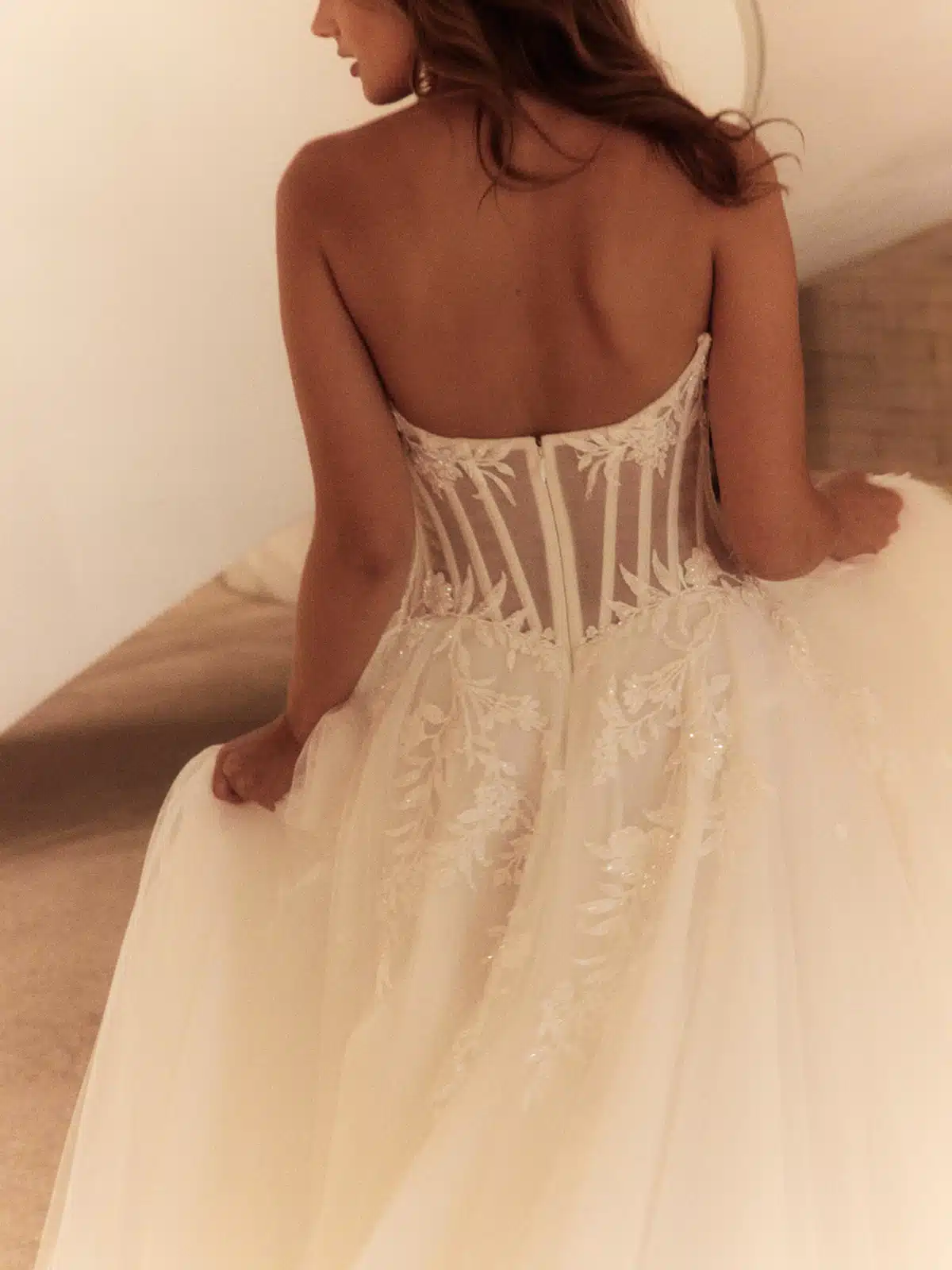 Nigella – ein verspieltes, tailliertes Ballkleid, das Freude und Weiblichkeit zelebriert. Aufwendige florale Verzierungen, die mit schimmernden, geschliffenen Perlen verziert sind, sorgen für einen Hauch von Glanz und Romantik, während die geschwungenen Miederlinien deine Silhouette formen und betonen. Der verträumte, wolkenartige Tüllrock fängt den unbeschwerten Zauber des Tages ein und schafft einen Look, der direkt aus einem Märchen stammt. Nigella ist perfekt für die Braut, die mit Charme, Eleganz und genau dem richtigen Maß an Laune ein Statement setzen möchte.