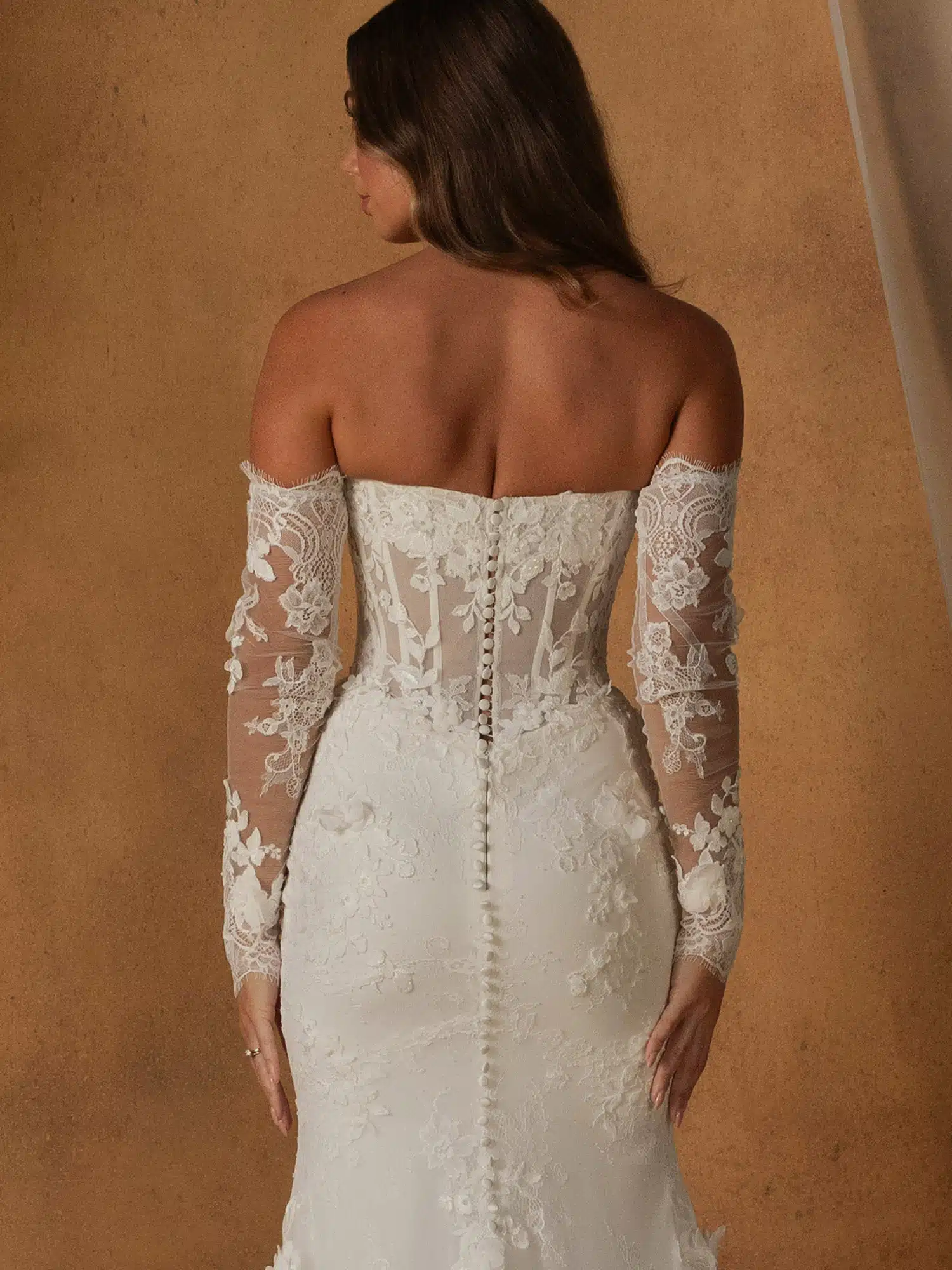 Für trendbewusste Bräute, die sich von sanftem Glamour inspirieren lassen, ist das Brautkleid Nisha eine moderne Interpretation von Romantik, entworfen in einer taillierten und ausgestellten Silhouette. Es ist aus zarter Chantilly-Spitze gefertigt und seine Form wird durch die Textur weicher, während die zeitgemäße Struktur erhalten bleibt. Ein klarer, gerader Ausschnitt schafft Ausgewogenheit und umrahmt das Dekolleté mit zurückhaltender Eleganz. Freiliegende Stäbchen definieren das Illusionsoberteil und bilden einen auffälligen Kontrast zum Spitzenhintergrund. Eine dezente Basken-Taille formt die Figur und lenkt den Blick auf die Silhouette. Über das gesamte Kleid verteilt blühen 3D-Spitzenmotive an gezielten Stellen und verleihen dem Kleid Tiefe und organische Details. Diese Applikationen betonen die natürliche Bewegung und verleihen der Spitzenbasis Dimension. Der Rock liegt eng an den Hüften an und fällt dann am Saum sanft ausgestellt. Abnehmbare, schulterfreie Ärmel aus passender Spitze sorgen für Vielseitigkeit und Weichheit.