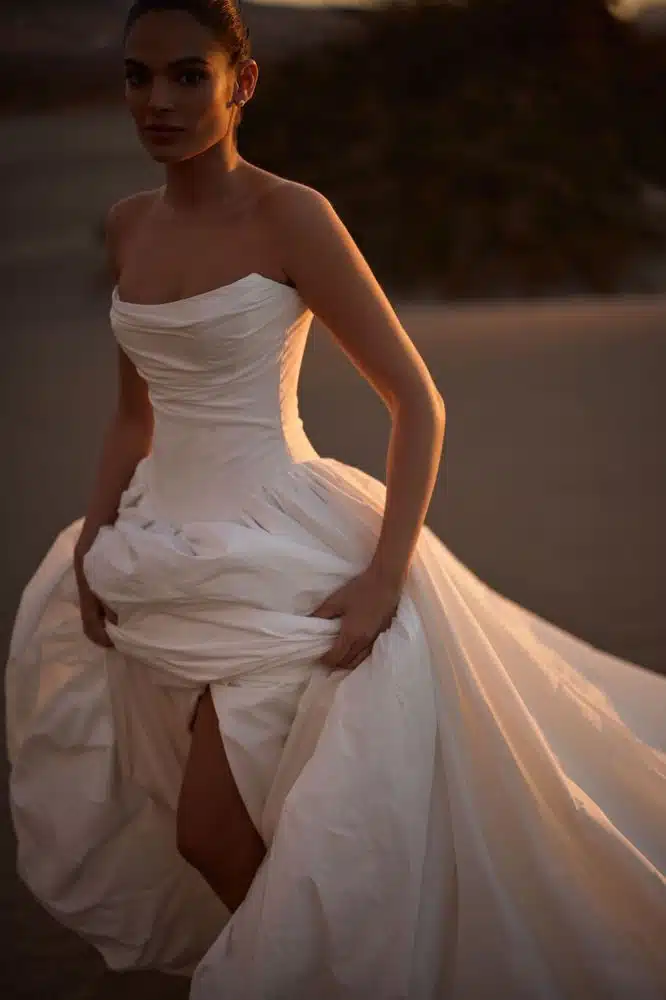 Puffiges Brautkleid mit extrem voluminösem Rock und opulenter Schleppe. Dieses Kleid aus Taft verfügt über ein Korsett mit tiefem Taillenbund und Reißverschluss sowie ein zusätzliches, eingenähtes Formkorsett, das die Taille betont, und einen voluminösen Ballonrock mit langer Schleppe.