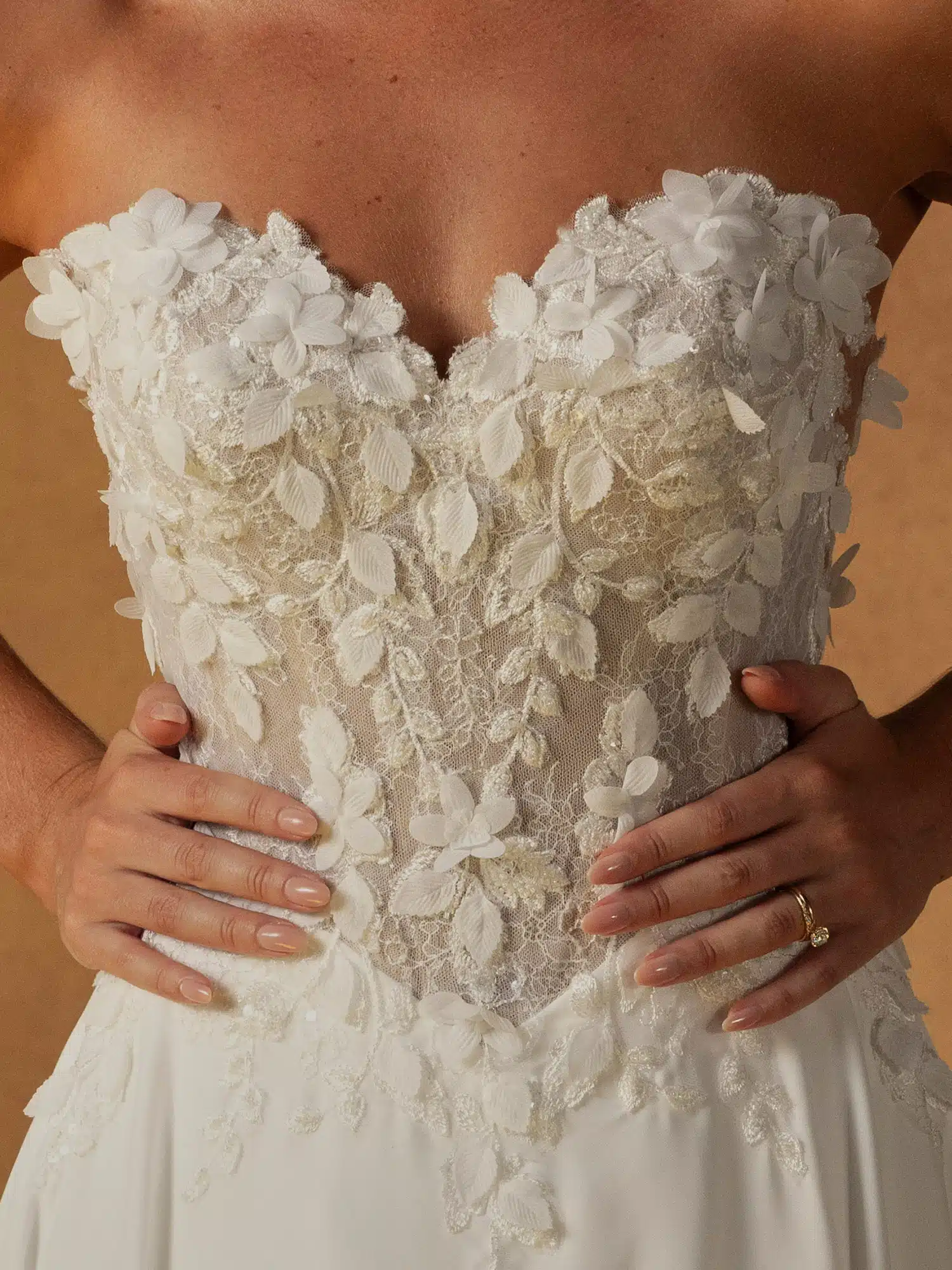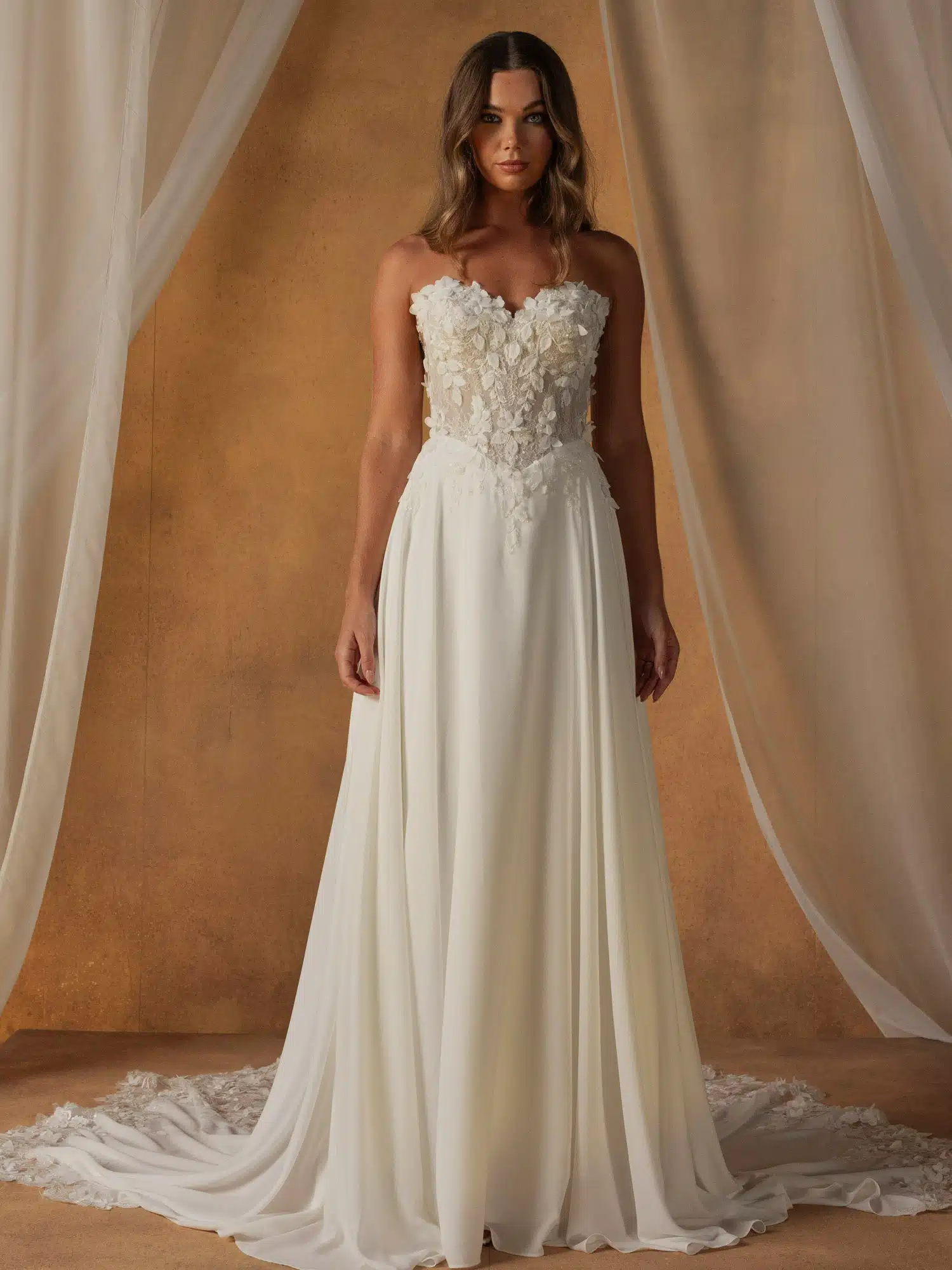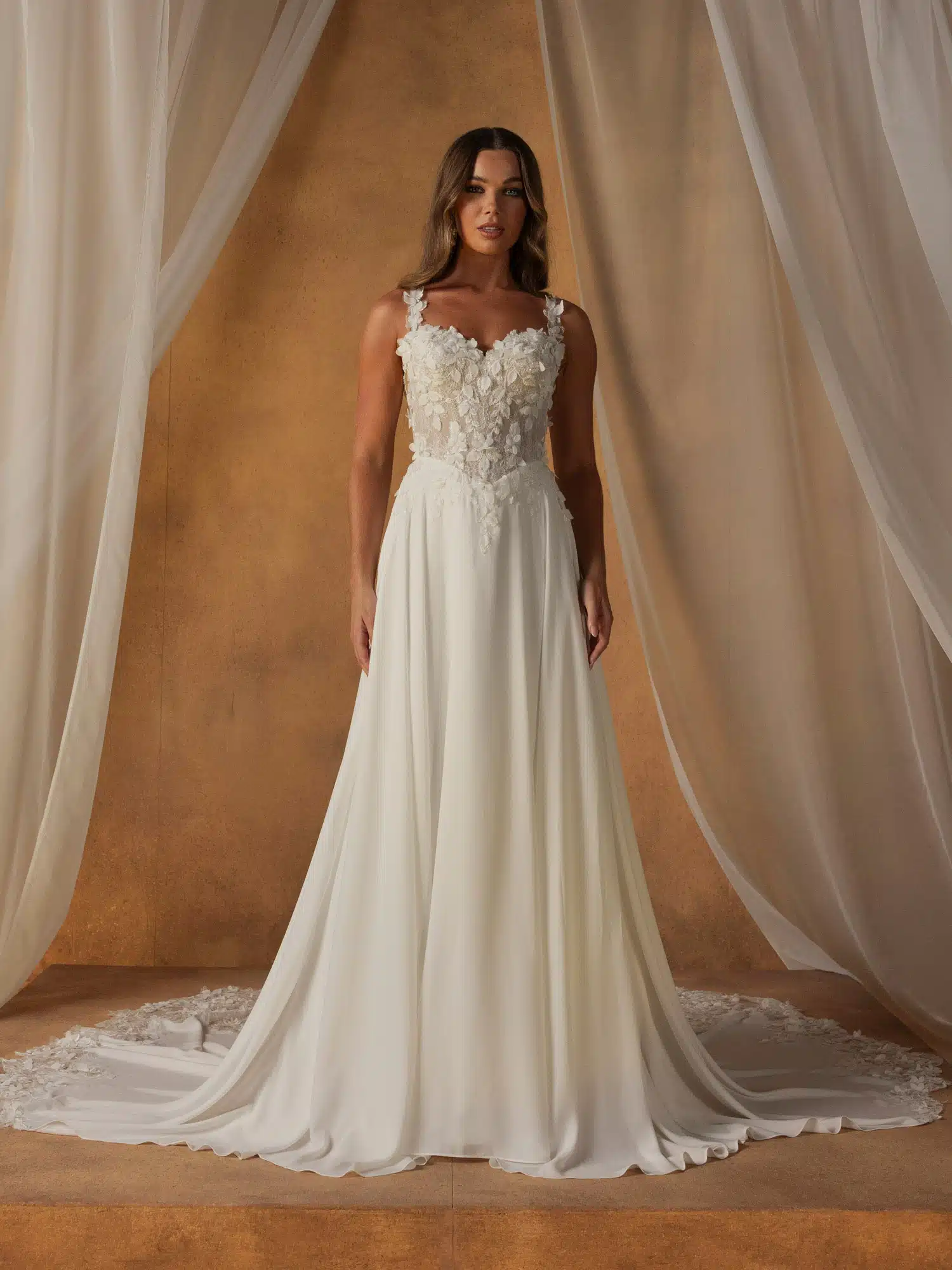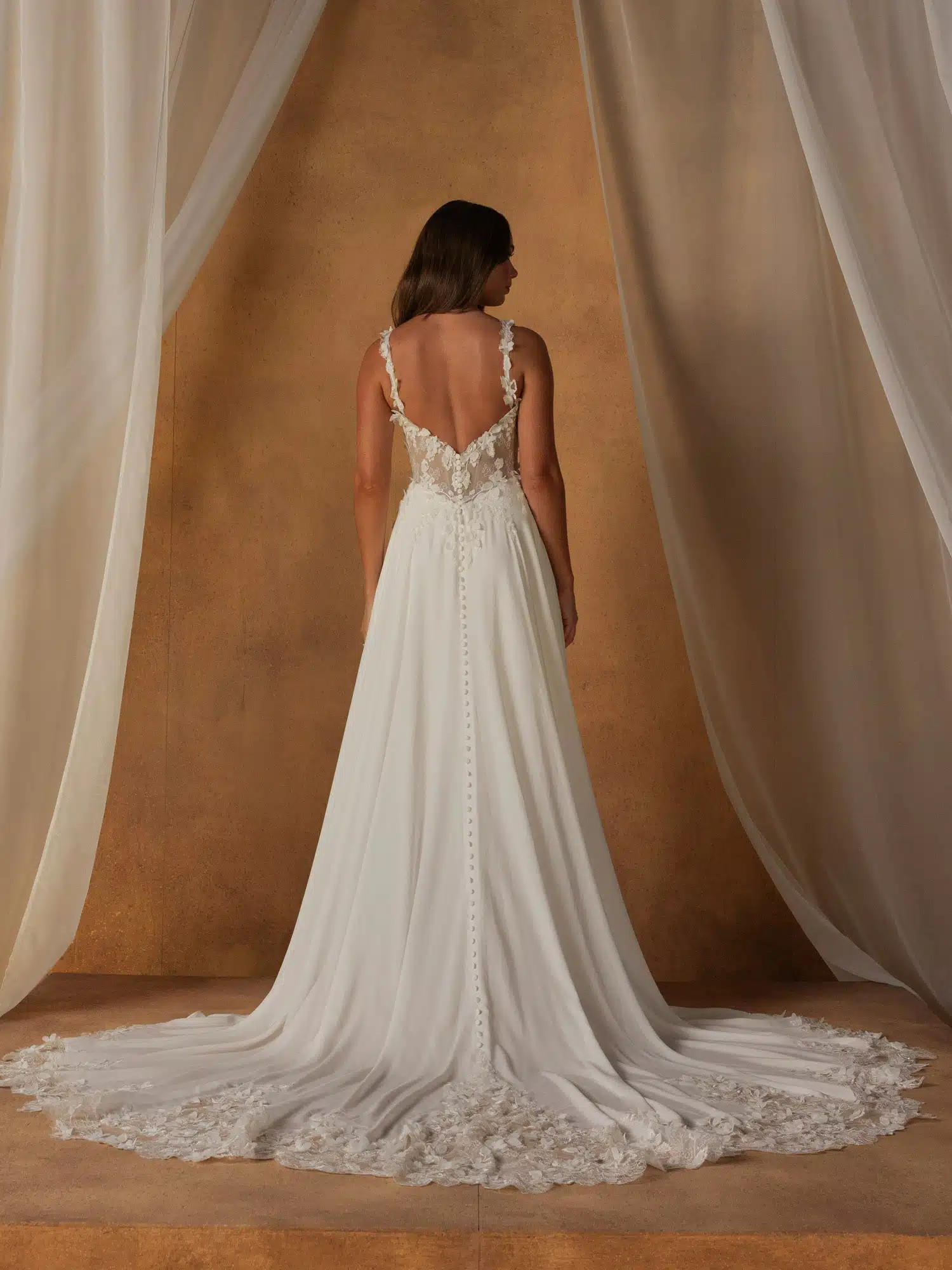 Organische Blumenmuster treffen im Brautkleid Nola auf zarten Chiffon und sorgen für einen eleganten und mühelosen Look. Mit 3D-Motiven, die Blätter und Blütenblätter imitieren und über das Oberteil verstreut sind. Das Oberteil kann mit Trägern getragen werden, die für Halt sorgen und mit passenden Motiven verziert sind, die über die Schultern fallen. Oder nehme die Träger ab, um einen zweiten Look in einem Kleid zu erzielen. Umrahmt von einem Herzausschnitt erzeugt die Spitze des Oberteils einen illusionären Effekt bis hinunter zur baskischen Taille. Dezente Pailletten auf der Chantilly-Spitze sorgen für einen leichten Schimmer, während diskret sichtbare Stäbchen der Figur Form verleihen. Der Rücken des Oberteils ist V-förmig geschnitten, um die Taille optisch weiter zu betonen. Spitze trifft an der Taille auf Chiffon und geht in einen leichten A-Linien-Rock über. Spitze umrahmt die Taille, fließt in die Hüften und geht nahtlos in den Chiffon über. Ein schlichter Saum sorgt für einen leichten Look, während sich hinter dem Kleid eine Illusionsschleppe entfaltet, die die natürlichen Motive bis zum Ende des Kleides fortsetzt. Die Romantik der 3D-Spitze und der Minimalismus des klaren Chiffons machen dieses Kleid zu einer einfachen Wahl für moderne Bräute, die sich für ihren Hochzeitstag etwas mehr als nur Schlichtheit wünschen.