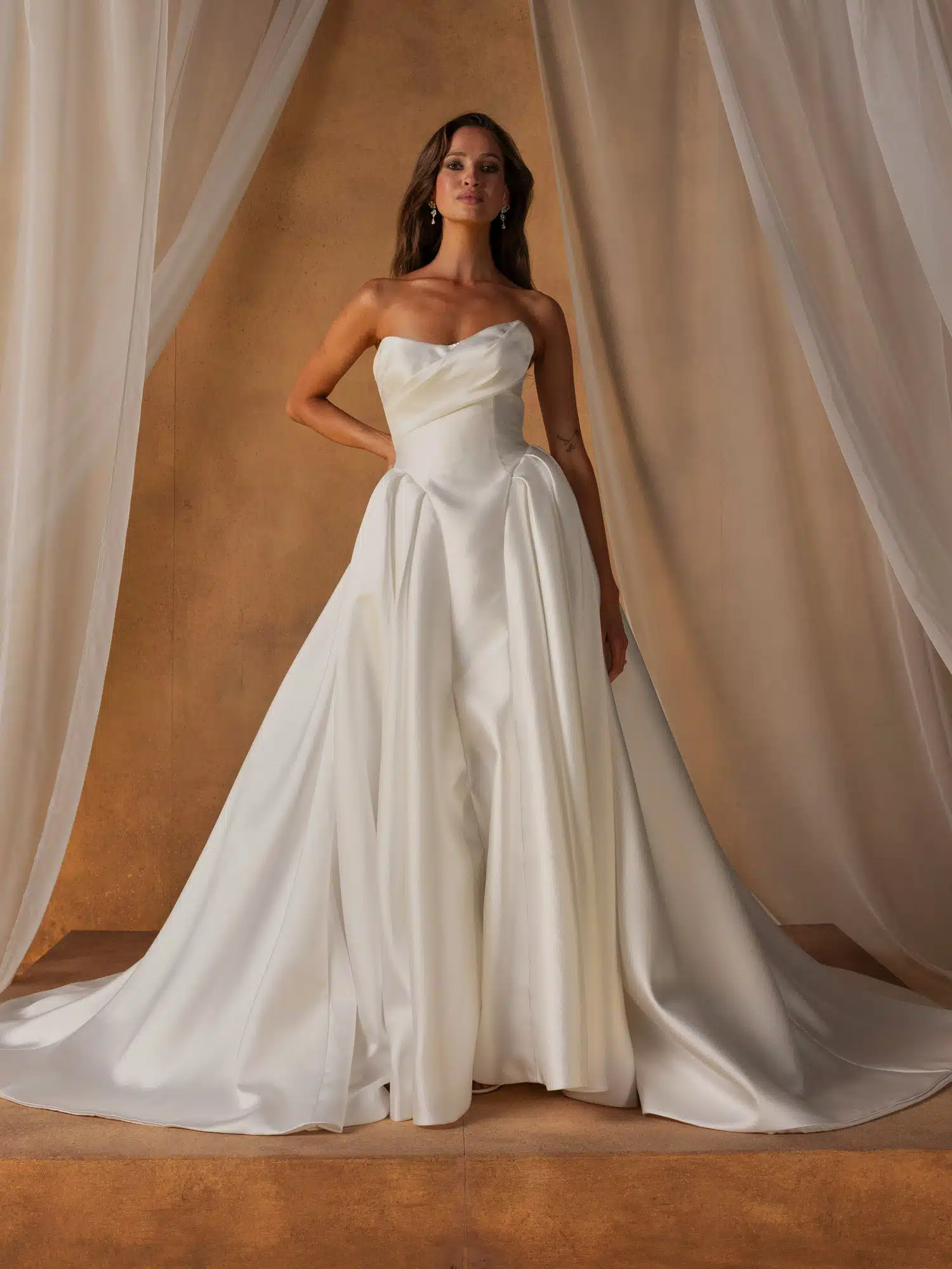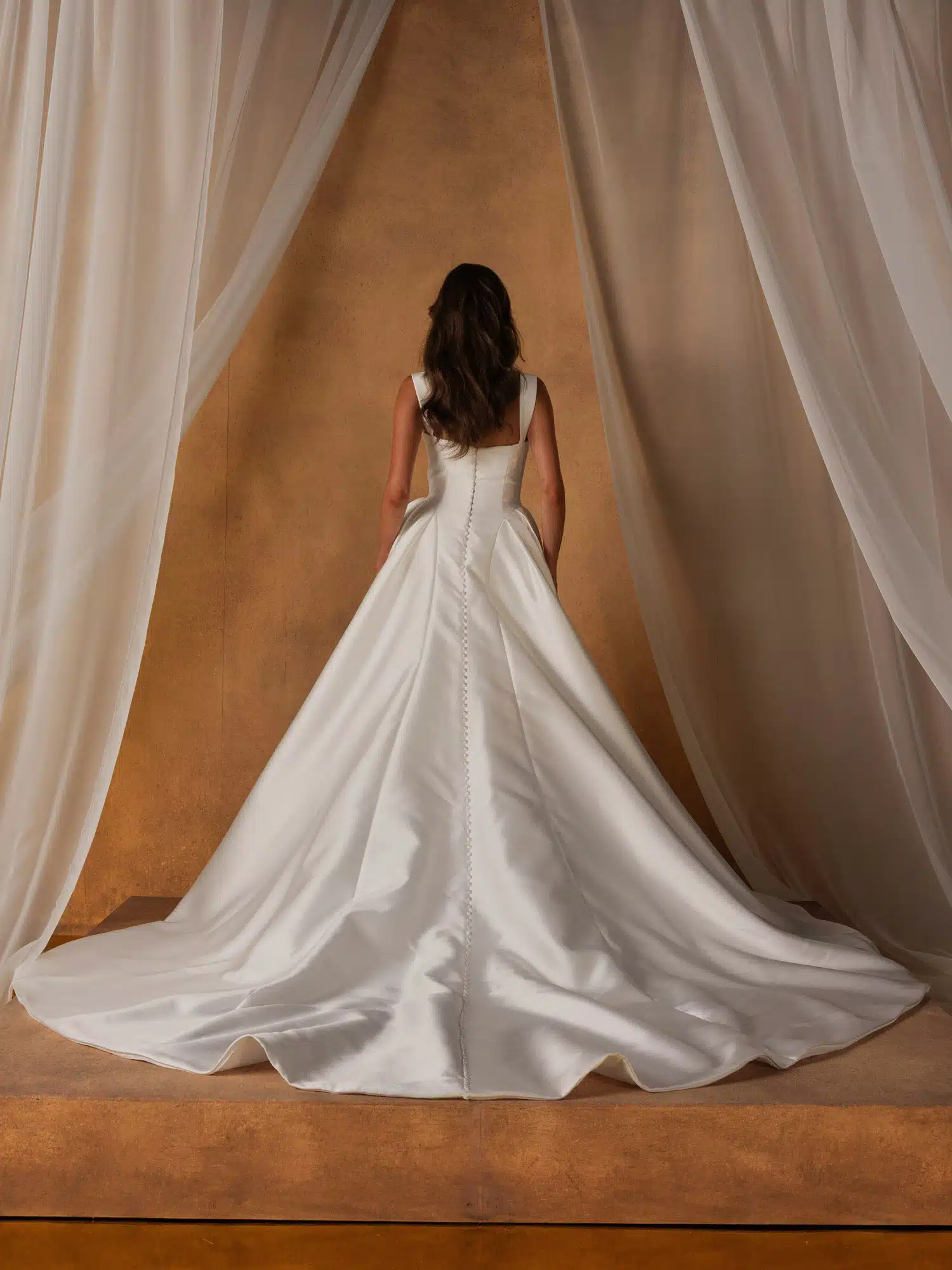 Das Brautkleid „Noon“ wurde für die trendbewusste Braut entworfen, die einen eleganten, klaren und zeitlosen Look sucht. Das aus leuchtendem Mikado gefertigte Kleid „Noon“ mit gerafften Details an der Hüfte hat eine traditionelle Brautkleidsilhouette. Zeitgemäße Elemente verleihen dem minimalistischen Stoff eine besondere Note und sorgen für einen frischen Look. Das Oberteil mit U-Ausschnitt verfügt über reichhaltige, asymmetrische Drapierungen, die für Bewegung im gesamten Oberteil sorgen. Der Blick wird über den Oberkörper auf die geschwungenen Nähte gelenkt, die die Taille subtil formen und betonen. Das Kleid kann entweder trägerlos für einen modernen Look oder mit Schulterträgern für einen eher traditionellen Stil getragen werden. Der A-Linien-Rock erhält durch große Falten an der Hüfte, die das schlanke Vorderteil umrahmen, ein dramatisches Volumen. Dieses Volumen schafft die begehrte Sanduhrform der Figur. Das Spiegelbild auf der Rückseite des Kleides sorgt für einen schicken, modernen und dennoch klassischen Brautstil. Der gerade Rücken des Oberteils sitzt höher, um mehr Sicherheit und Halt zu bieten. Eine vertikale Knopfreihe beginnt hier und endet am längsten Punkt der Schleppe für ein elegantes Finish.