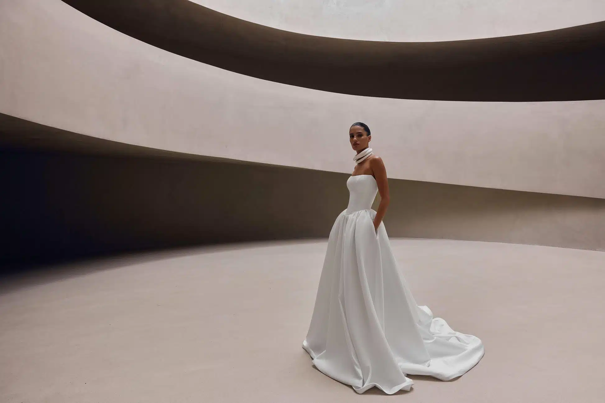 Ein ärmelloses Brautkleid in A-Linie aus geschmeidigem Satin, mit einem strukturierten Korsettoberteil, das die Taille betont, und einem voluminösen Rock, der mit dezenten Taschen für zusätzlichen Komfort versehen ist.