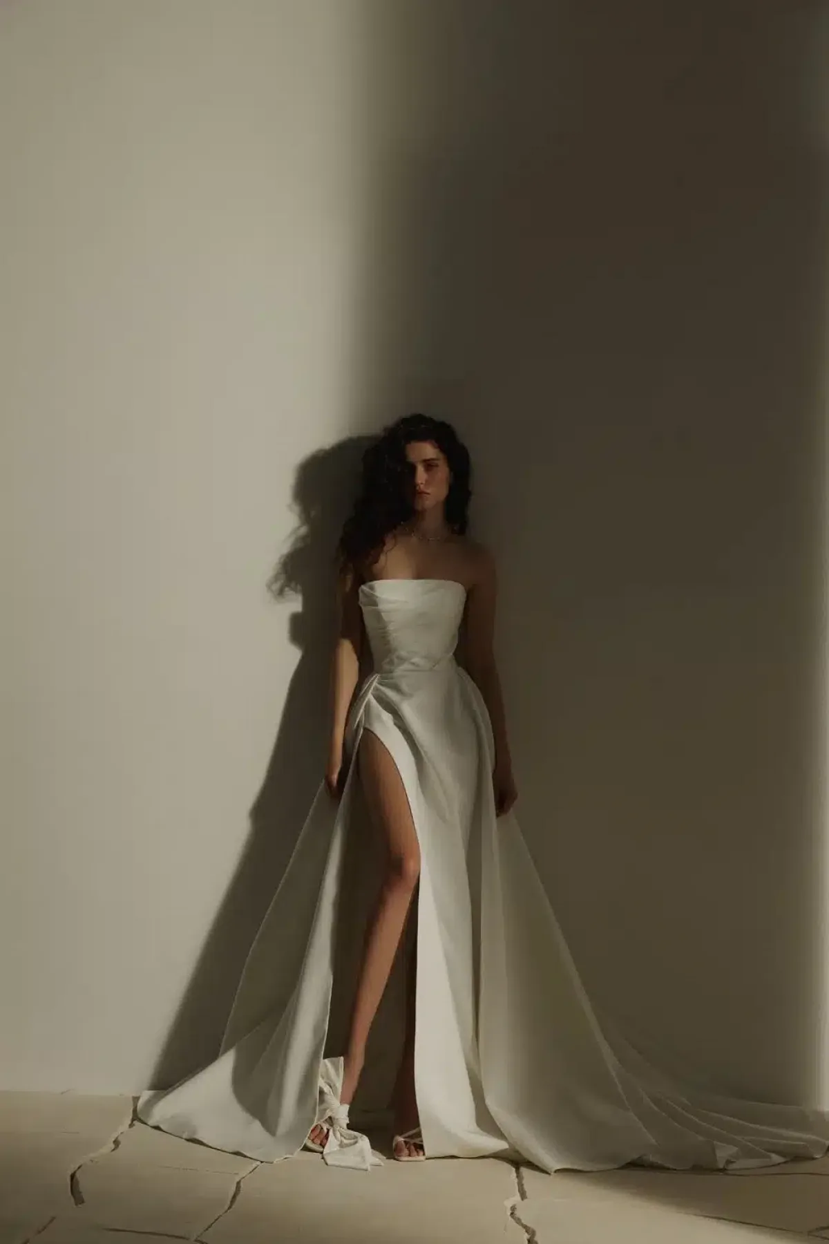 Das Norwin-Kleid ist eine moderne A-Linien-Silhouette für die selbstbewusste, elegante Braut. Gefertigt aus dichtem, mattem Satin, bietet es Struktur und eine raffinierte, minimalistische Ästhetik. Ein gewagter, oberschenkelhoher Schlitz sorgt für einen gewagten, modischen Akzent, der den klassischen Schnitt perfekt ausgleicht. Der Verschluss am Rücken mit verdecktem Reißverschluss sorgt für ein glattes, maßgeschneidertes Finish. Norwin ist ideal für Bräute, die sich zeitlose Eleganz mit einem Hauch von Modernität wünschen.