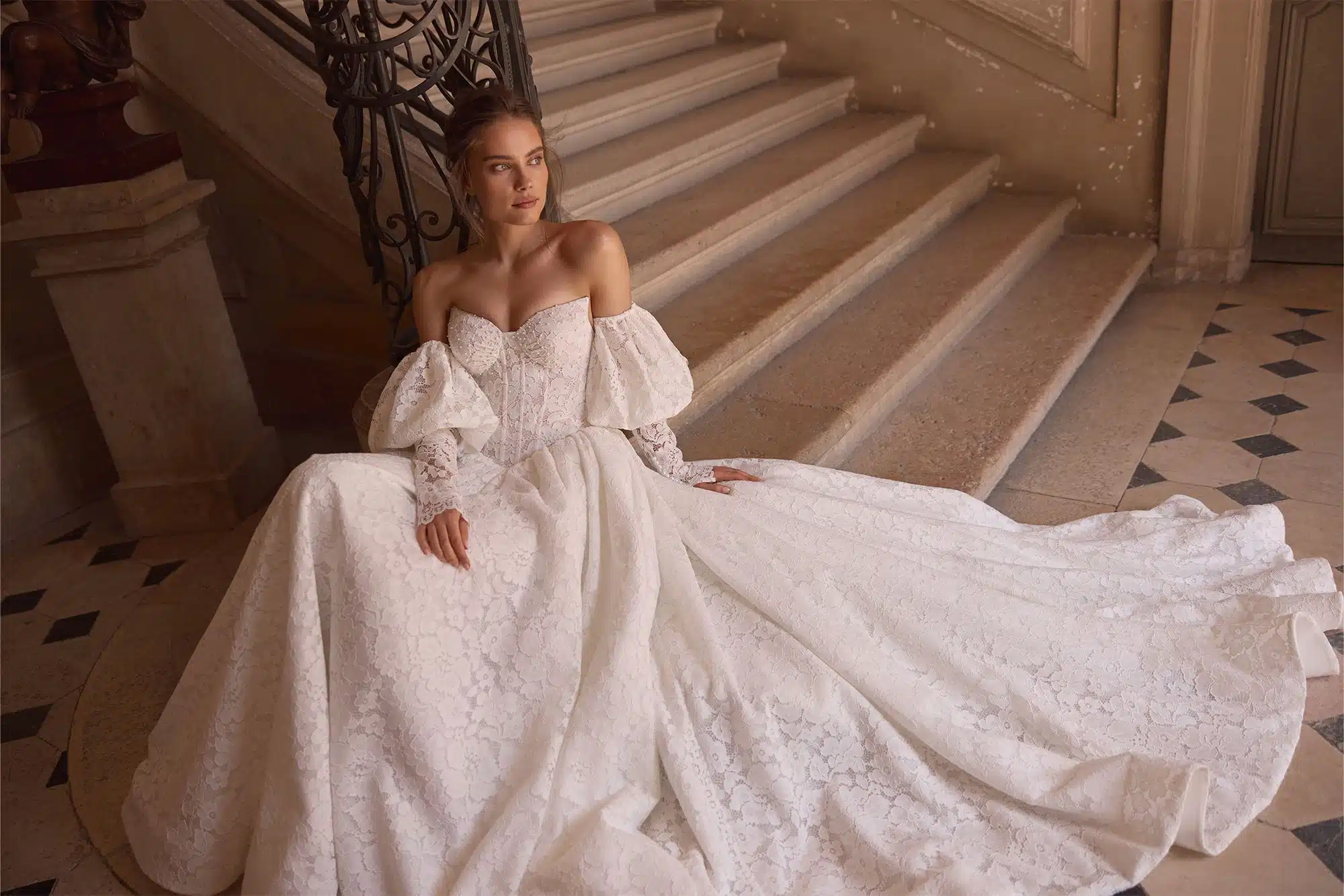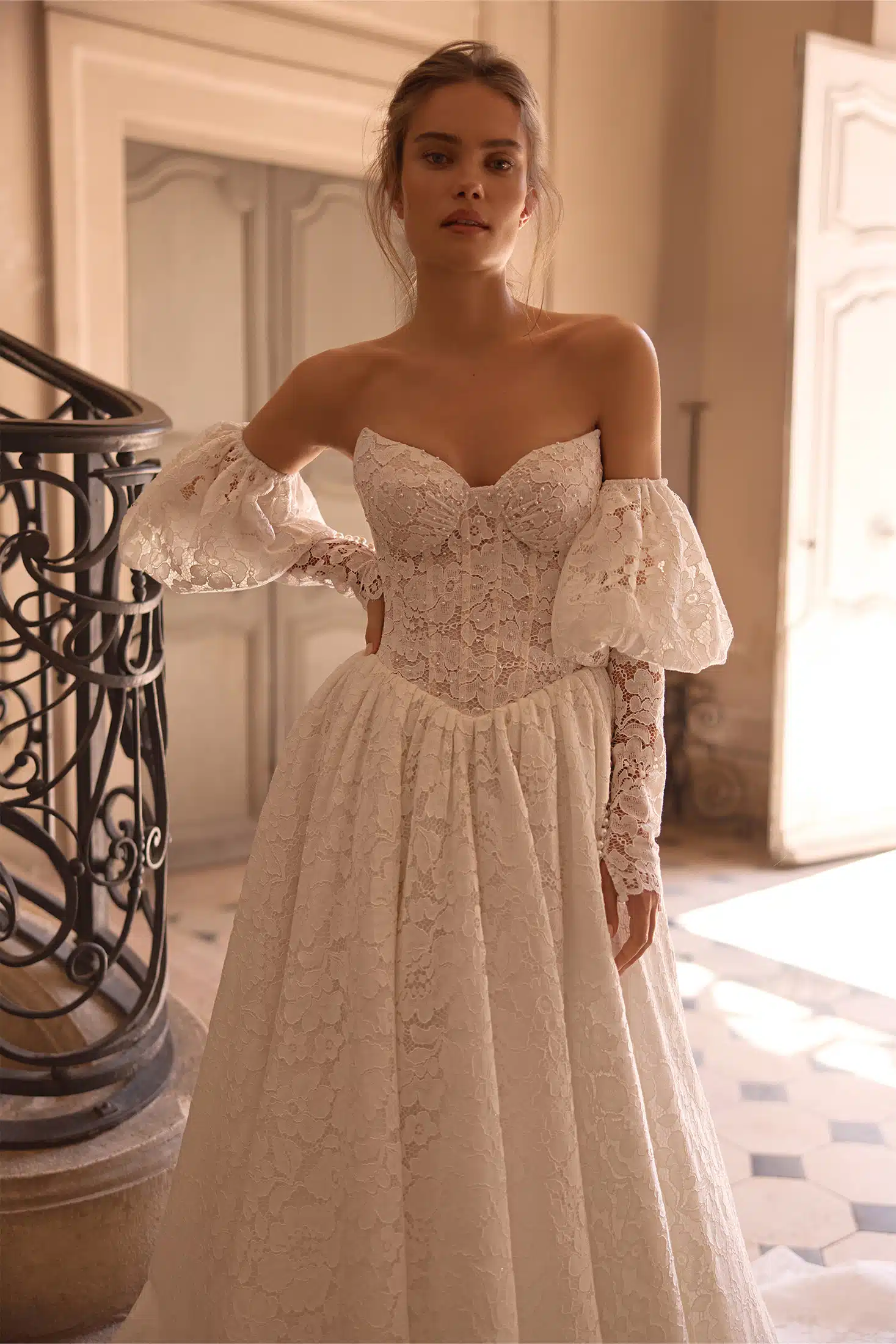 Dieses traumhafte A-Linien-Brautkleid verbindet klassisch-romantische Eleganz mit einem modernen Twist. Die zarte Baskentaille formt eine feminine Silhouette, während der Herzausschnitt das Dekolleté stilvoll in Szene setzt. Lange Off-Shoulder-Ärmel – oben sanft gepufft, nach unten hin schlank und figurbetont – verleihen dem Look eine subtile Dramatik. Das Oberteil aus All-Over-Spitze, kunstvoll veredelt mit feinen Perlen, sorgt für ein edles Funkeln bei jedem Schritt. Ein Kleid für Bräute, die Zeitlosigkeit und trendbewusste Details perfekt vereinen möchten.