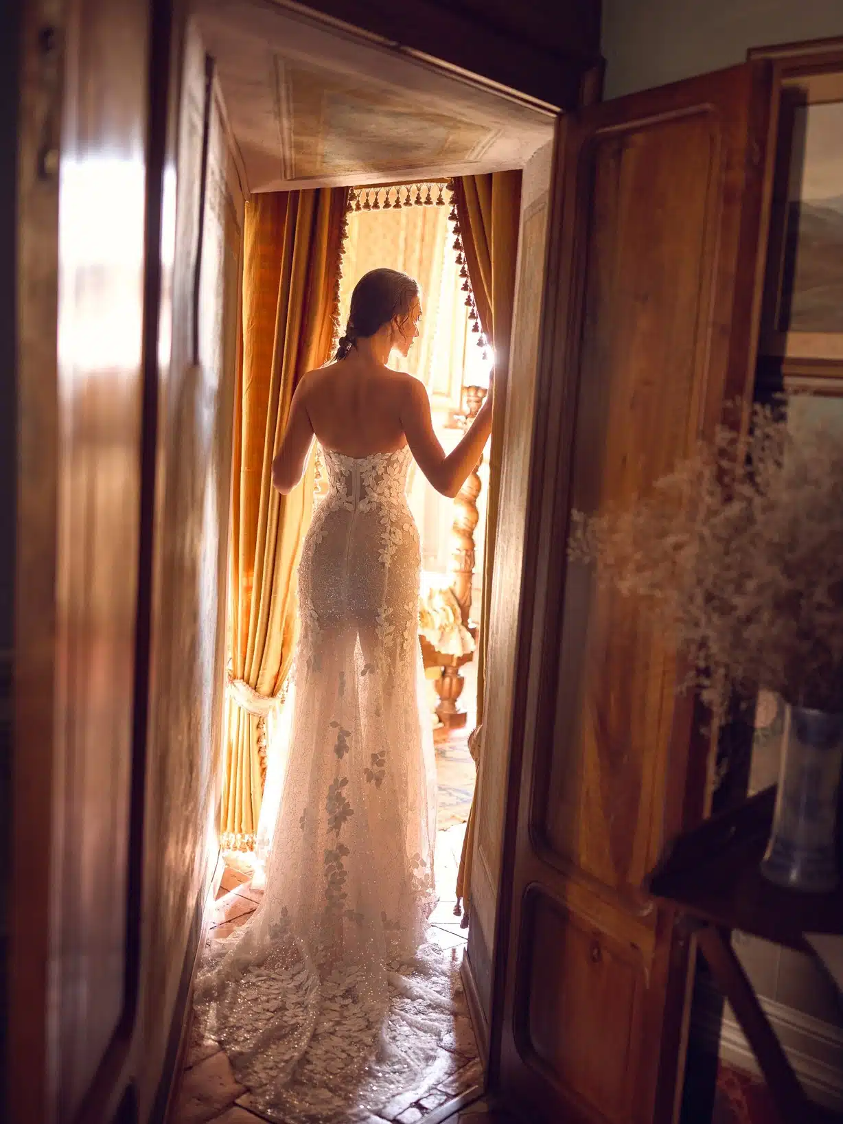 Das Nyx-Kleid ist eine raffinierte Meerjungfrauen-Silhouette, die mit ihrem Schimmer und floraler Eleganz begeistert. Aus funkelnder Spitze gefertigt, ist das Kleid mit zart verstreuten Blumenapplikationen verziert, die sich anmutig über das Oberteil und den Rock ziehen und einen romantischen, strukturierten Effekt erzeugen. Das strukturierte Oberteil verfügt über einen klassischen Herzausschnitt mit einem Illusions-Mesh-Einsatz in der Mitte für zusätzlichen Halt und subtile Raffinesse. Mehrere Lagen cappuccino-farbener Futter sorgen für Tiefe und Wärme im Gesamtbild und betonen die Ausstrahlung der Spitze. Eine markante dreieckige Schleppe erstreckt sich vom Rock und verleiht jedem Schritt Dramatik und Raffinesse. Nyx ist perfekt für die Braut, die modernen Glamour mit einem zeitlosen floralen Akzent sucht.