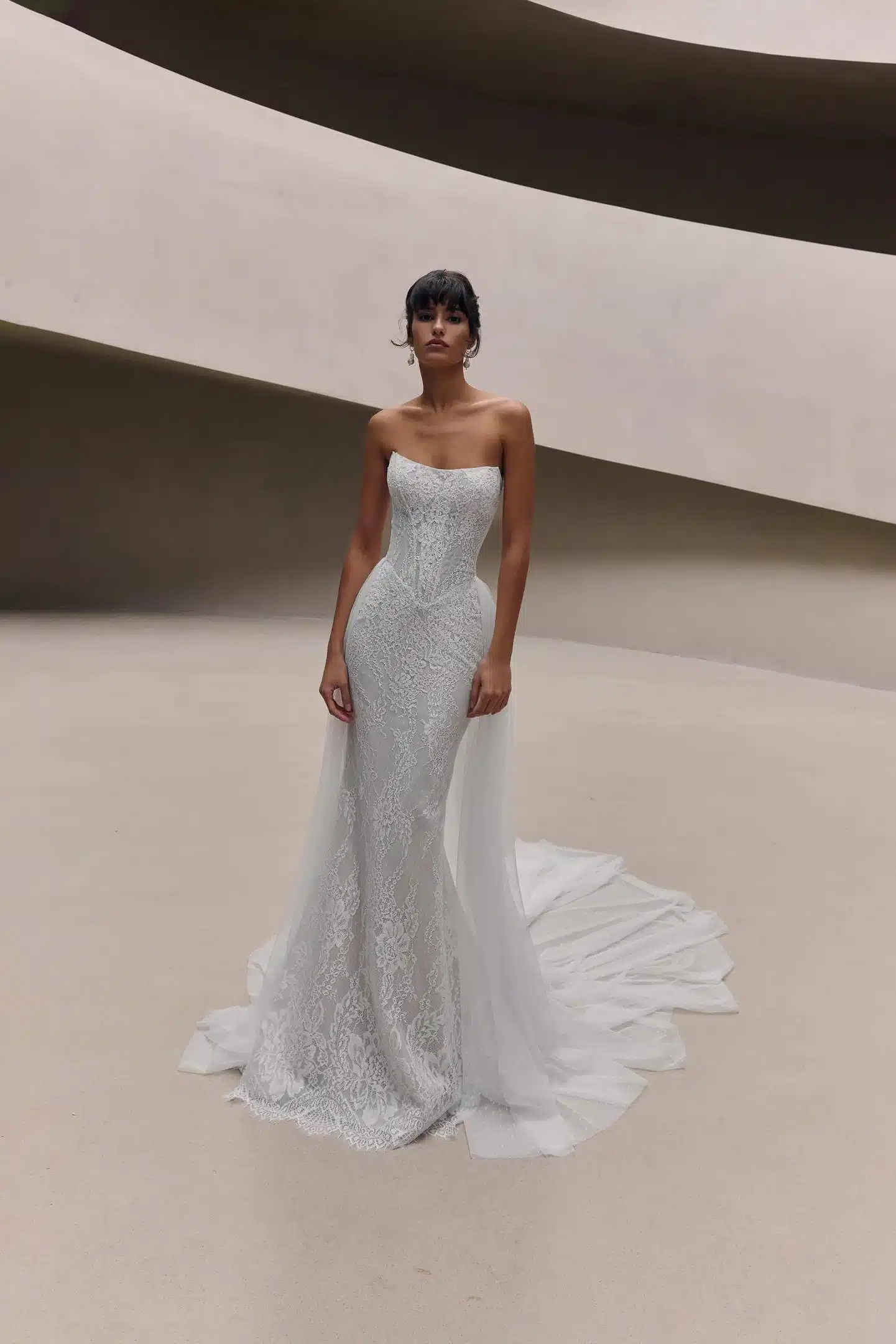Ein ärmelloses Brautkleid im Etuikleid-Stil aus zarter Chantilly-Spitze, verziert mit einer durchgehenden Reihe dekorativer Knöpfe am Rücken, die die Silhouette optisch verlängert und ein raffiniertes, romantisches Detail setzt. Kombiniere es mit der Olvaria-Schleppe, dem Schleier, den Handschuhen und dem Bolero, um einen harmonischen, mehrschichtigen Brautlook zu kreieren, der sich während der Feier mühelos verwandeln lässt.