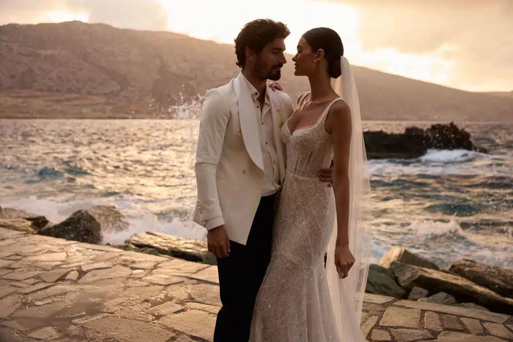 Zartes und zugleich auffälliges Meerjungfrauen-Brautkleid aus halbtransparenter Spitze, aufwendig verziert mit schimmernden Pailletten. Das Kleid verfügt über einen herzförmigen Ausschnitt, der von strukturierten Trägern eingerahmt wird, sowie ein Korsett-Oberteil mit integrierten Cups und sichtbaren halbtransparenten Einsätzen, die die Figur optisch betonen und für einen ultra-schicken Touch sorgen. Der figurbetonte Maxirock fällt mühelos mit einer nudefarbenen Unterlage und endet in einer zarten kurzen Schleppe.