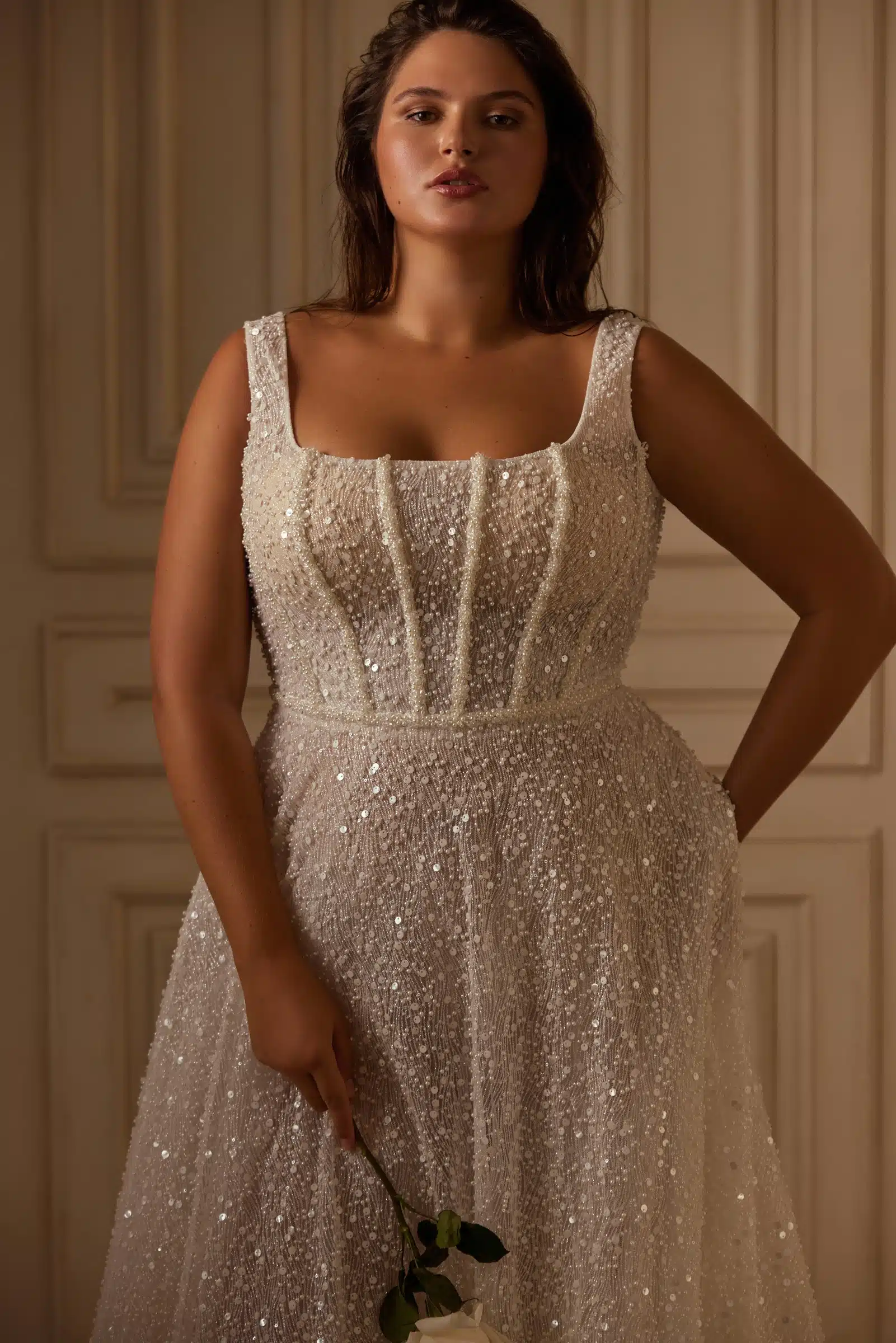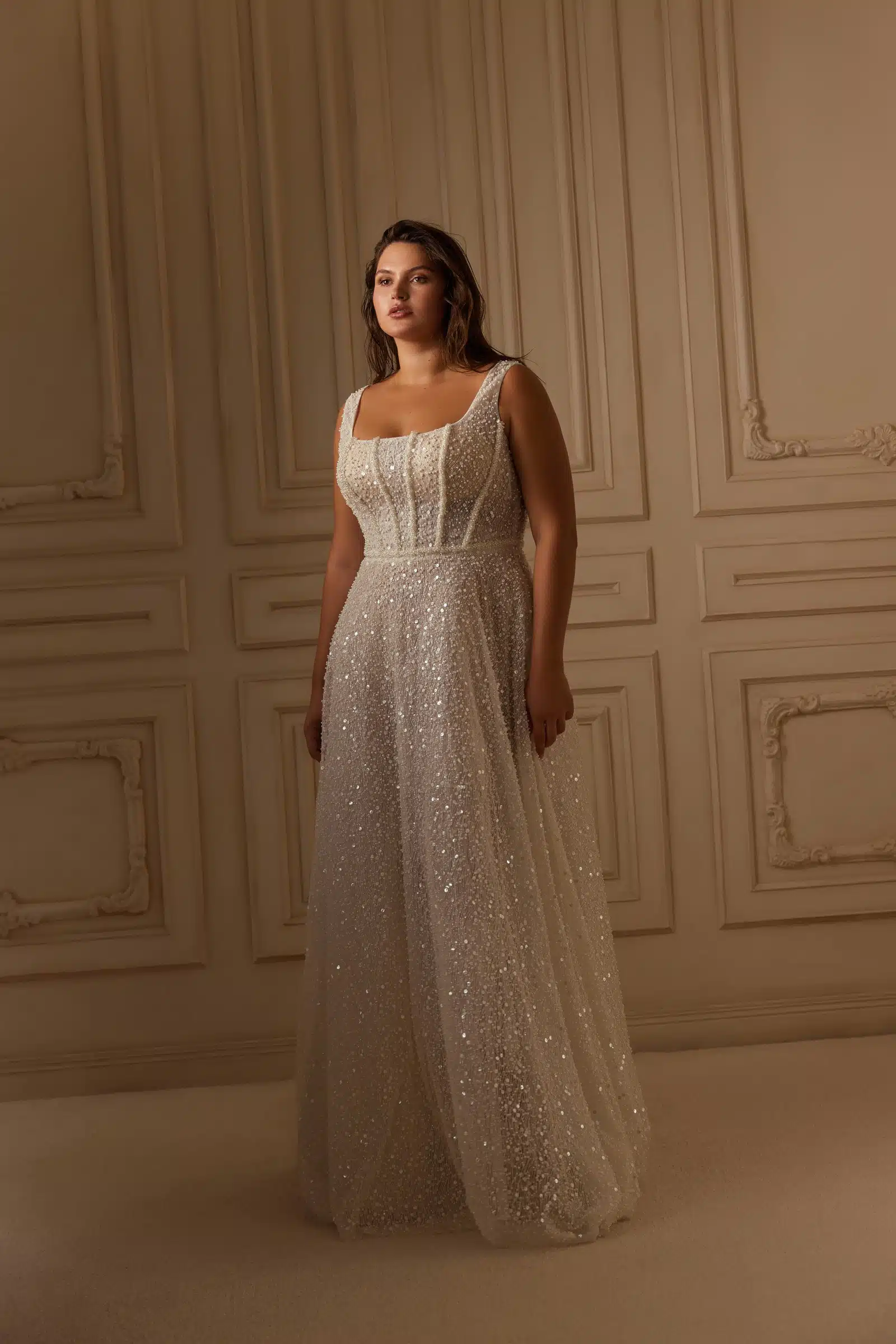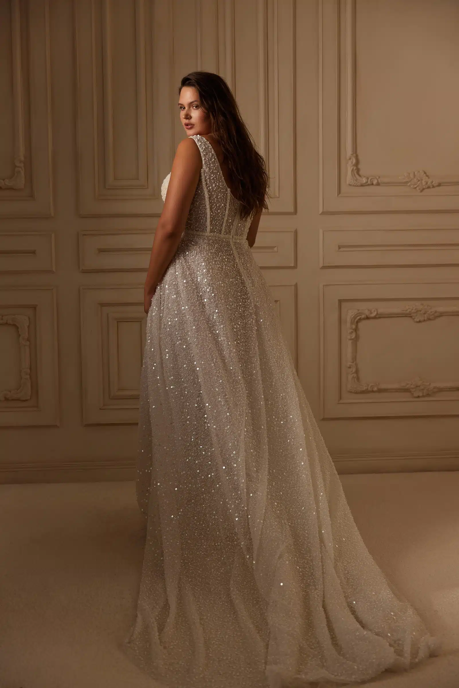 Dieses Hochzeitskleid besticht durch seine Eleganz und sein raffiniertes Design. Das Mieder ist im Korsettstil mit breiten Trägern gearbeitet und bietet zuverlässigen Halt und Komfort. Der schimmernde, mit Pailletten und zarter Spitze verzierte Stoff wirkt luxuriös und unterstreicht jede Bewegung der Braut. Der ausgestellte Rock fällt anmutig herab und verleiht dem Look Leichtigkeit und Anmut. Dieser Stil betont die Taille und betont die Silhouette, so dass sich die Braut selbstbewusst und strahlend fühlt. Es ist die ideale Wahl für alle, die eine Mischung aus klassischem und modernem Stil suchen.