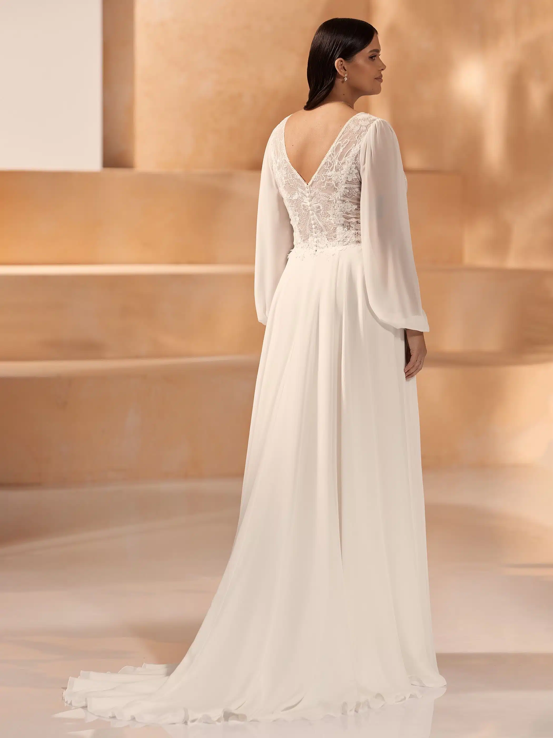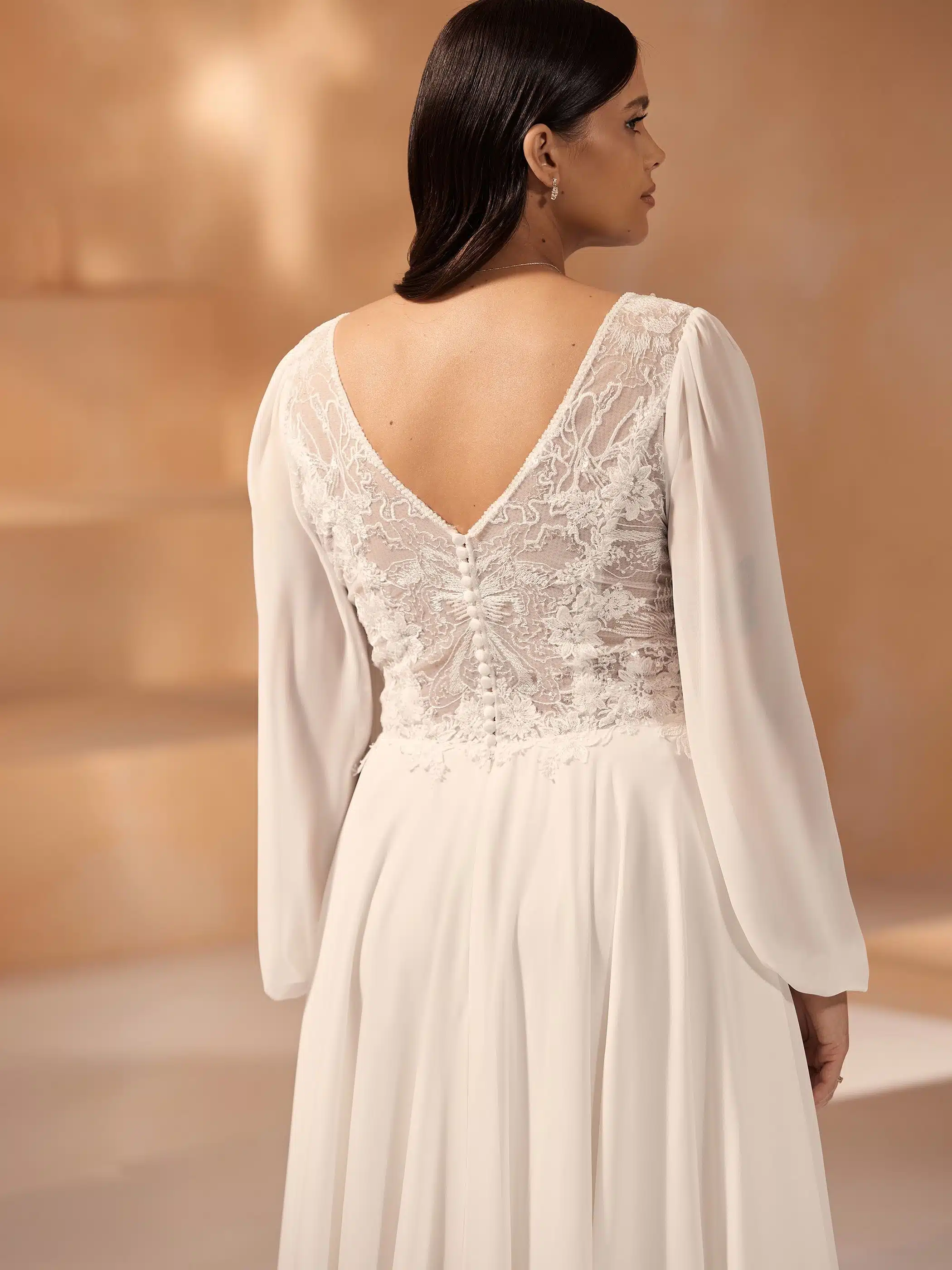 Ein modernes Standesamtkleid in A-Linie ist perfekt für Bräute, die lange Ärmel bevorzugen. Dieses Kleid hat sowohl vorne als auch hinten einen V-Ausschnitt und ist mit floraler Spitze bestickt.