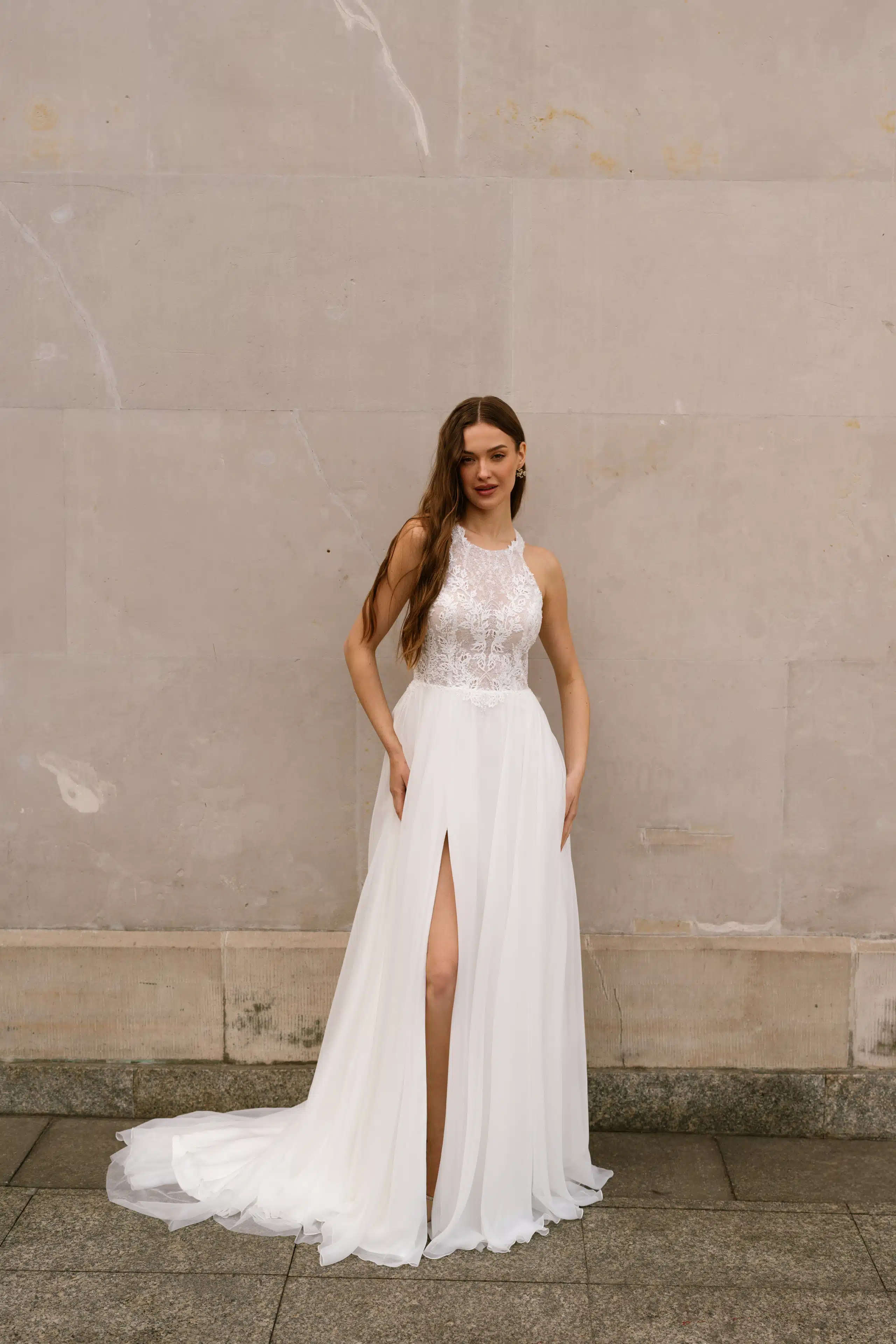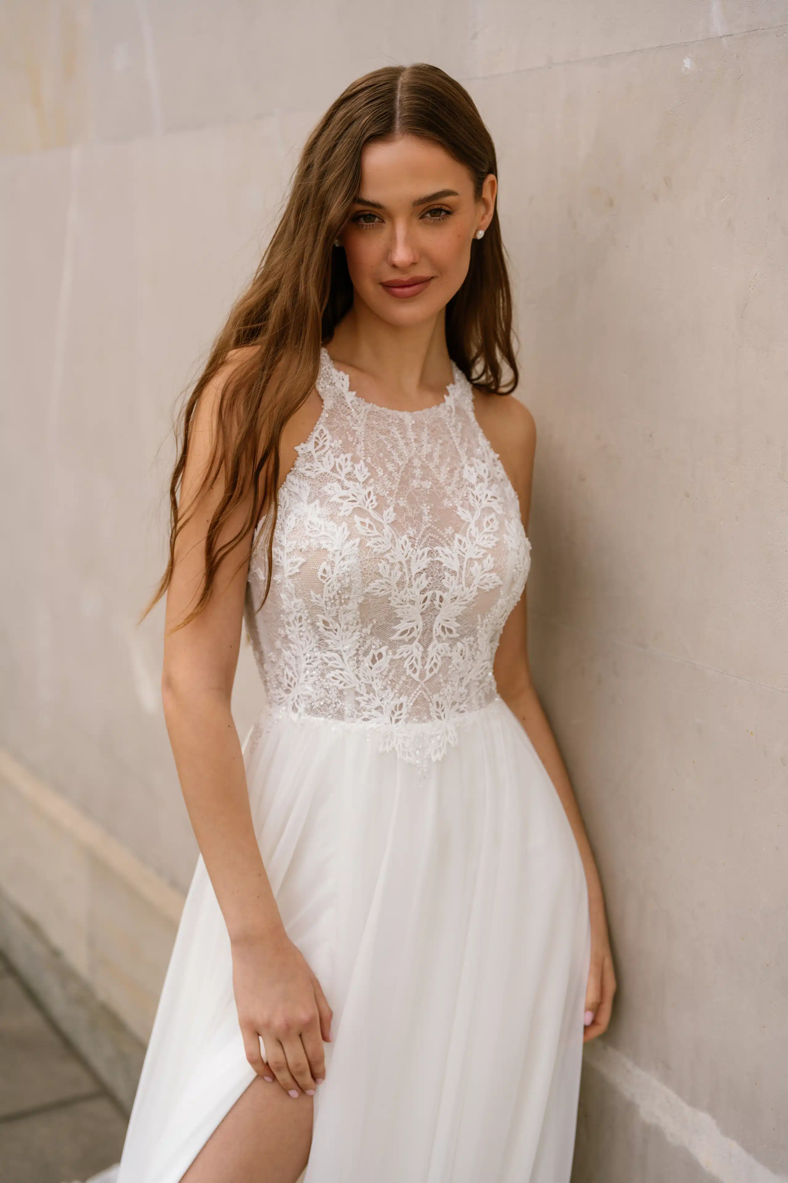Dieses Brautkleid vereint zeitlose Romantik mit modernem Flair. Das Oberteil aus zarter Spitze sitzt wie eine zweite Haut, während der Neckholder-Ausschnitt die Schultern elegant betont. Der fließende Chiffonrock mit seitlichem Schlitz sorgt für traumhafte Bewegungsfreiheit. Ein raffiniertes Highlight ist der Schlüssellochausschnitt im Rücken – subtil verführerisch und absolut unvergesslich.