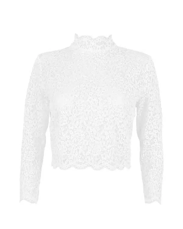 Dieses Crop Top ist dank seiner floralen Spitze das ideale Brautoberteil für alle, die ihrem Hochzeitslook eine romantischen Touch verleihen möchten. Es hat eine hochwertige Spitze für einen romantischen, modernen Look, welche die Haut sanft durchschimmern lässt. Ein hoher Stretch-Anteil sorgt für einen optimalen Tragekomfort. Der kleine Kragen und die 3/4-Ärmel verleihen dem Top ein modernes Design und die betonten Schultern sorgen für eine elegante Silhouette. Das Top ist ungefüttert, wir empfehlen dir daher, darunter einen hautfarbenen BH zu tragen. Es ist vielseitig tragbar – auch nach der Hochzeit z. B. zu einer High Waist Jeans – und ist in Portugal hergestellt.