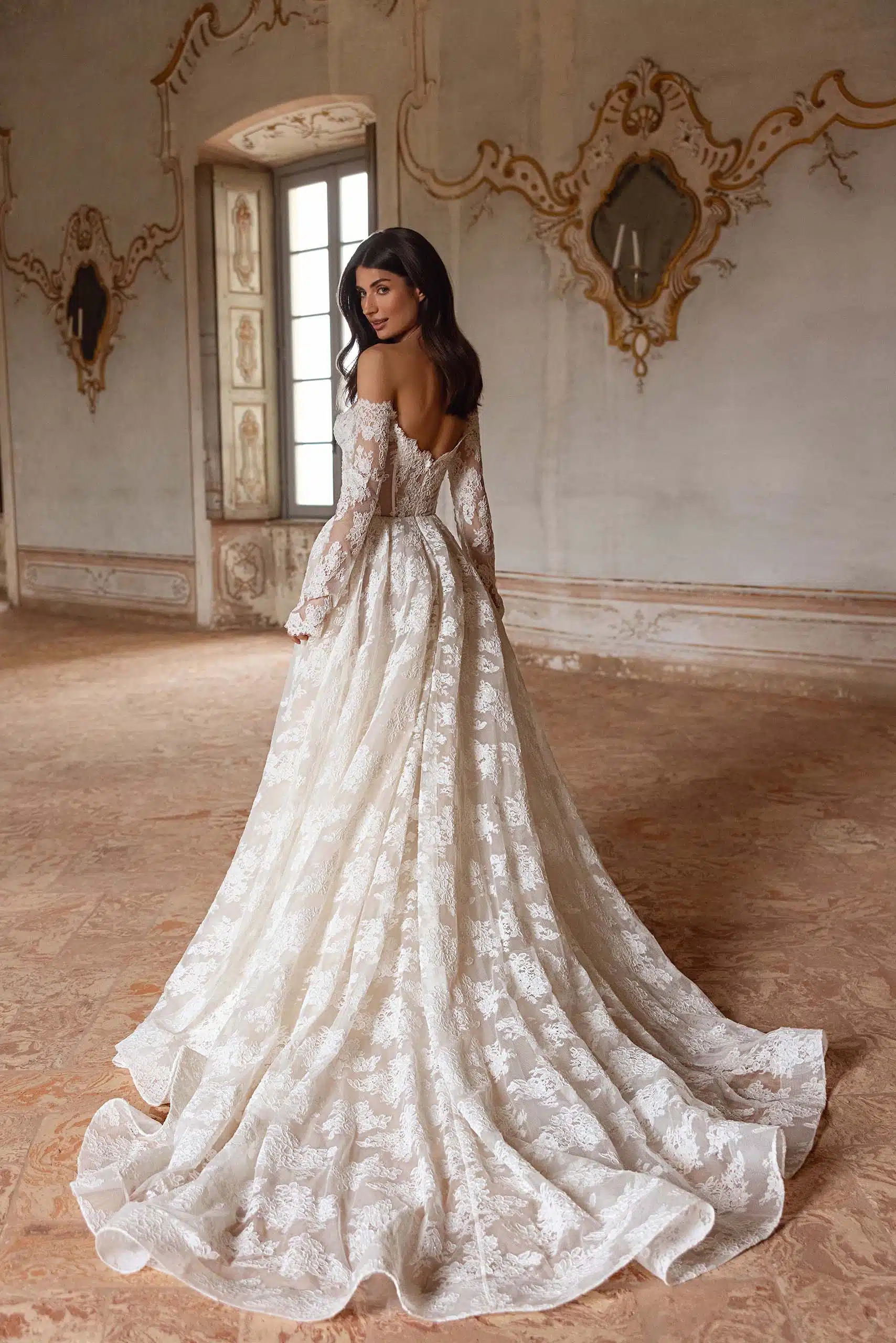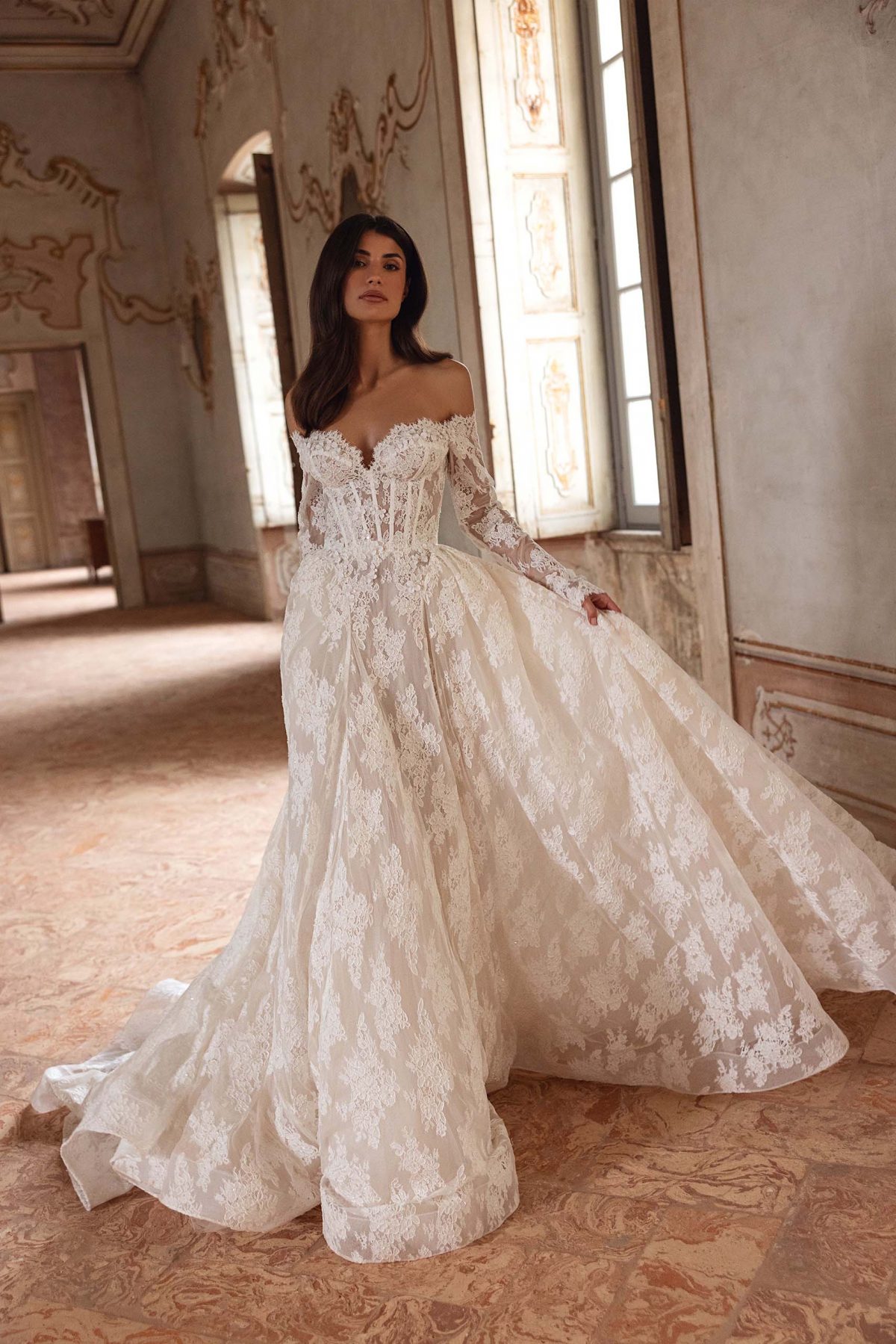 Dieses Off-Shoulder-Brautkleid mit langen Ärmeln vereint Romantik und moderne Eleganz. Der Herzausschnitt und die formgebende Stäbchen-Korsage setzen das Dekolleté perfekt in Szene, während die All-Over-Spitze einen edlen, zeitlosen Look kreiert. Der ausfallende Rock sorgt für eine atemberaubende Silhouette – für einen Auftritt, der unvergesslich bleibt.