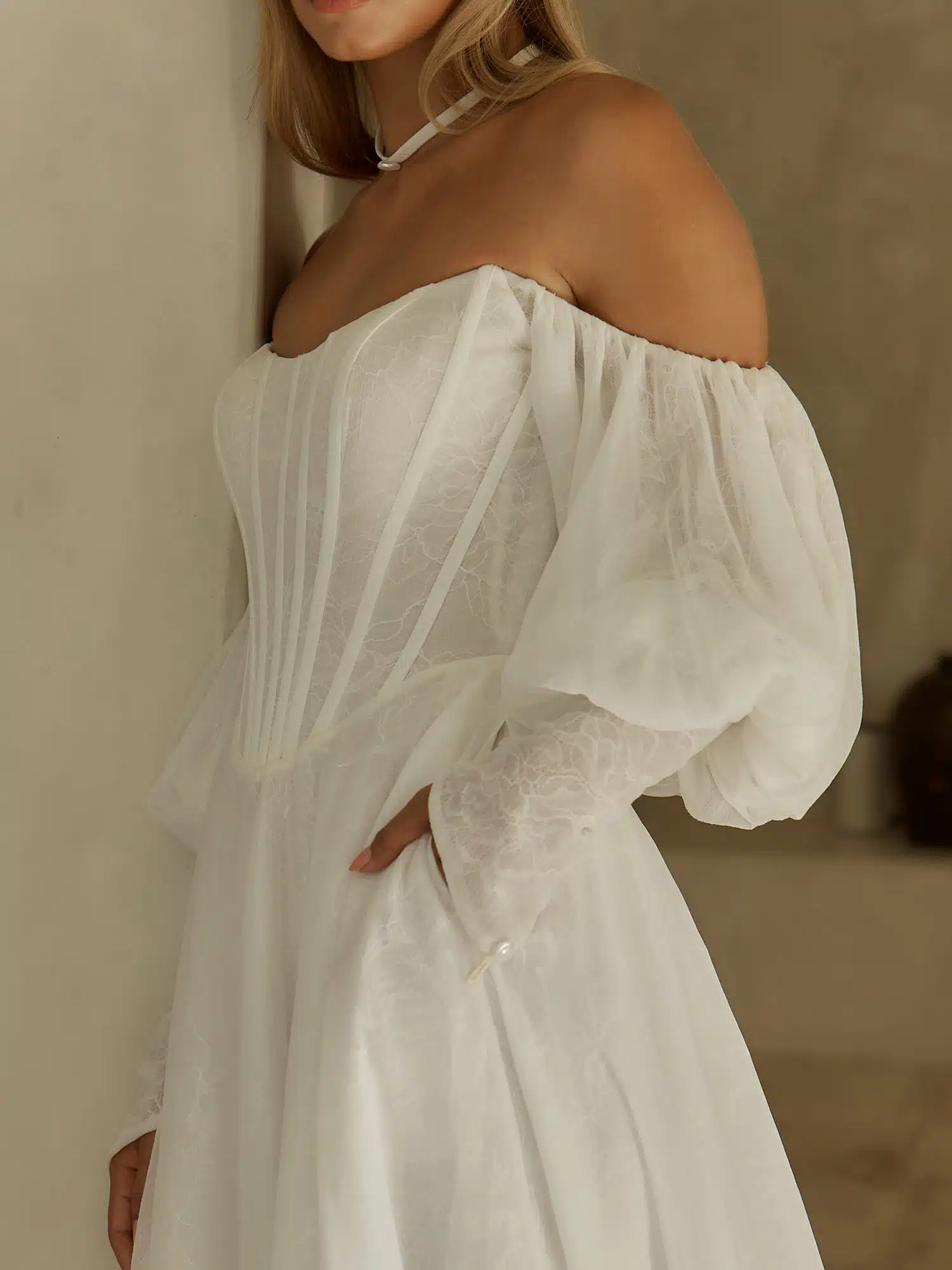 Das Brautkleid „Sam“ ist sowohl romantisch als auch dramatisch – ideal, um einen unvergesslichen Auftritt als Braut zu hinterlassen. Aus Chiffon gefertigt und mit Chantilly-Spitze überlagert, um einen weichen, strukturierten Look zu erzielen. Ein spitzer, runder Ausschnitt verleiht dem Oberteil eine moderne Form, die sich in den voluminösen, schulterfreien Blouson-Ärmeln fortsetzt. Diese einzigartigen Ärmel sind am Unterarm mit einer Manschette versehen, laufen spitz zu und bedecken die Hand. Das Oberteil ist transparent und illusionär gestaltet, mit sichtbaren Stäbchen. Deren Linien betonen die Figur durch die baskische Taille und sorgen für eine schmeichelhafte Silhouette. Ein A-Linien-Rock mit flacher Vorderseite erhält am Saum weiches Volumen, wodurch der Look luftig und doch opulent wirkt. Er erstreckt sich am Rücken zu einer vollen Schleppe, die durch eine vertikale Knopfreihe abgerundet wird. Abgerundet wird der Look durch einen Rückenausschnitt im Korsettstil mit Schnürung, der klassisch und sinnlich wirkt. Gleichzeitig ermöglicht er es, die Taille noch weiter zu betonen.
