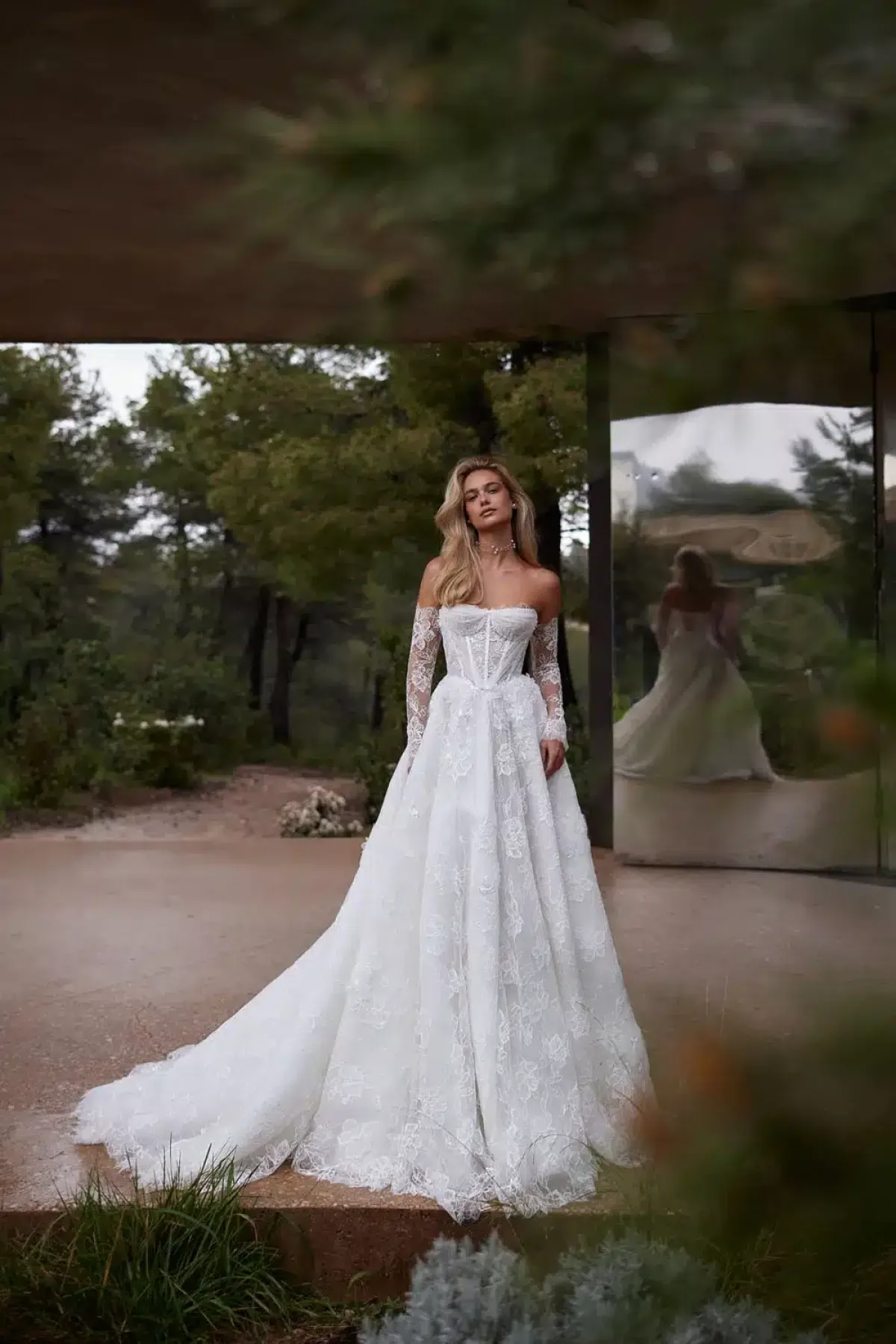 Lassen Sie sich von unserem A-Linien-Brautkleid verzaubern und in Romantik versetzen. Es ist aufwendig aus Spitze gefertigt, mit schimmernden floralen Details verziert und besticht durch einen Herzausschnitt und ein Schnürkorsett, das Ihre Kurven betont. Das Korsett zeichnet sich durch zarte Drapierungen und eine minimalistische Schleife in der Mitte der Taille aus. Die abnehmbaren langen Ärmel aus derselben Spitze bieten Vielseitigkeit und Anmut.