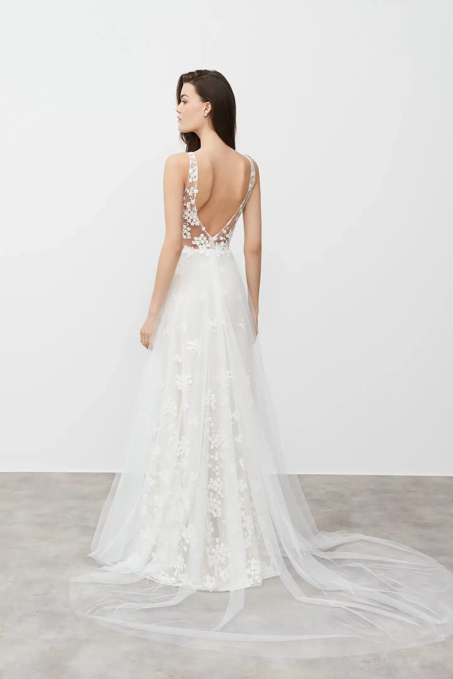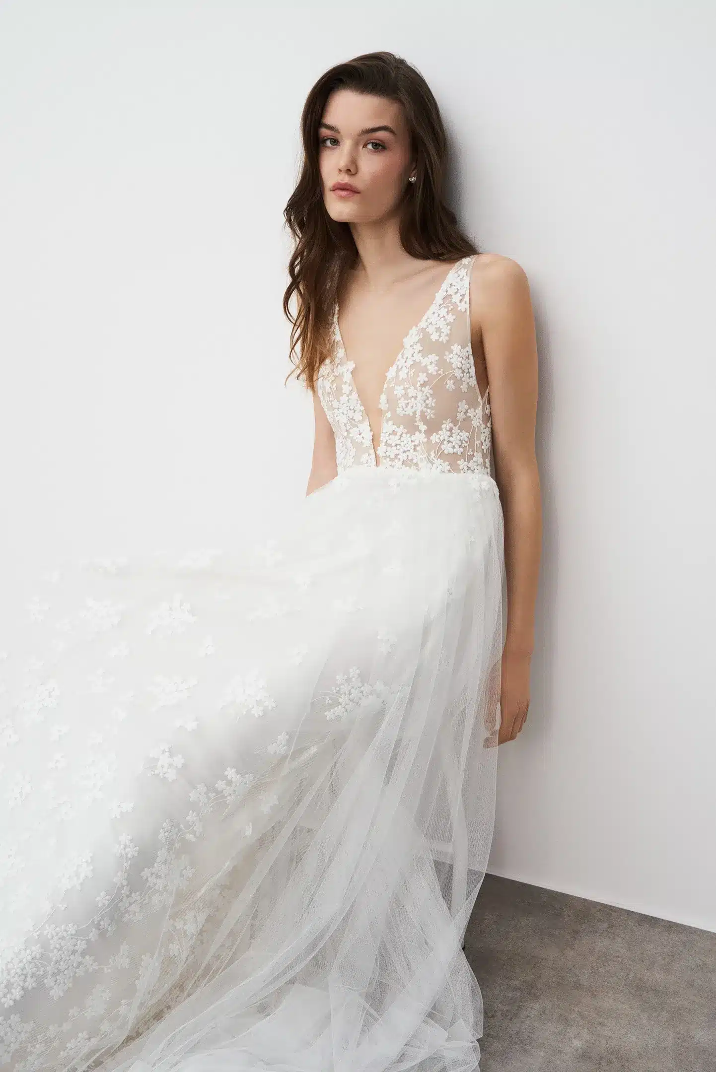 Dieses Kleid ist von oben bis zum Saum mit dezenten Blumenstickereien verziert, hat eine anmutige A-Linien-Silhouette und einen tiefen V-Ausschnitt und ist die perfekte Kombination aus Frische und purer Eleganz.