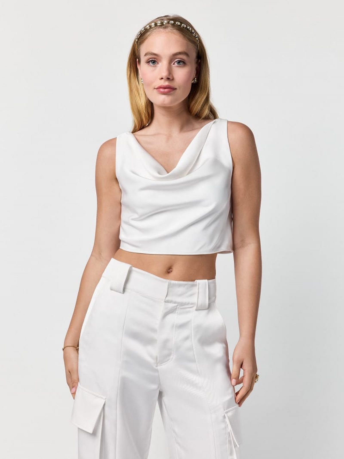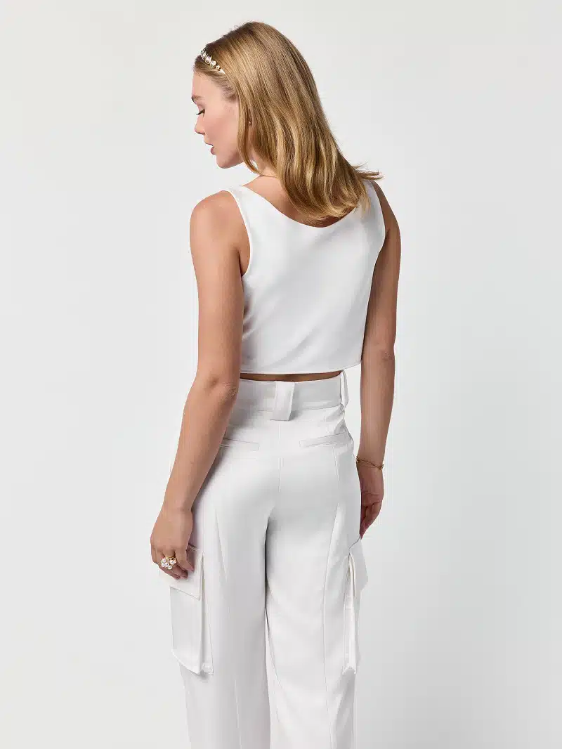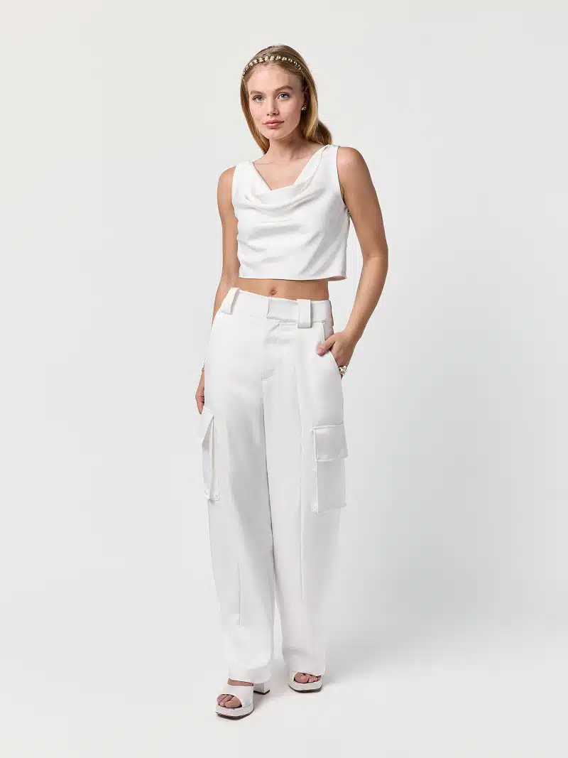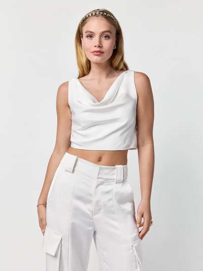 Elegantes Top aus mattem Satin. Das cremefarbene Top besticht durch einen fließenden Wasserfall-Ausschnitt und einen dezenten Seitenreißverschluss für eine perfekte Passform. Ein minimalistisches, zugleich luxuriöses Statement für jeden Anlass.