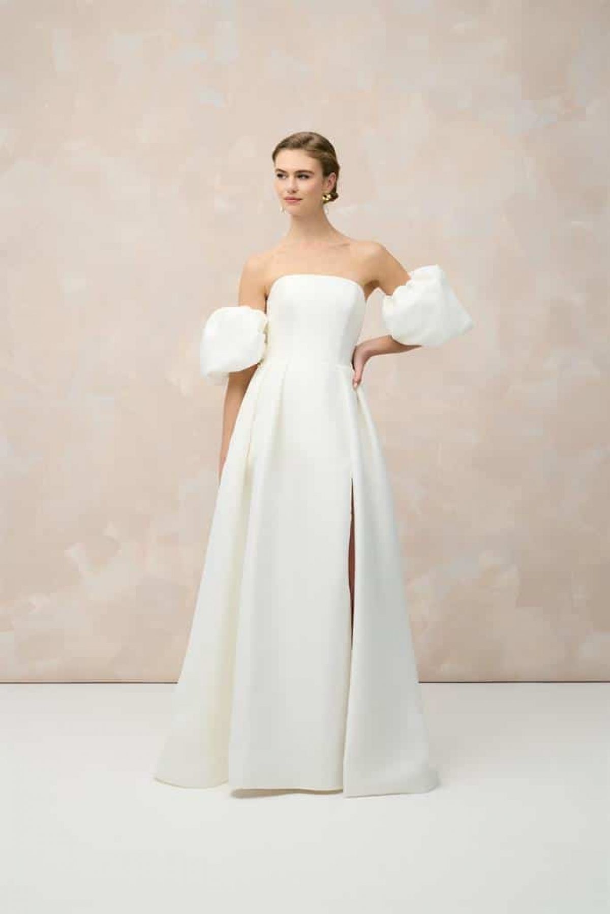 The Power Of Love 2 ist ein trägerloses A-Linien-Kleid mit Taschen aus klar strukturiertem Mikado. Der Rock hat Falten an der Taille für mehr Dimension, einen Schlitz vorne und eine Kapellenschleppe. Dazu passen abnehmbare Ballonärmel.