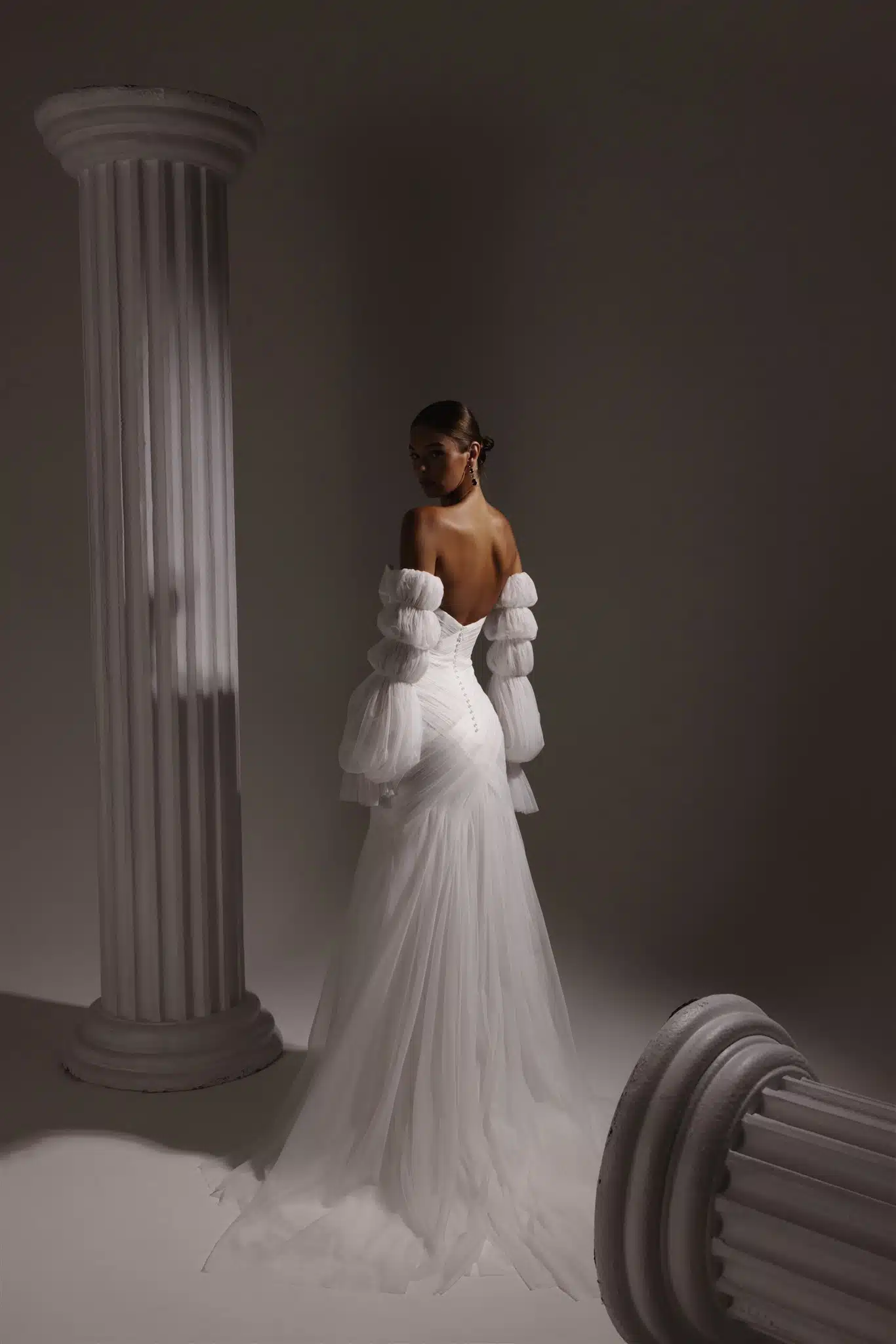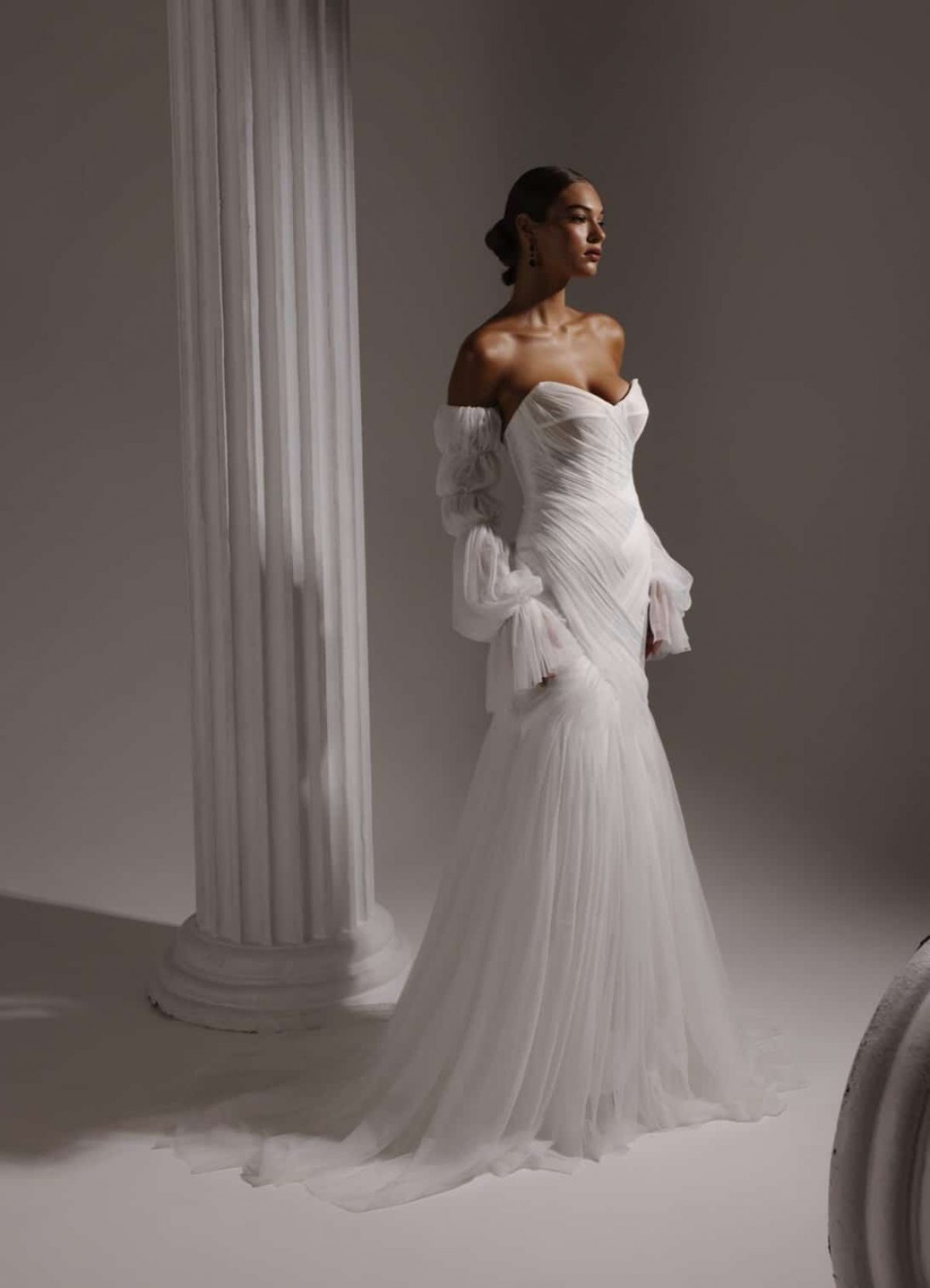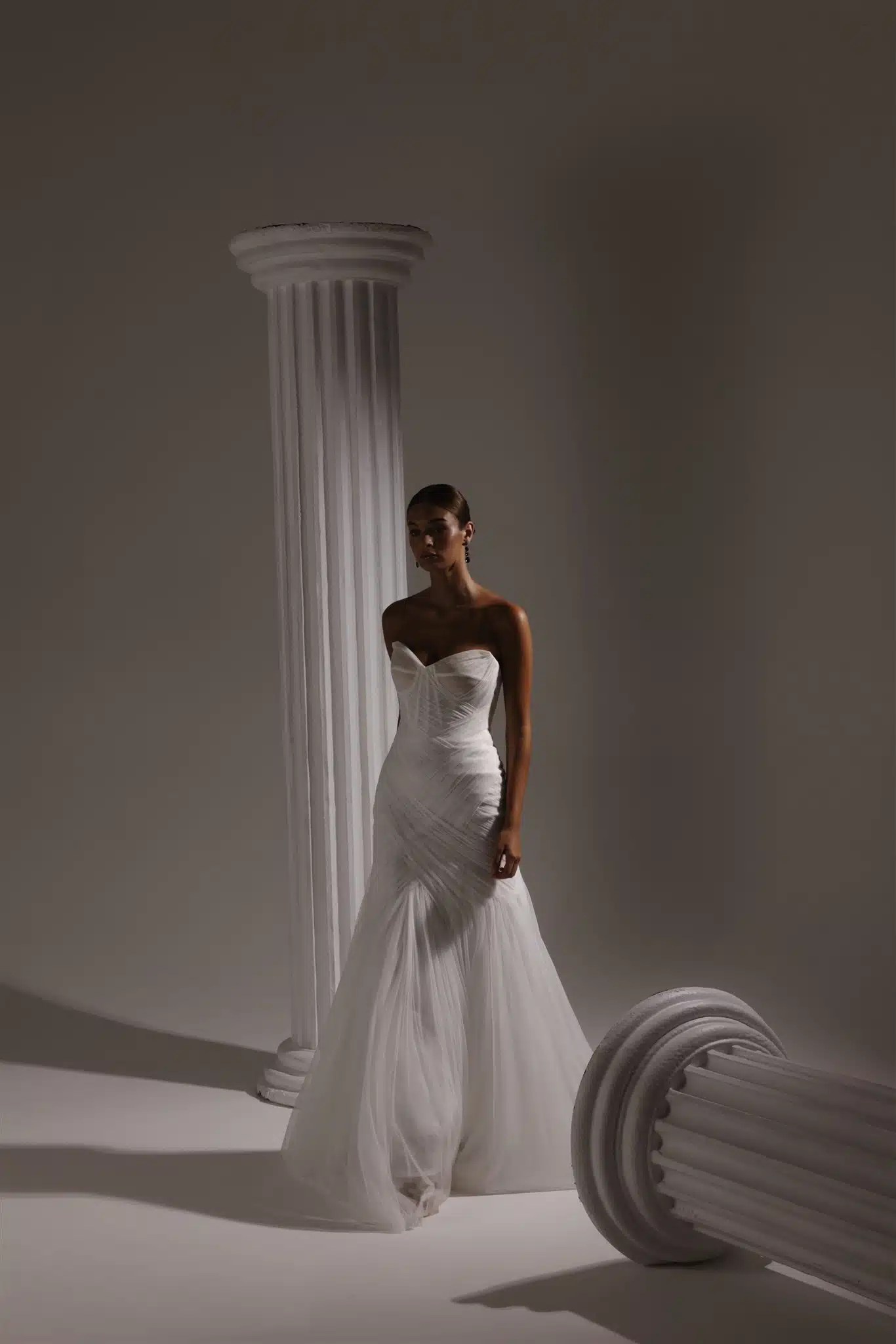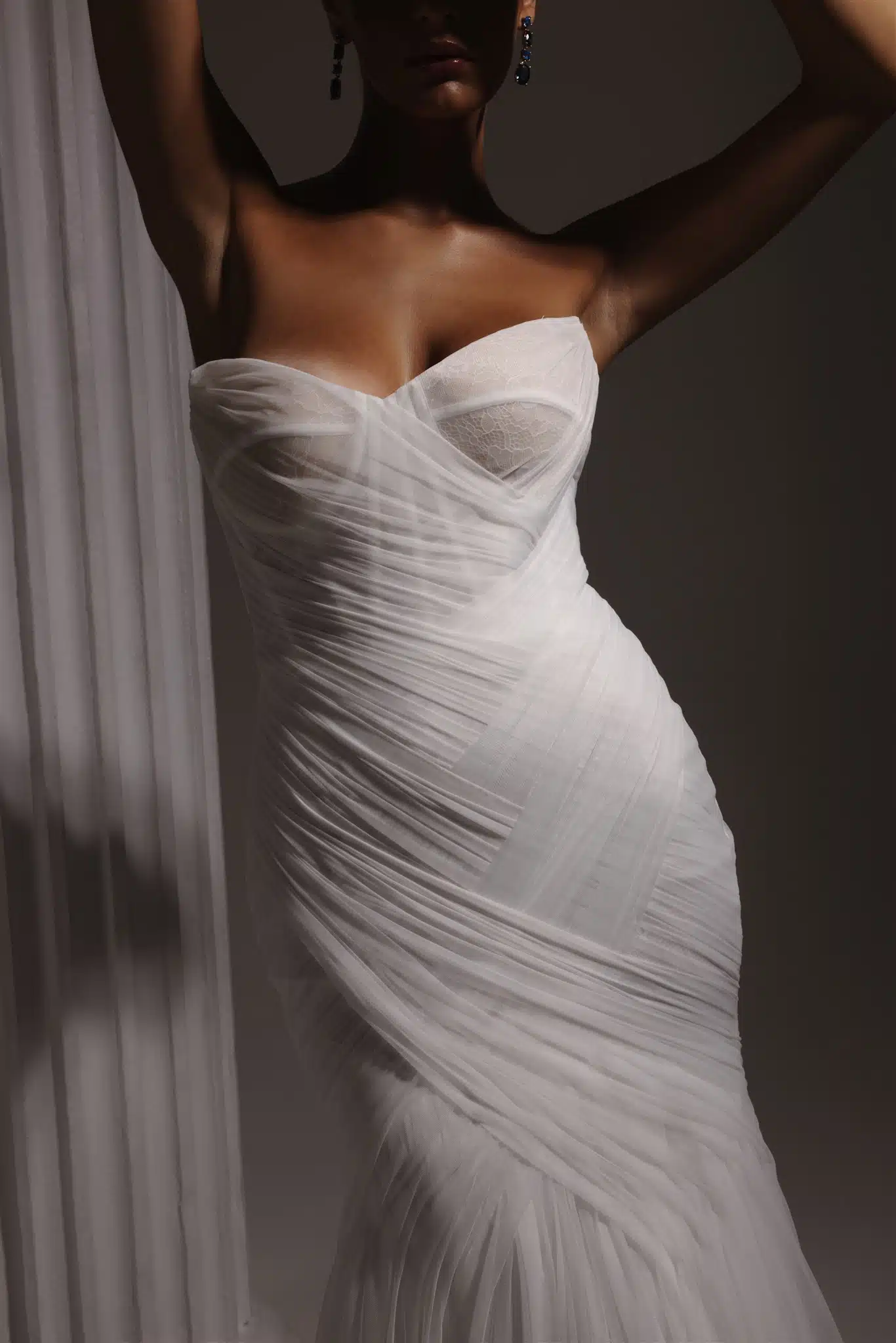 Vienna ist so gefertigt, dass es sich perfekt an den Körper anschmiegt. Ein Mieder mit Stäbchen gibt Halt und wird am Rücken mit Kunstperlen befestigt, während weicher Tüll fachmännisch in präzisen Winkeln zusammengewebt wird, um die Kurven der Brautfigur zu ergänzen. Eine Schicht Chantilly-Spitze sorgt für einen Hauch von Sexappeal, bevor der geraffte Tüll in sanfte Falten fällt und einen romantischen Meerjungfrauen-Rock bildet.
