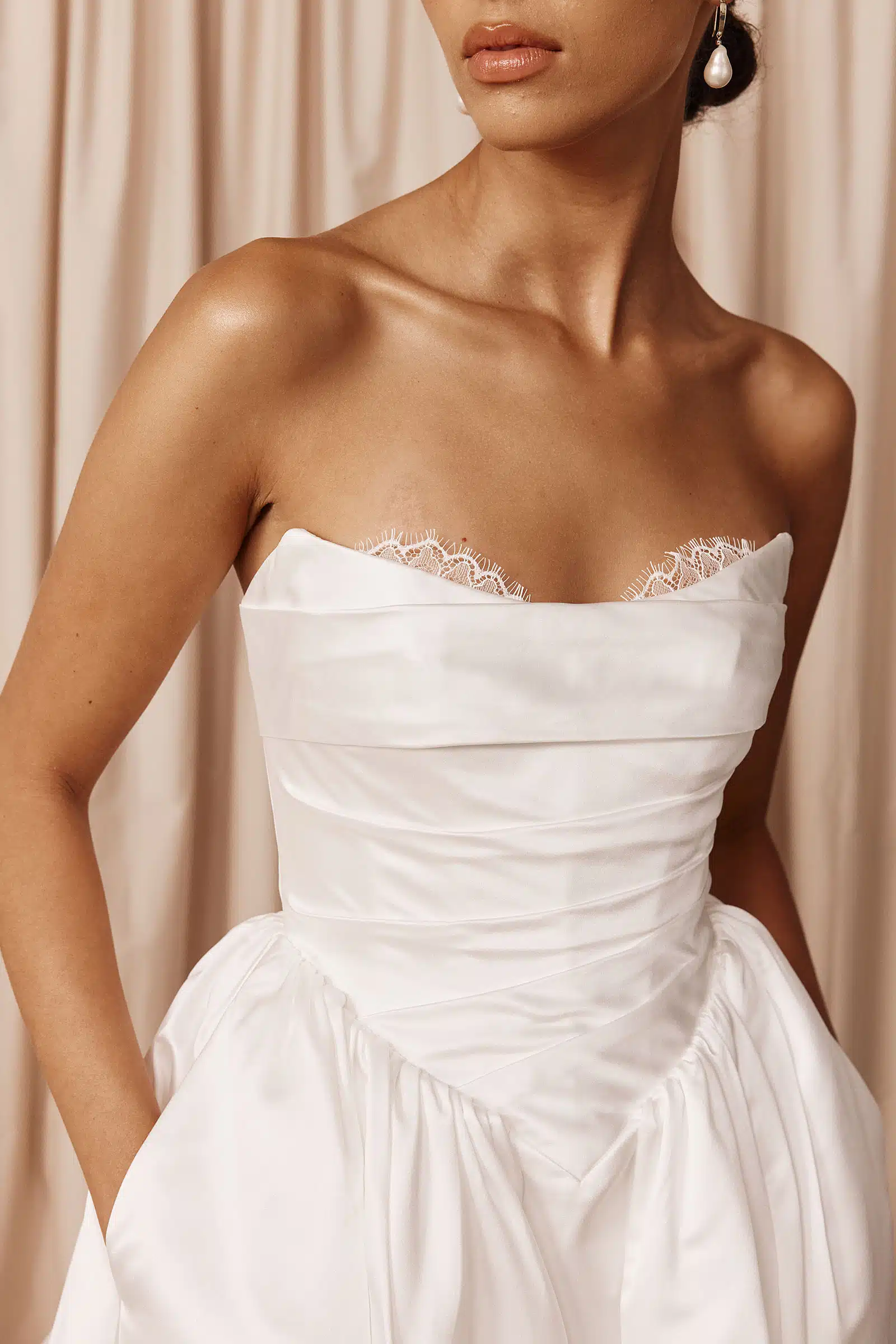 Eine geformte baskische Taille, die von der Romantik der alten Welt und moderner Anmut erzählt. Vittoria wurde geschaffen, um einen glanzvollen Auftritt zu machen. Dieses Brautkleid mit baskischer Taille wurde entworfen, um zeitlos und unabhängig von Trends zu sein. Es ist aus unserem leuchtenden Mikado-Satin gefertigt – einem modernen, glänzenden Stoff mit einem reichhaltigen, schweren Fall für ein edles Finish. Der strukturierte und dennoch weiche Stoff hält, schmeichelt und bewegt sich mit Leichtigkeit und verleiht Vittoria seine charakteristische Balance zwischen Drama und Mühelosigkeit. Der Cat-Eye-Ausschnitt wird durch stützende Innenverstärkungen definiert und bildet einen schicken Kontrast zum voluminösen Rock. Mit zarten Spitzenbesätzen für einen Hauch von Vintage-Romantik ist Vittoria verspielt, feminin und wunderschön zeitlos.