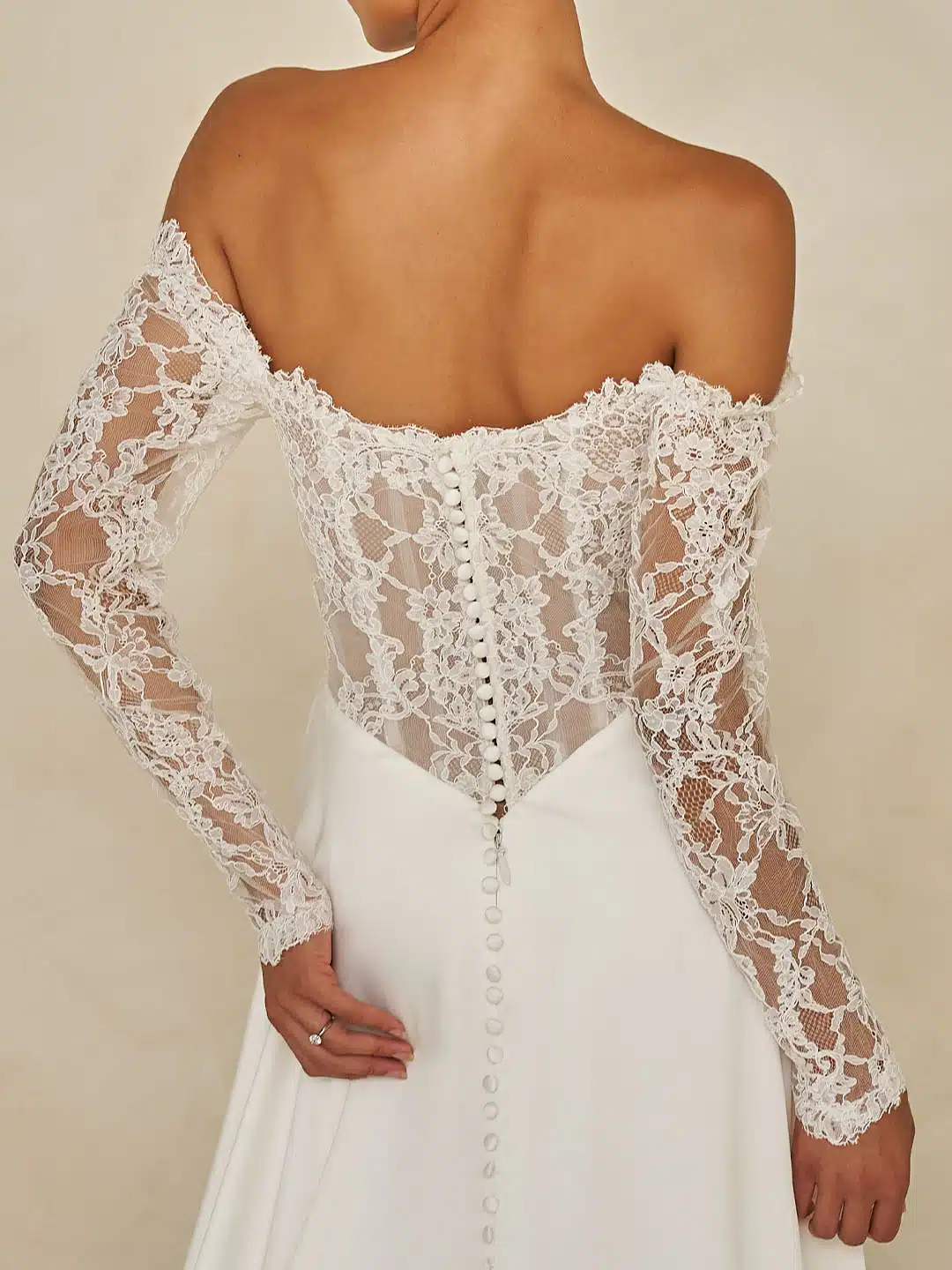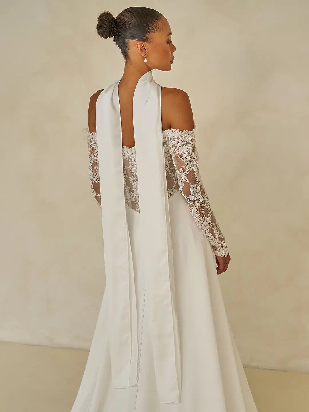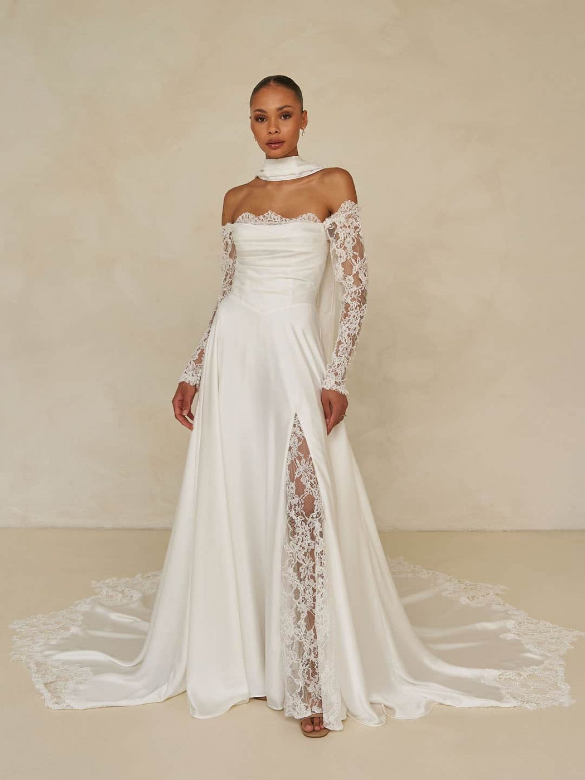 Mühelos schick und endlos romantisch vereint das Ward-Hochzeitskleid schlanke Minimalismus mit von Couture inspirierten Details. Der fließend fallende Satinrock öffnet sich an einem Oberschenkel-hohen Schlitz und enthüllt ein unerwartetes Flüstern traditioneller Chantilly-Spitze. Ein moderner, quadratischer, schulterfreier Ausschnitt fließt in ein sanft drapiertes Mieder, das mit zarter Spitze eingefasst ist. Ein Echo der Spitze, die die abnehmbaren Ärmel ziert und in eine verführerische trägerlose Option verwandelt. Eine raffinierte Basken-Taille betont die Silhouette, während ein passender Satinschal einen letzten Hauch zeitgenössischer Eleganz verleiht. Das Ward-Hochzeitskleid ist eine meisterhafte Balance aus klaren Linien und texturalem Kontrast, eine zeitgenössische Neuinterpretation eines zeitlosen Stils.