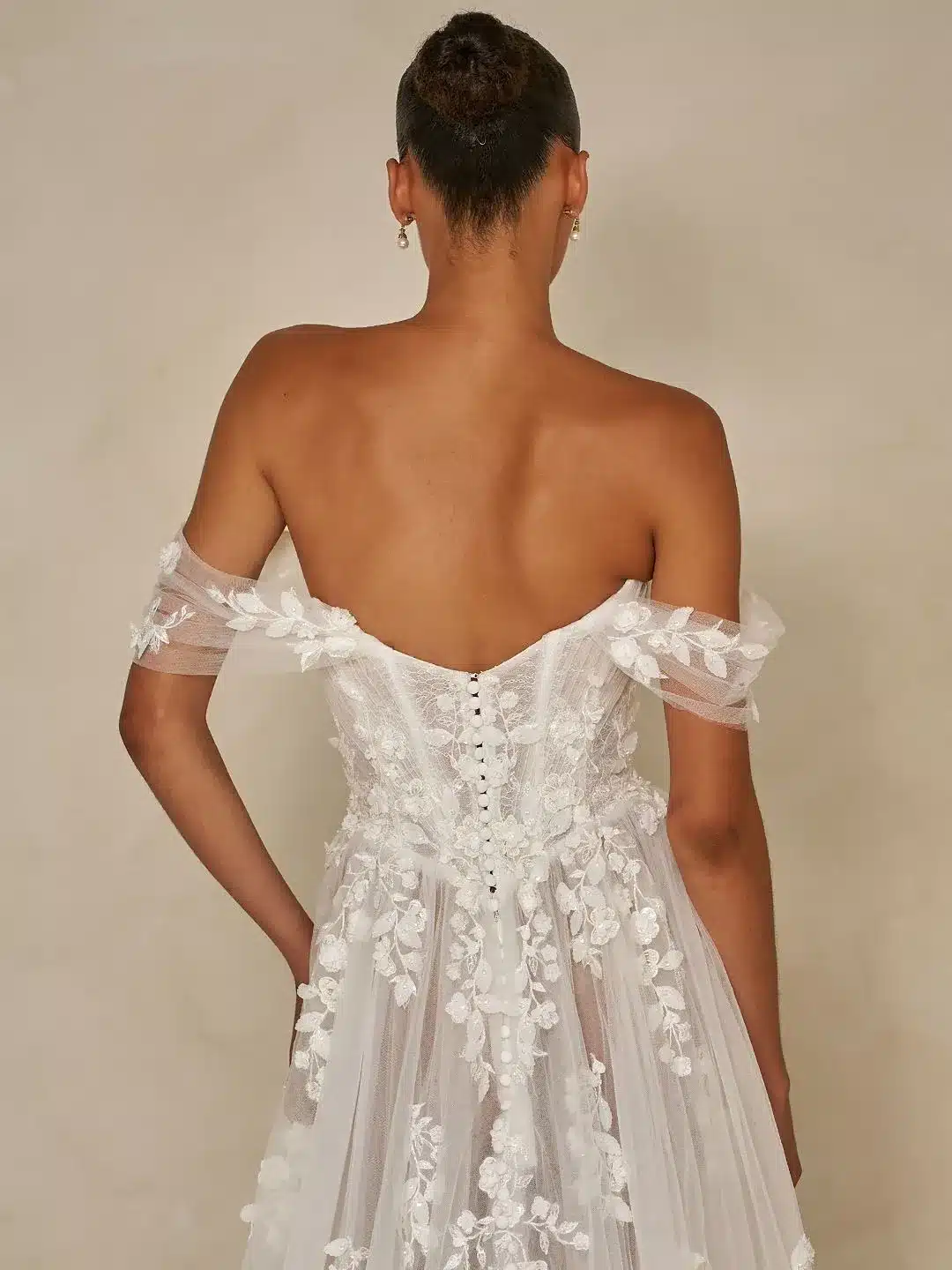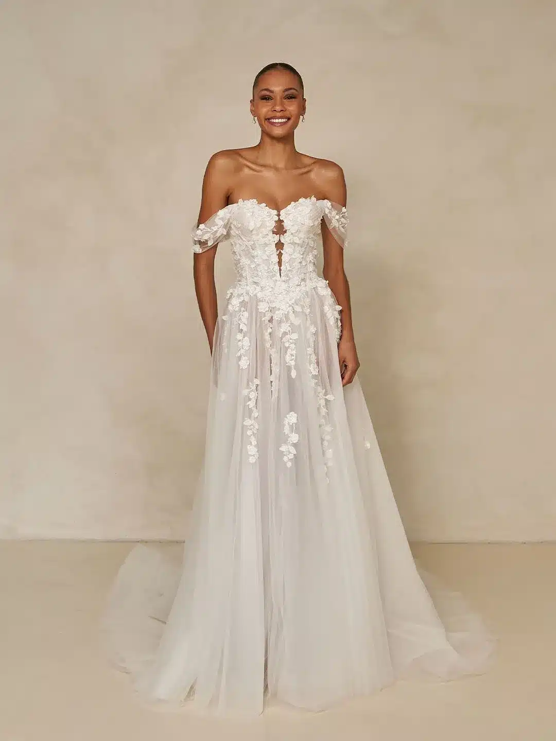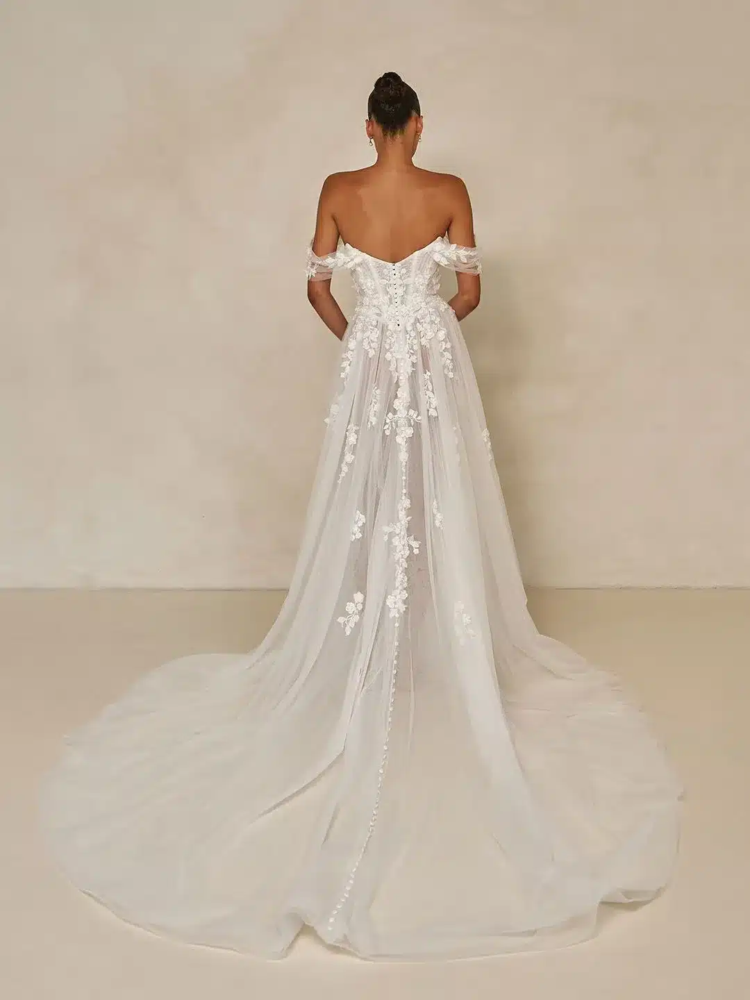 Das Watkins-Brautkleid ist die Verkörperung von weicher, texturierter Romantik. Ihr Mieder ist mit zarten 3D-Blumenstickereien verziert. Jede Blüte liegt über paillettenbesetzter Chantilly-Spitze und verleiht ihr eine subtile Dimension und leuchtende Tiefe. Ein sanft geformter tiefer Ausschnitt, feine asymmetrische Falten und eine moderne Baskentaille umschmeicheln die Figur. Die versteckte Struktur darunter sorgt für eine schöne, geschlossene Silhouette. Der mehrlagige Tüllrock von Watkins schwebt sanft bei jedem Schritt und verleiht dem Look Leichtigkeit und Anmut. Abnehmbare, schulterfreie Träger sorgen für ein vielseitiges Styling: Sie können romantisch drapiert werden oder auf den Schultern sitzen, je nachdem, was gerade angesagt ist. Das Kleid wird mit einer Reihe zierlicher Knöpfe und einer fließenden Schleppe vollendet.