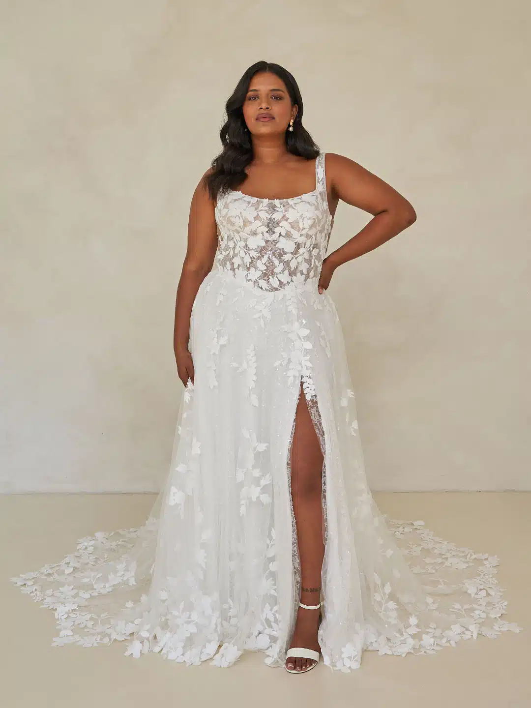 Ein schlichter quadratischer Ausschnitt gleicht die sinnlichen Illusions-Seitenteile aus und sorgt für eine raffinierte Interpretation von Sinnlichkeit. Mehrlagige Pailletten-Chantilly-Spitze und luftiger Tüll verleihen dem voluminösen Rock Tiefe und Dimension.