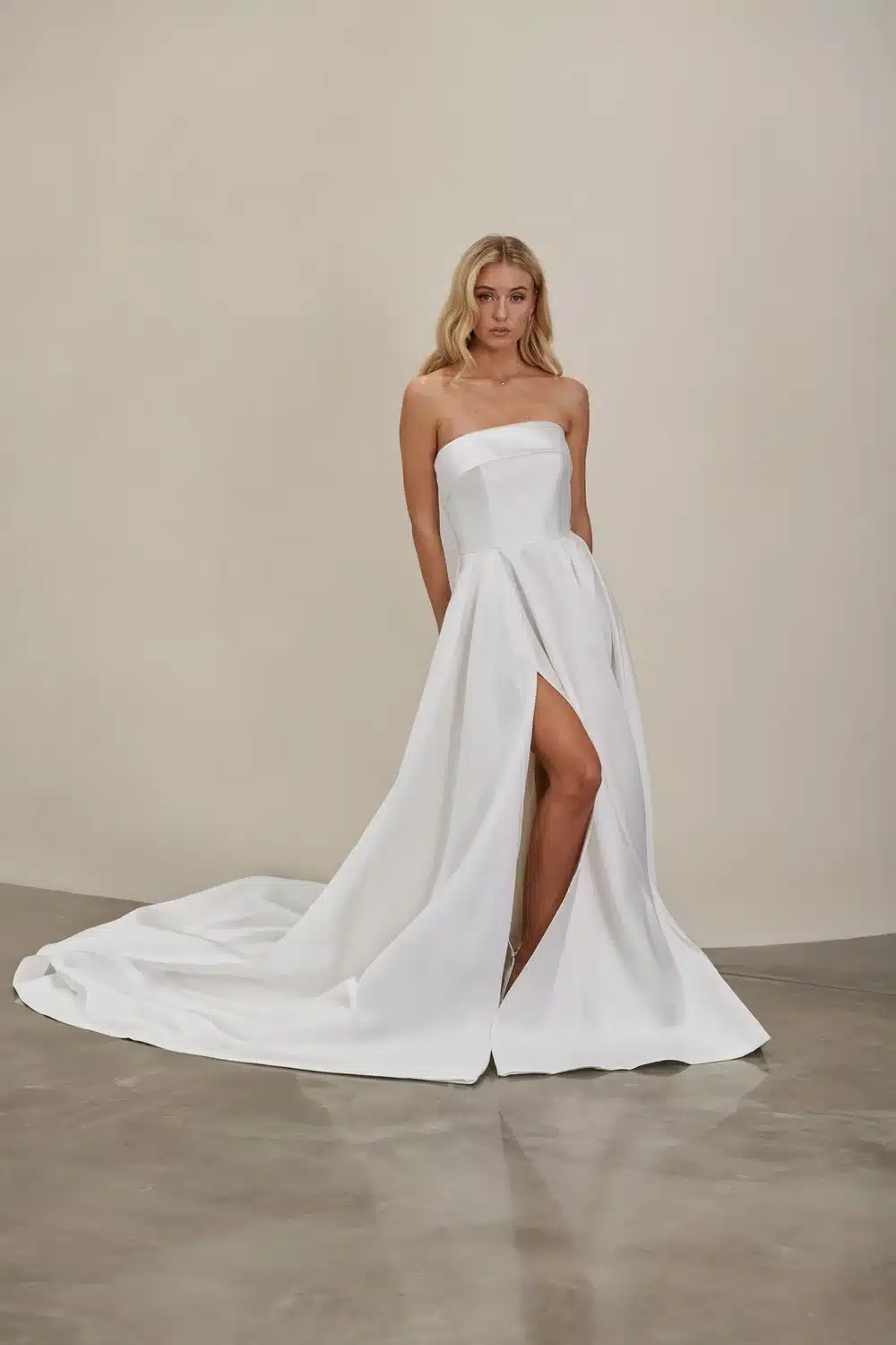 Ein atemberaubendes trägerloses Kleid mit einer A-Linien-Silhouette. Das Mieder und der Rock bilden ein klassisches und schmeichelhaftes Kleid. Am Rock befinden sich Taschen sowie ein Schlitz.