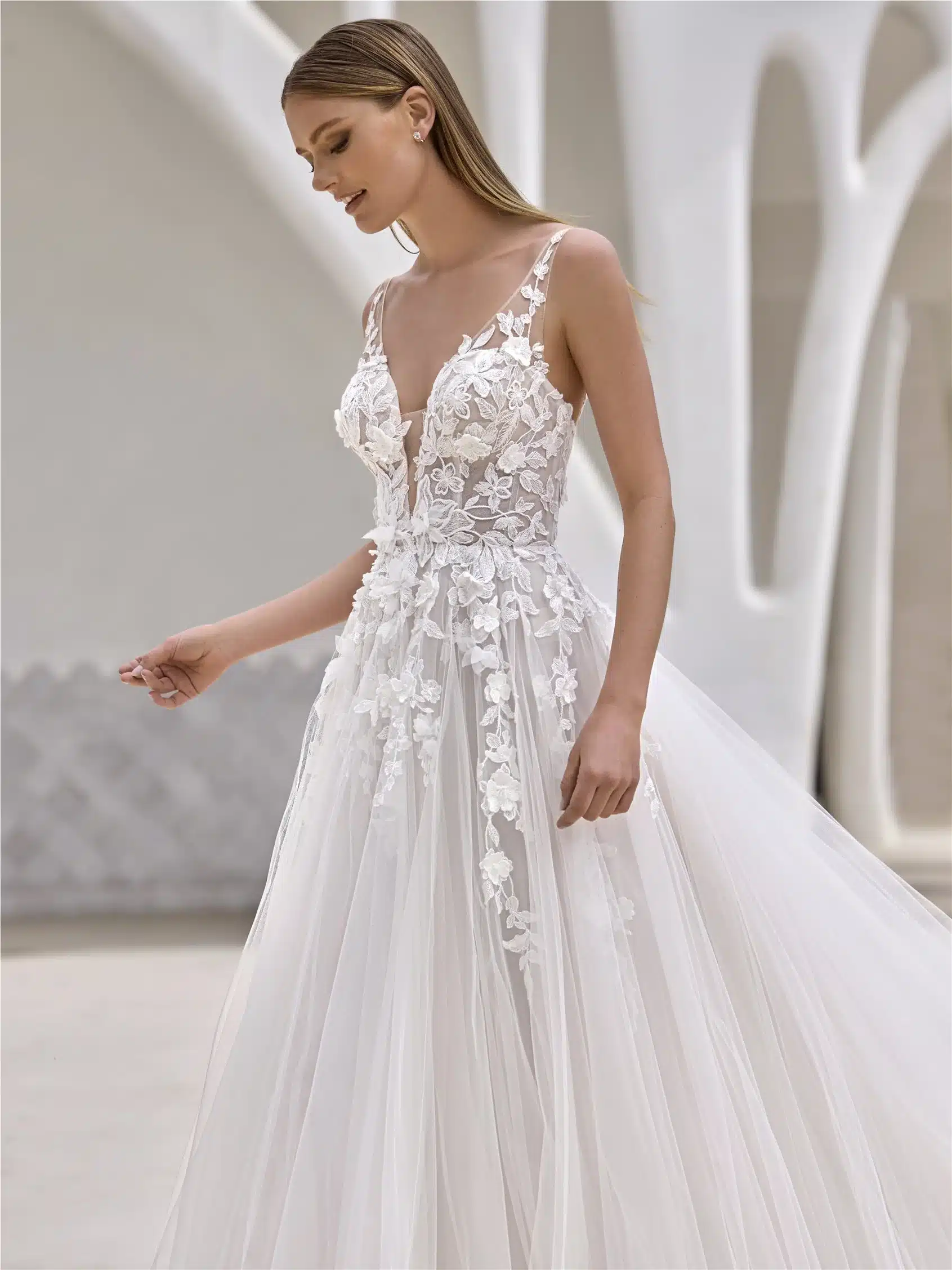 Dieses fließende A-Linien-Kleid mit V-Ausschnitt und V-Rücken gleitet natürlich und umhüllt die Figur mit Tüll und Spitze. Die Silhouette ist leicht und romantisch – perfekt für eine intime oder Outdoor-Hochzeit.