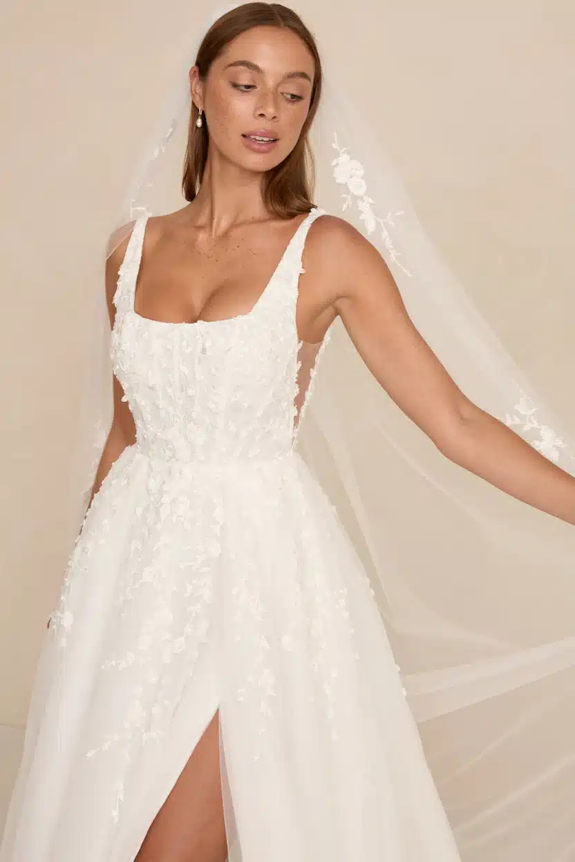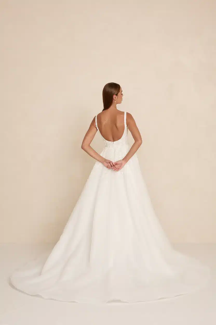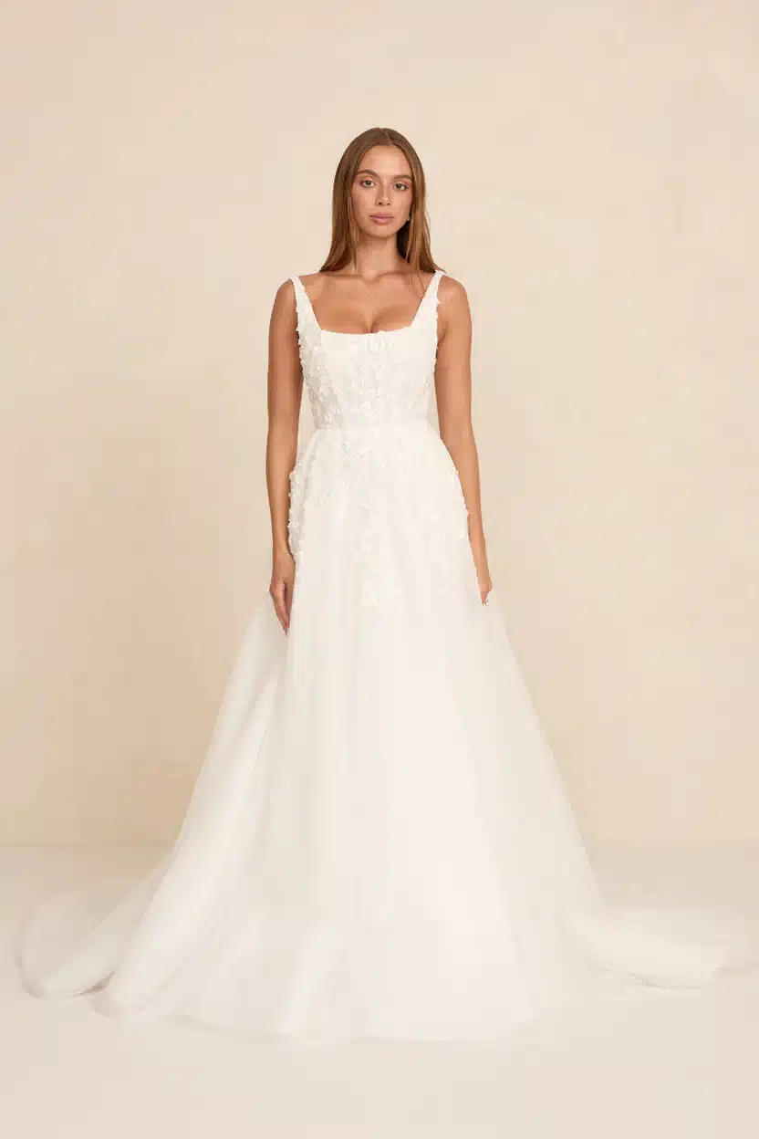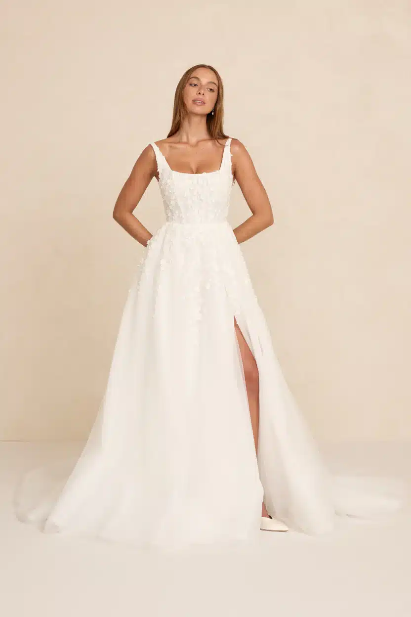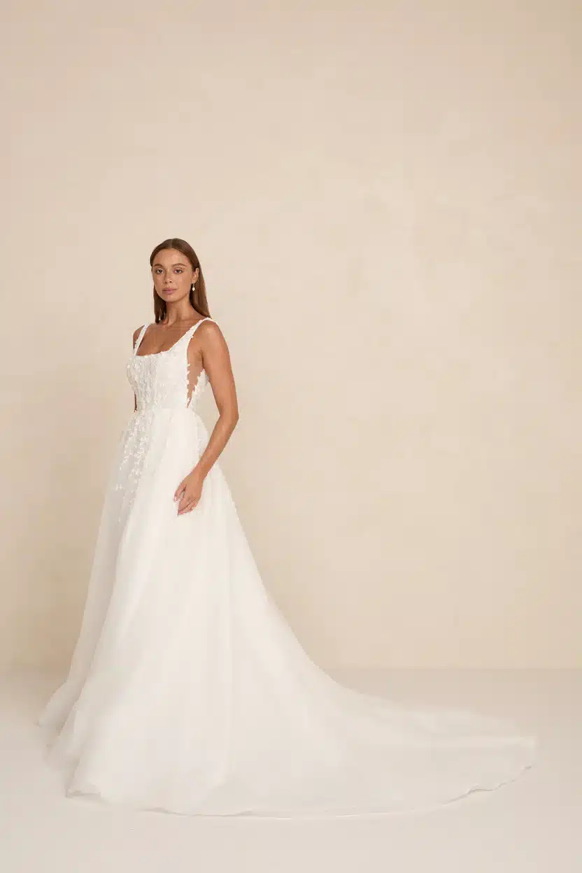 Das Modell „Zayn“ besticht durch einen modernen, eckigen Ausschnitt, seitliche Ausschnitte aus transparenter Tüllspitze und einen fließenden Rock, der sich mit müheloser Anmut bewegt. Es ist aus dreidimensionaler 3D-Spitze gefertigt und verbindet romantische Textur mit einer leichten, luftigen Silhouette. Das Modell ist mit zwei verschiedenen Rockvarianten erhältlich: einem Tüllrock und einem Faltenrock (bei uns im Store im Organza Faltenrock). Ein optionaler Rock-Schlitz verleiht dem Kleid zudem einen modernen Touch für Bräute, die einen Hauch von Drama lieben.