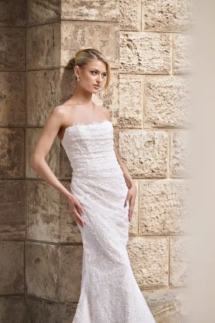 Dieses bezaubernde Meerjungfrauenkleid ist komplett mit schimmernder Spitze verziert und hat einen wunderschön gerüschten trägerlosen Ausschnitt. Die romantischen, abnehmbaren, schulterfreien Spitzenärmel ergänzen die elegante, körpernahe Silhouette perfekt.