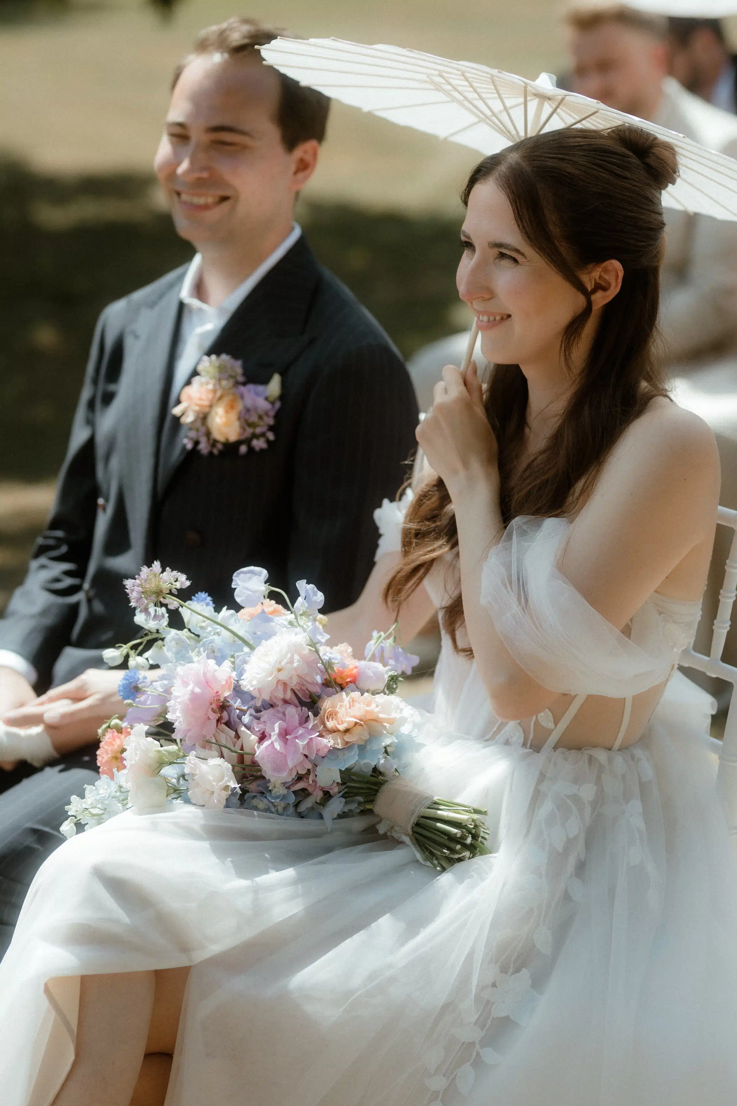 Summer wedding, pastellfarben (Blumen, Brautjungfern), märchenhaft/verspielt, freie Trauung im Grünen