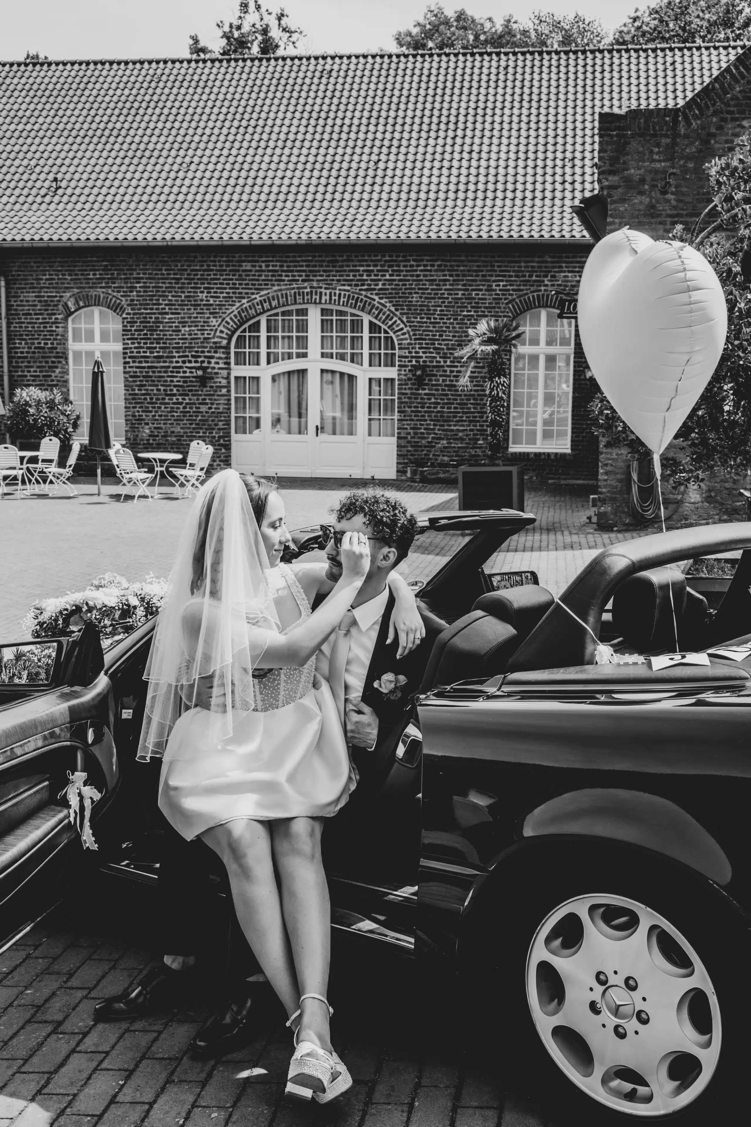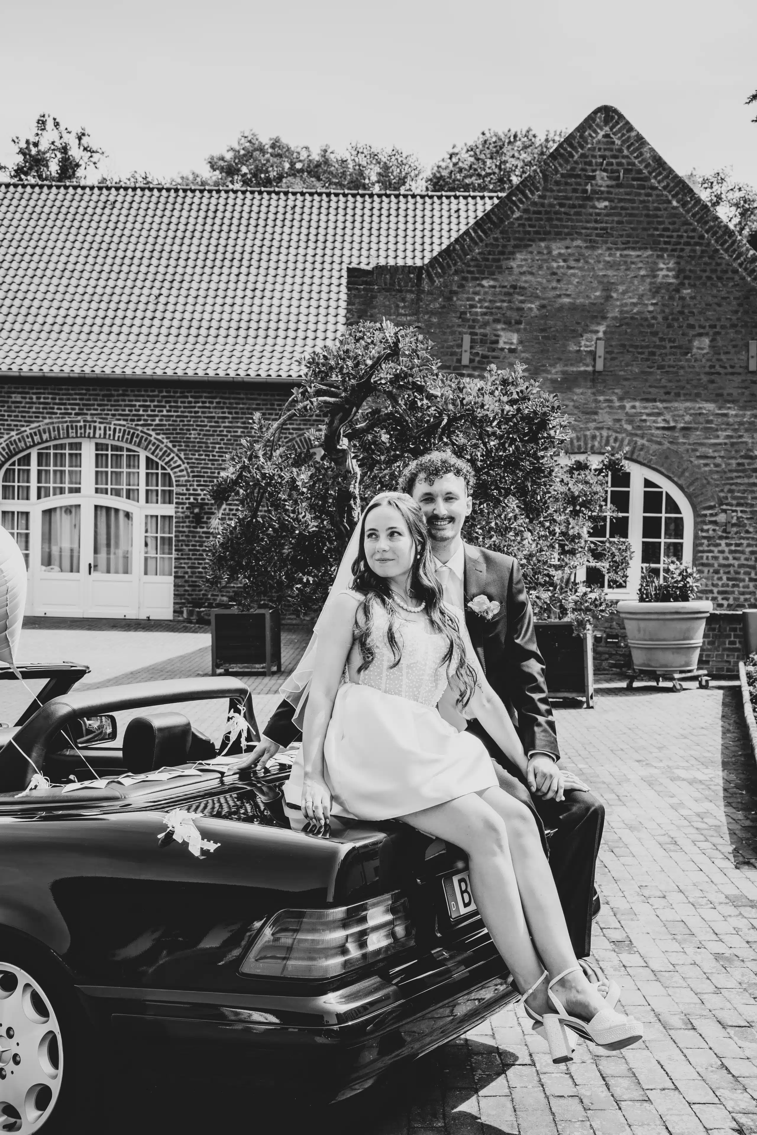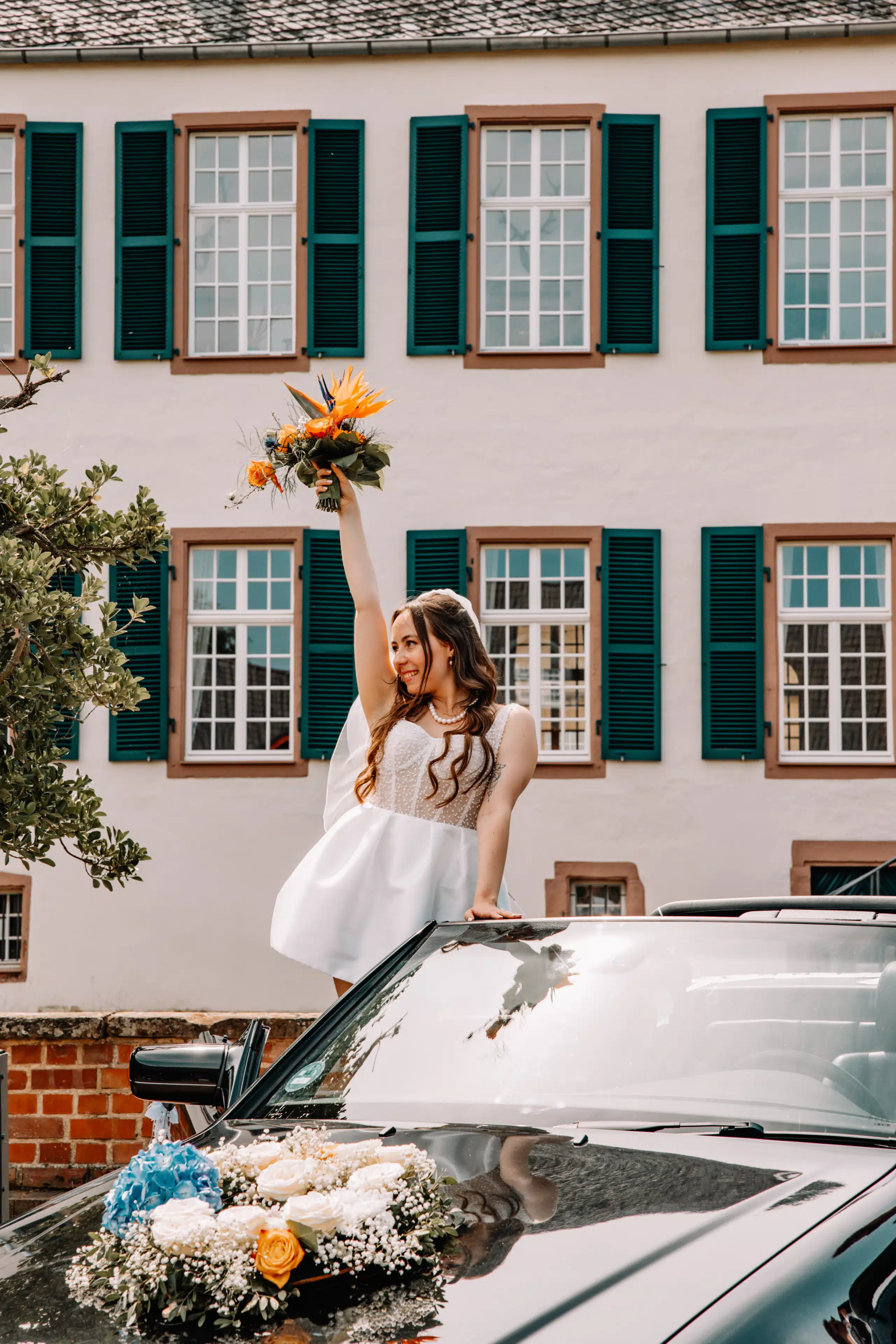 Unsere Hochzeit auf der Burg Heimerzheim war eine Mischung aus zeitloser Eleganz, romantischer Leichtigkeit und ganz persönlicher Nähe. Nach der Zeremonie stießen wir auf der sonnigen Gartenterrasse mit Blick über die Weite der Landschaft an – eine Stimmung wie bei einer sommerlichen Landpartie, elegant und entspannt zugleich. Anschließend hatten wir ein Shooting mit einem Oldtimer-Cabrio, was dem Tag etwas Nostalgie verlieh.