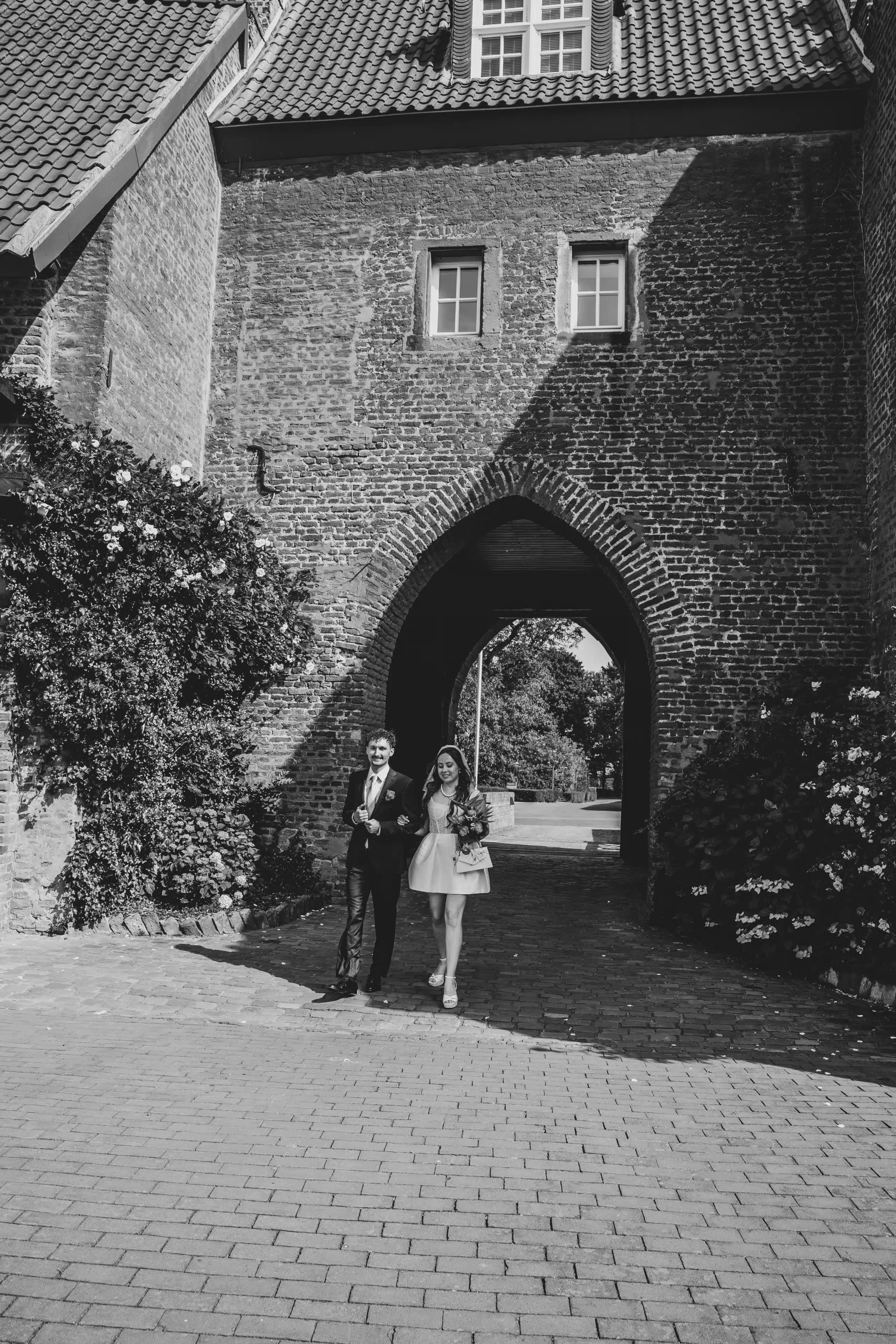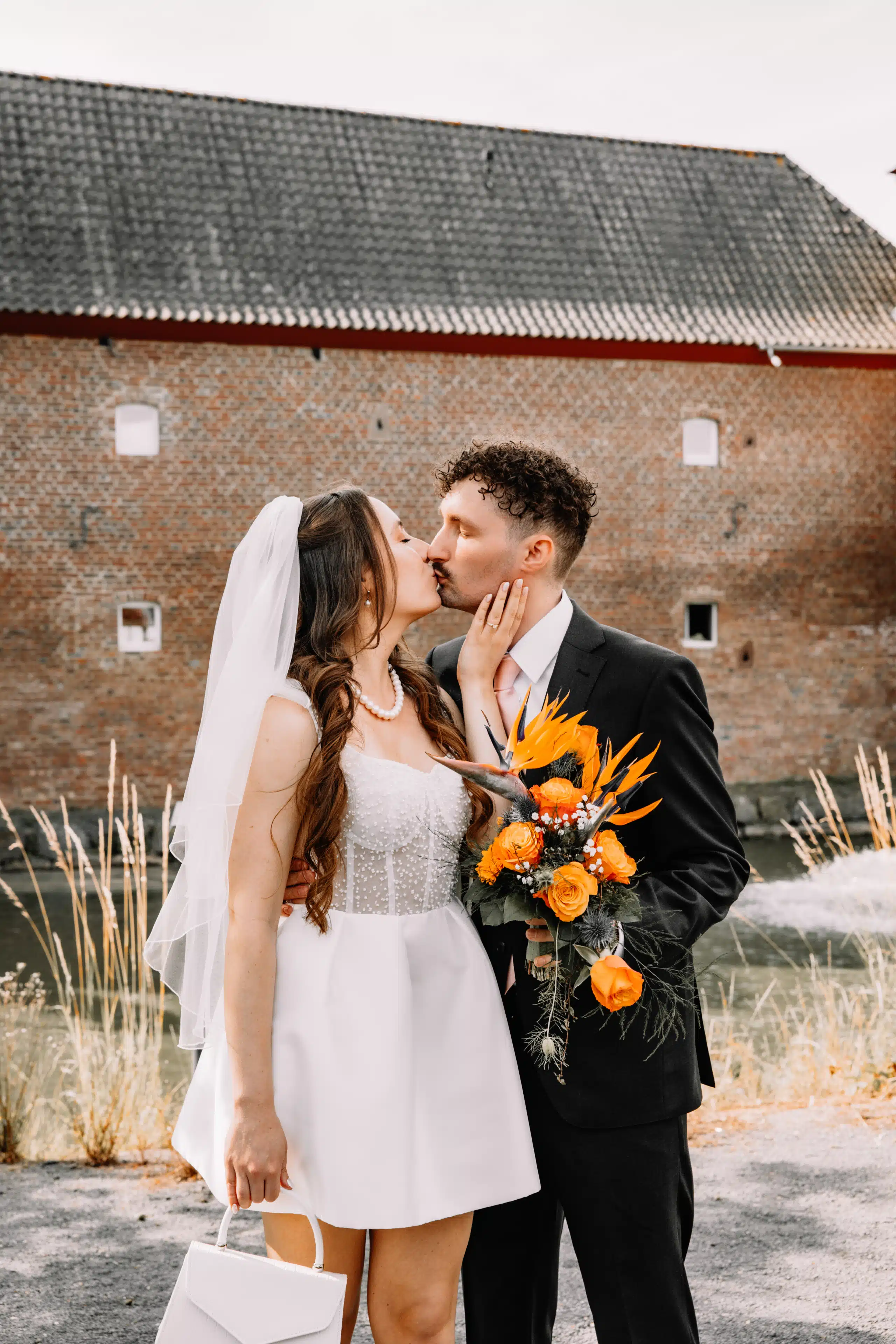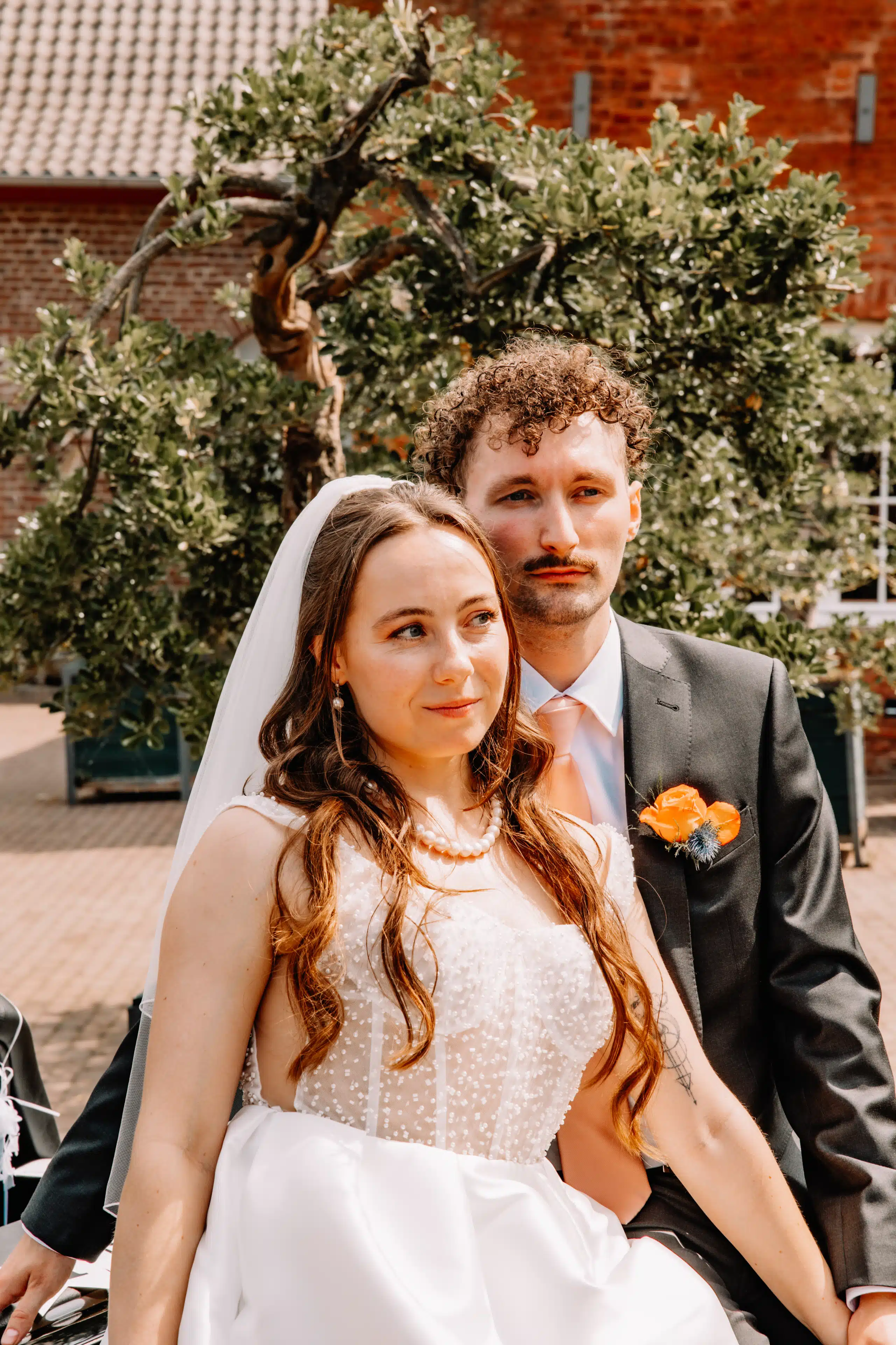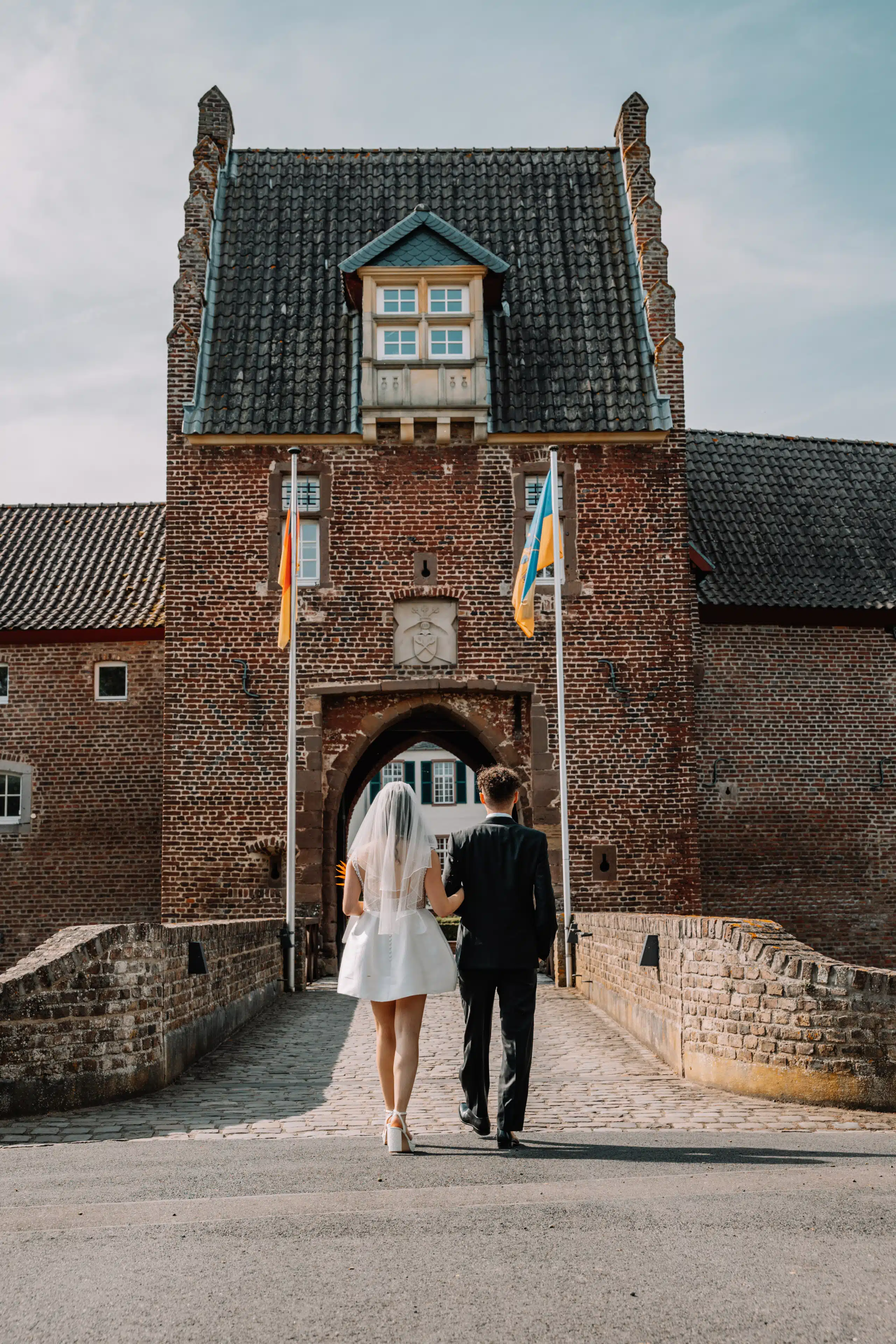 Unsere Hochzeit auf der Burg Heimerzheim war eine Mischung aus zeitloser Eleganz, romantischer Leichtigkeit und ganz persönlicher Nähe. Nach der Zeremonie stießen wir auf der sonnigen Gartenterrasse mit Blick über die Weite der Landschaft an – eine Stimmung wie bei einer sommerlichen Landpartie, elegant und entspannt zugleich. Anschließend hatten wir ein Shooting mit einem Oldtimer-Cabrio, was dem Tag etwas Nostalgie verlieh.